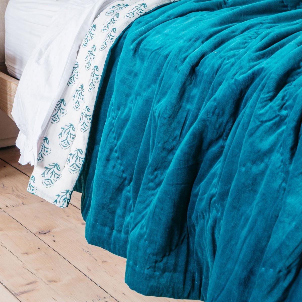 Our velvet quilts are luxurious and decadent. The quilted peacock blue velvet is soft to touch and showcases a printed cotton reverse that has been embellished with a hand-blocked print inspired by floral Indian patterns. King Size (MJC1439): L240 x W220cm. Super King Size (MEO1003): L270 x W220cm. Quilted cotton velvet with a printed cotton reverse. We recommend dry clean only. Due to the handmade nature of this product, the exact size, colour and pattern may vary. The shade of the velvet colour may vary slightly, dependent on lighting.