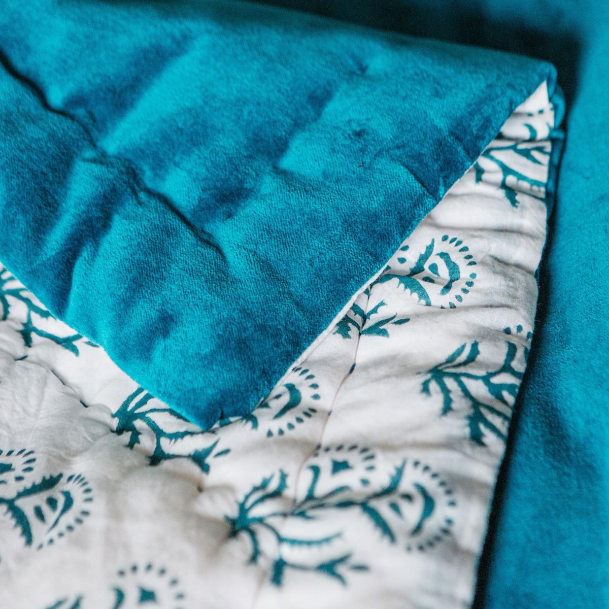 Peacock Blue Velvet Super King Size Quilt with Printed Reverse