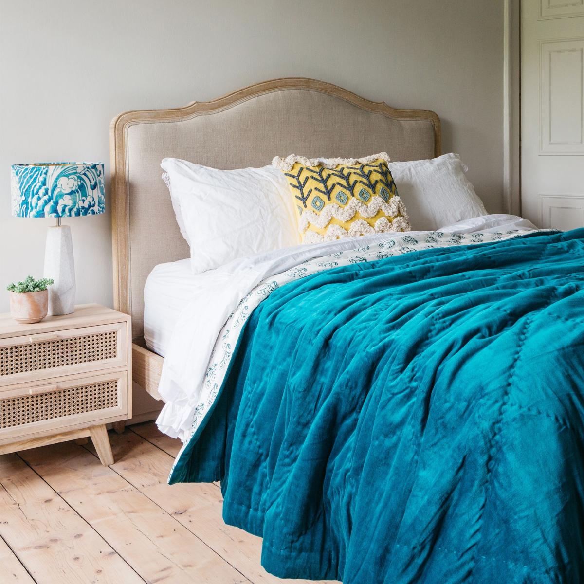 I love this peacock blue velvet quilt for adding rich colour and texture to both classic and contemporary bedrooms. Its luxurious velvet finish makes it a statement piece that works well in interiors with neutral tones or layered with patterned cushions for a more eclectic look. Practical styling tips include pairing it with crisp white bedding and textured throws to balance the depth of the blue. For varied aesthetics, you can switch up the printed reverse with different colour schemes or patterns, making it versatile across seasonal updates. It’s perfect for creating a cosy, inviting feel while elevating the overall design of your sleep space.