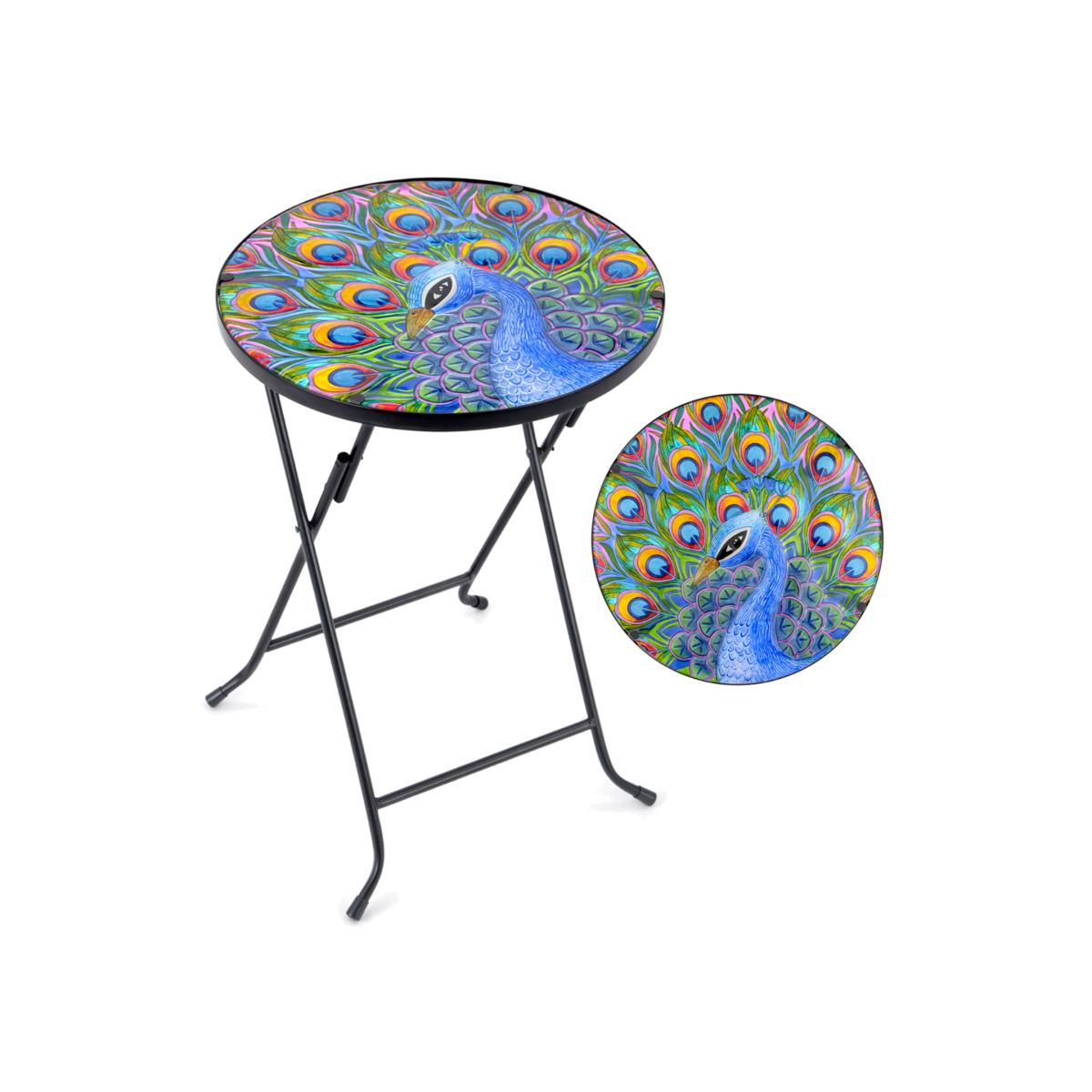 Add a splash of colour to your patio with this gorgeous glass garden table. The table features folding legs for easy storage and a hand-painted textured glass top. Its a perfect size for placing snacks, drinks, and a good book when youre relaxing in the sunshine. The tabletop has a diameter of 35cm and comes painted with a choice of designs, including a peacock and poppies. Because its made from glass, it catches the sunlight to stunning effect to create a beautiful garden feature. The paint is also UV-resistant to stop it fading in the sun. The table legs are made from heavy-duty steel with a black powder-coating for enhanced rust-resistance. Theyre also intricately curved at the bottom for a stylish, attractive finish. Non-slip feet allow you to display the table on a variety of surfaces, including a lawn, patio, or decking.