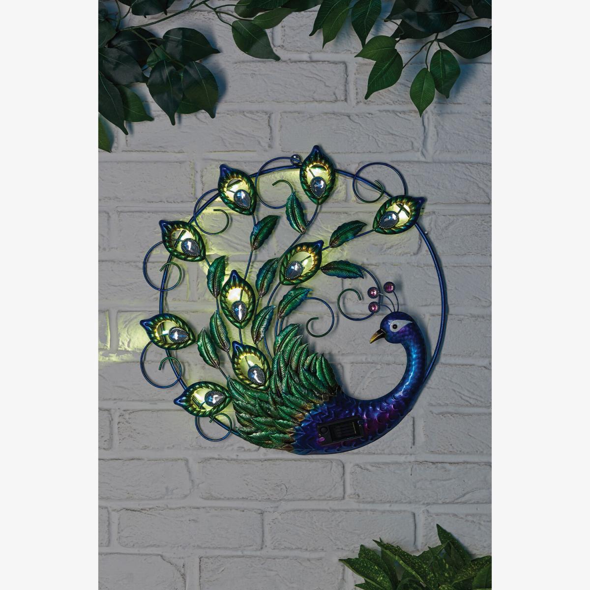 A truly spectacular piece for the wall of your garden or patio, this beautifully crafted Peacock Solar Wall Art will light up your outdoor space with a warm glow. Made with deep purples, greens, and blues for an authentic peacock design, this light is finished with elegant jewelled elements. This light soaks up energy during the day to leave you with a whimsical garden by night.