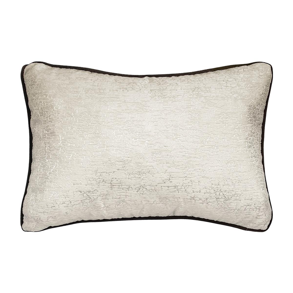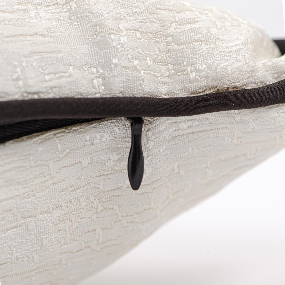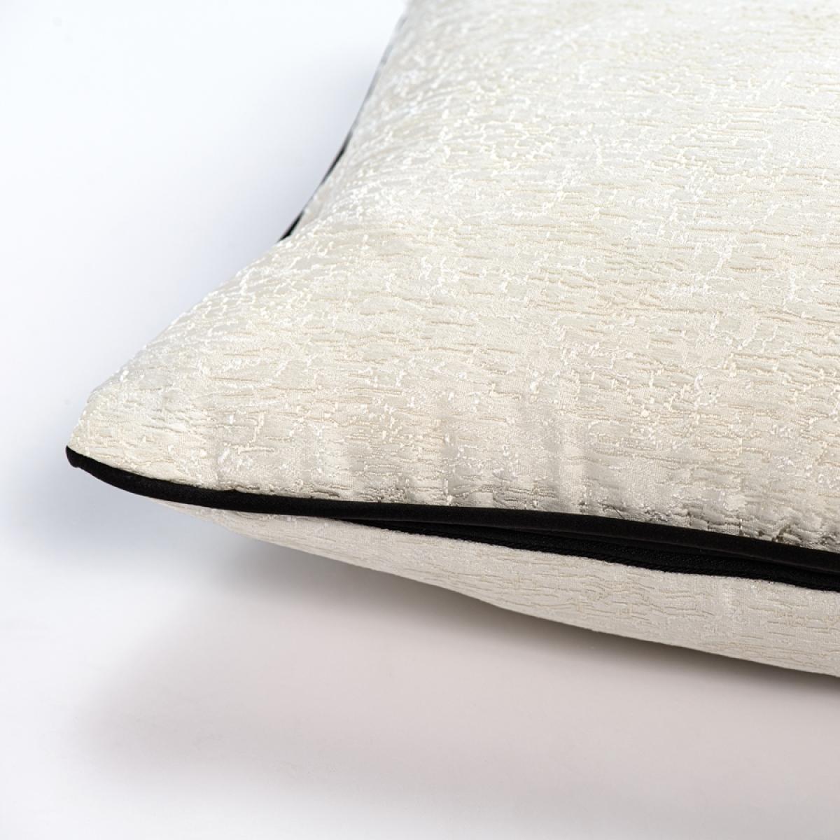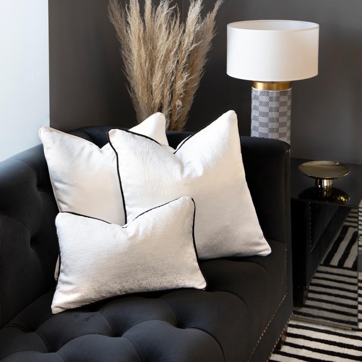 45cm x 30cm piped cushion with luxurious feather filling. High quality polyester fabric with shimmering woven texture. Black piping and ‘Invisible’ zip fastening. Hand crafted in the UK by couture tailors. Exclusive design. Dry clean only, do not bleach or tumble dry.