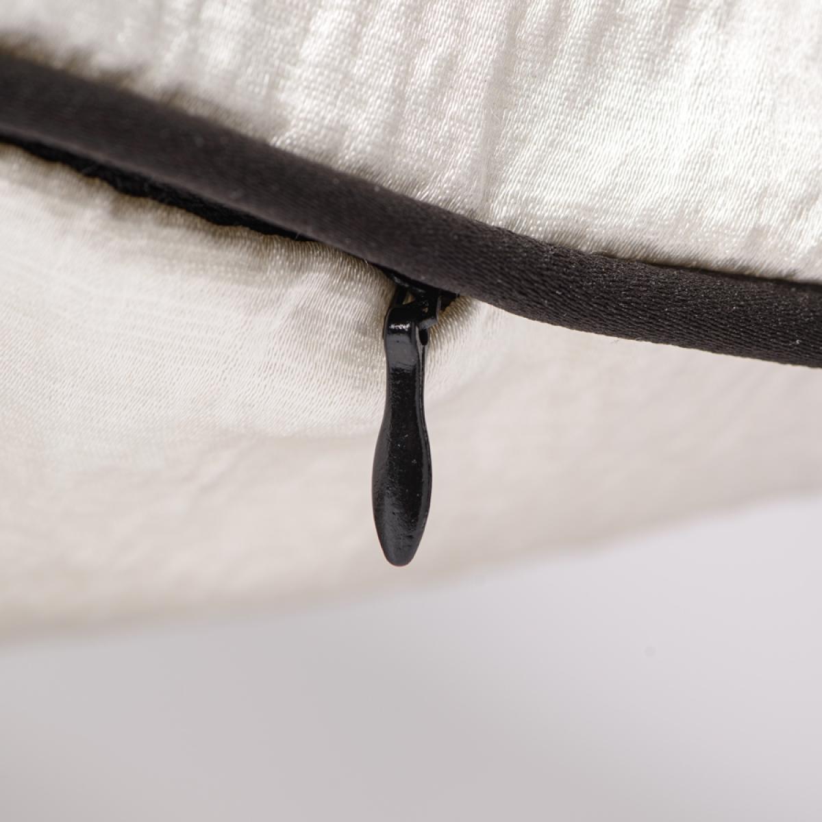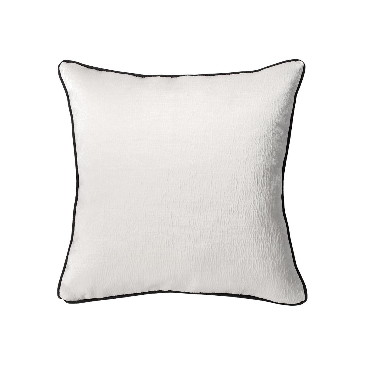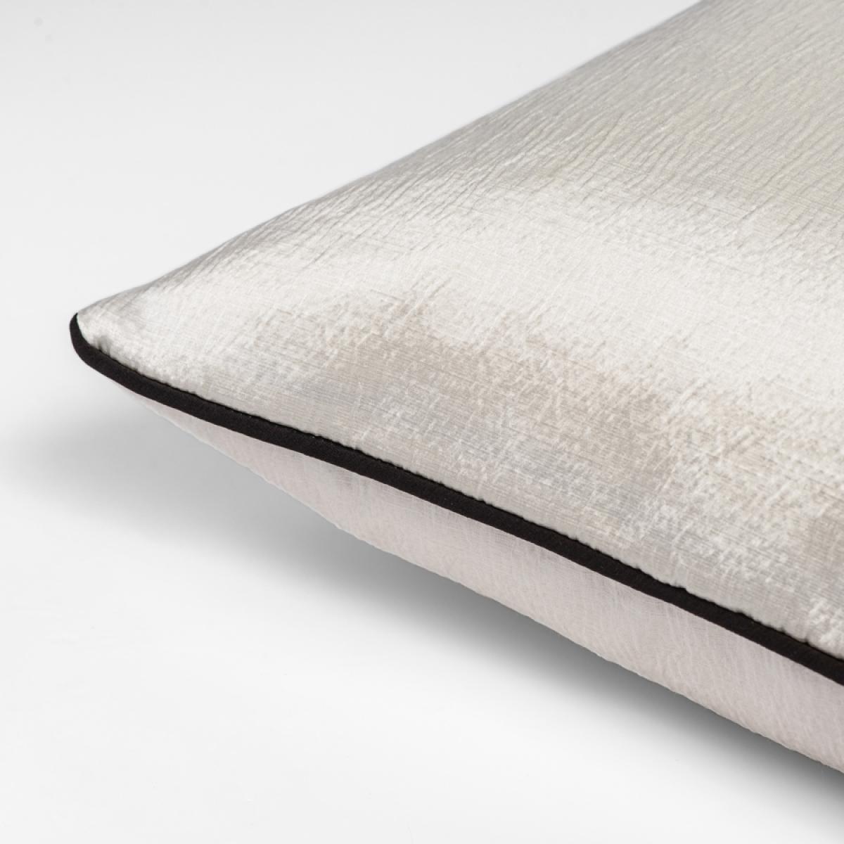 50cm x 50cm piped cushion with luxurious feather filling. High quality polycotton fabric with shimmering woven texture. Black piping and ‘Invisible’ zip fastening. Hand crafted in the UK by couture tailors. Exclusive design. Dry clean only, do not bleach or tumble dry.