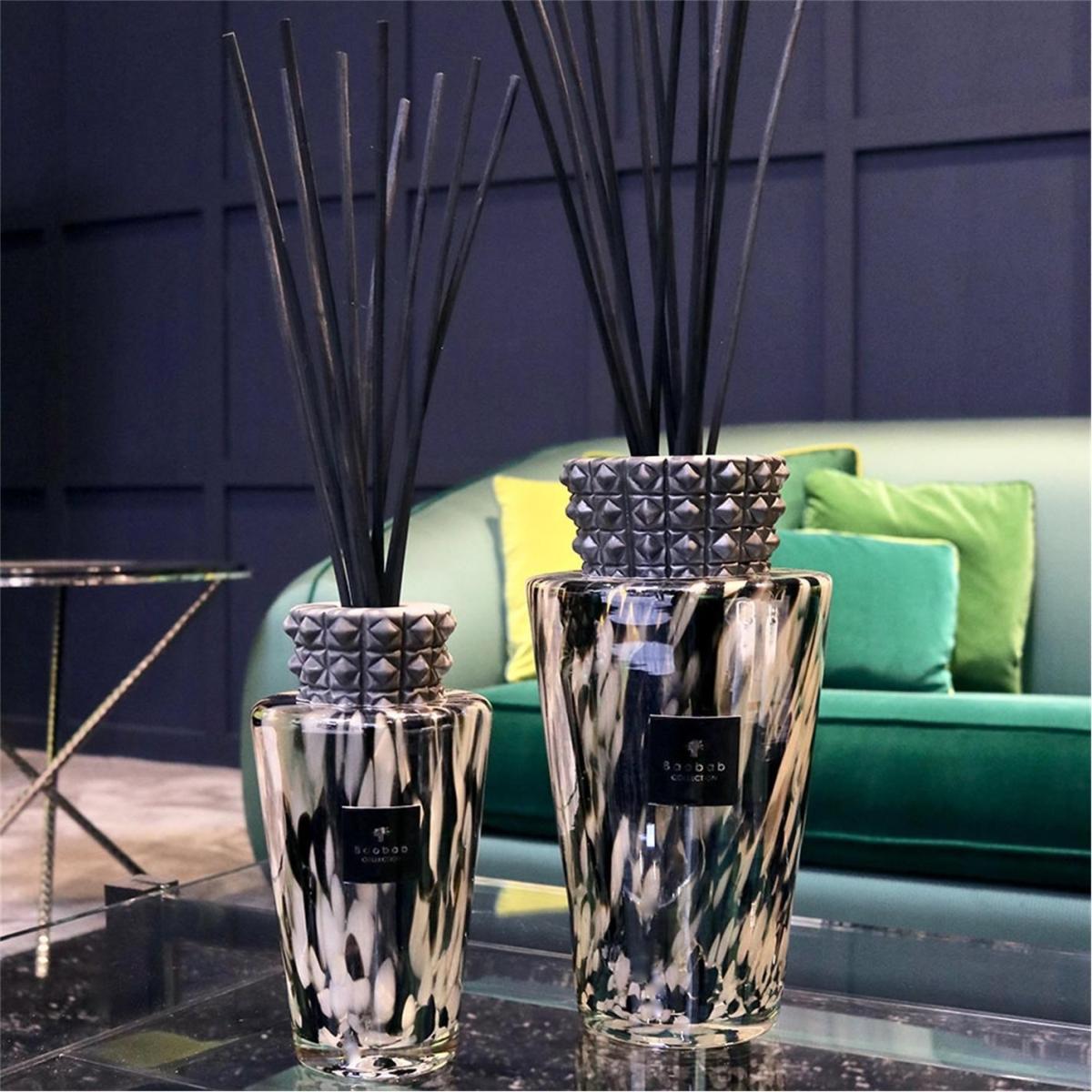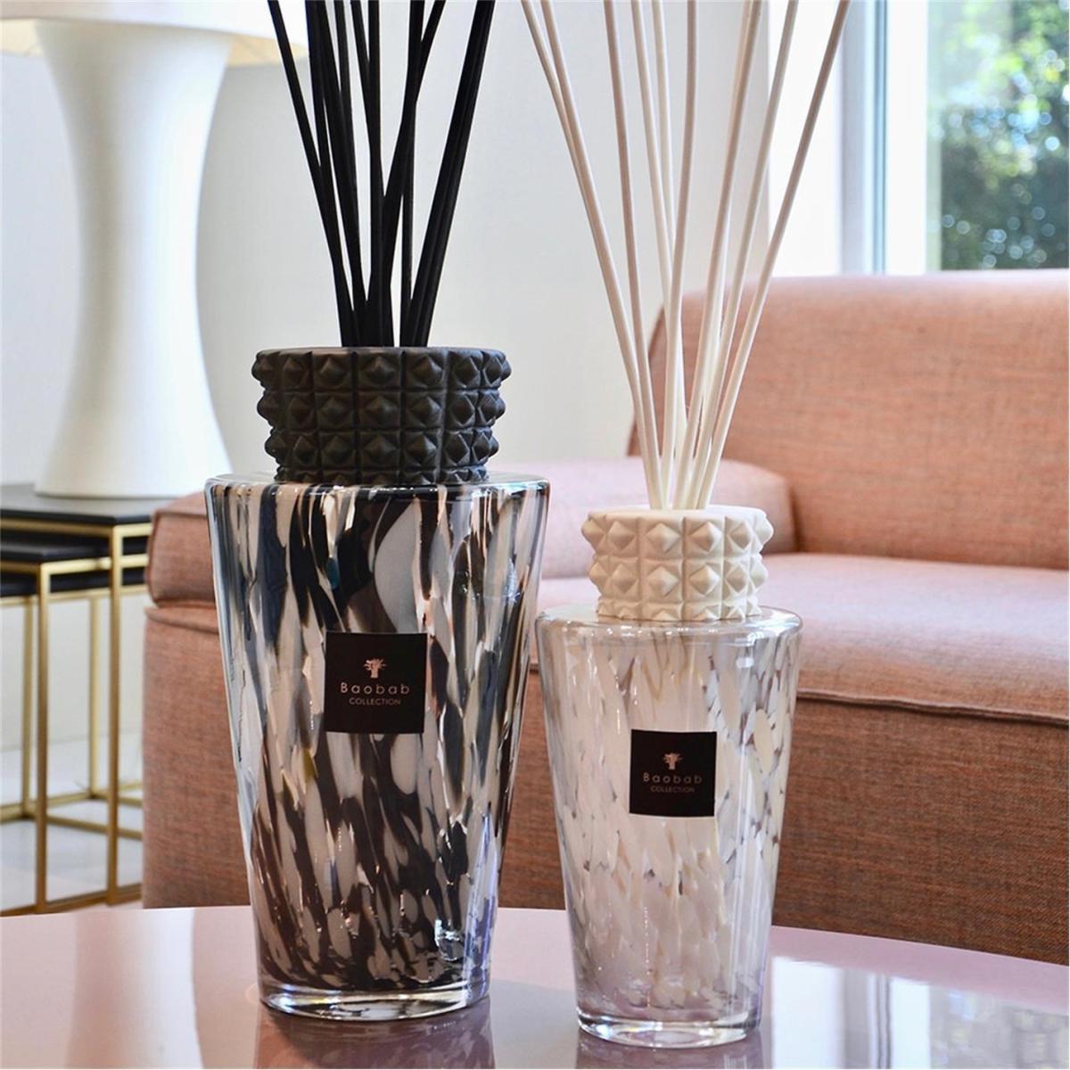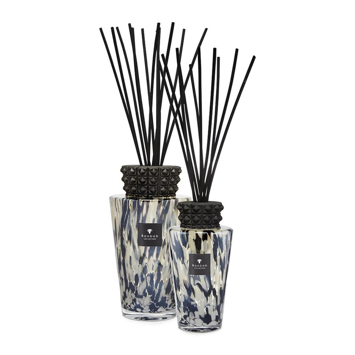 Entrance your guests with this Black Pearls diffuser from Baobab Collection. In a new larger size, this diffuser will perfume a larger space in the home for months to come. Filled with spicy notes of black rose and ginger, the handmade glass vessel is flecked with black and each one is entirely unique. With black rattan reeds included, the vessel arrived empty along with fragrance refill bottles for you to fill the vessel to your desired level.