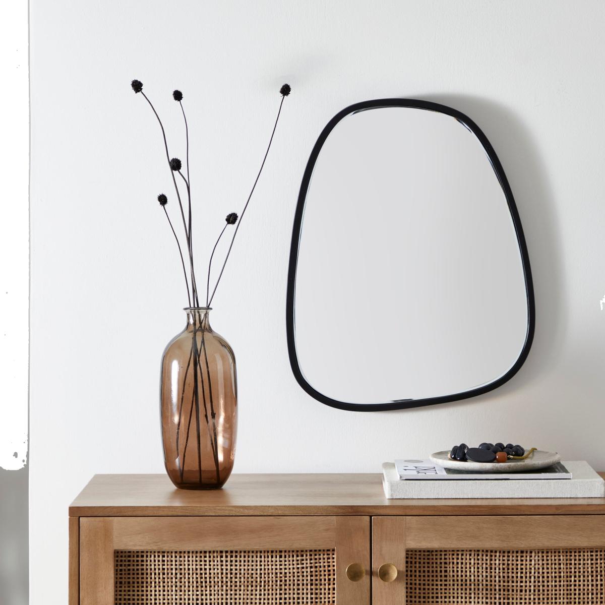 This pebble-inspired mirror is a versatile addition that works particularly well in modern or minimalist interiors. Its understated black frame with a hint of metallic silver adds a subtle touch of sophistication without overpowering the space. I love how it can serve as a statement piece in an entryway or above a console table, providing both function and style. For styling tips, consider pairing it with warm wood tones or contrasting it against soft neutral walls to make the mirror stand out. It also looks great in smaller spaces, where its irregular shape adds visual interest without crowding the area. Overall, it’s a stylish, practical choice for anyone looking to add a contemporary touch to their interior.