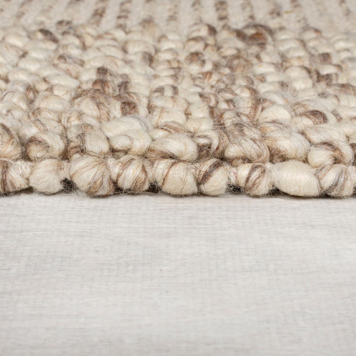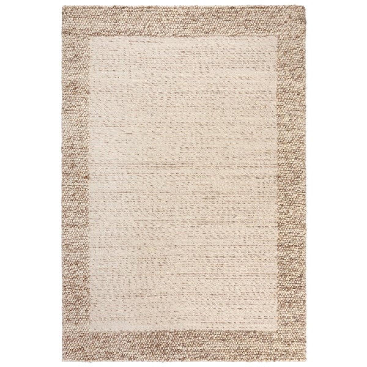 Hand-woven by rug artisans in India, the Pebble Border Wool Rug pairs a bobbled-effect with semi-plain border detailing, for a subtle and stylish finish to your flooring. In 70% wool the Pebble Border Wool rug is naturally sound and warmth insulating, perfect for those darker months. Try this design in a bedroom or living room for under-foot comfort. Rug pictured is 160cm x 230cm. This is a hand-made flatweave rug. When opening, re-roll your rug pile out and leave in a warm room for 24 hours before putting in place, this will help to reduce wrinkles and curling from packing. Do not pull any loose threads, please cut them carefully with scissors to remove. Avoid prolonged exposure to direct sunlight as this may cause fading of the colour. Turn your rug regularly to ensure even wear and to reduce pressure marks from furniture. Wool fibres may shed when new and during use, this is a characteristic of this product and is not a defect and should reduce with normal use and regular vacuuming. Before using any cleaning products on your rug, test on an inconspicuous area first to ensure it does not affect the colour. Clean spills immediately by blotting with a clean dry white cloth - do not rub as this may stain the fibres. Vacuum your rug regularly to remove everyday dirt, we recommend the use of a suction type vacuum cleaner as a rotating vacuum brush can cause damage to the pile surface. We recommend the use of an anti-slip mat beneath your rug to prevent it from slipping and sliding out of place. Latex is used on the back of this rug. Please do not leave babies or young children unsupervised on this rug.