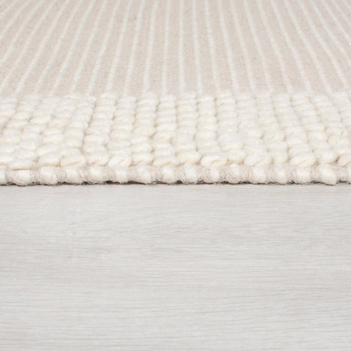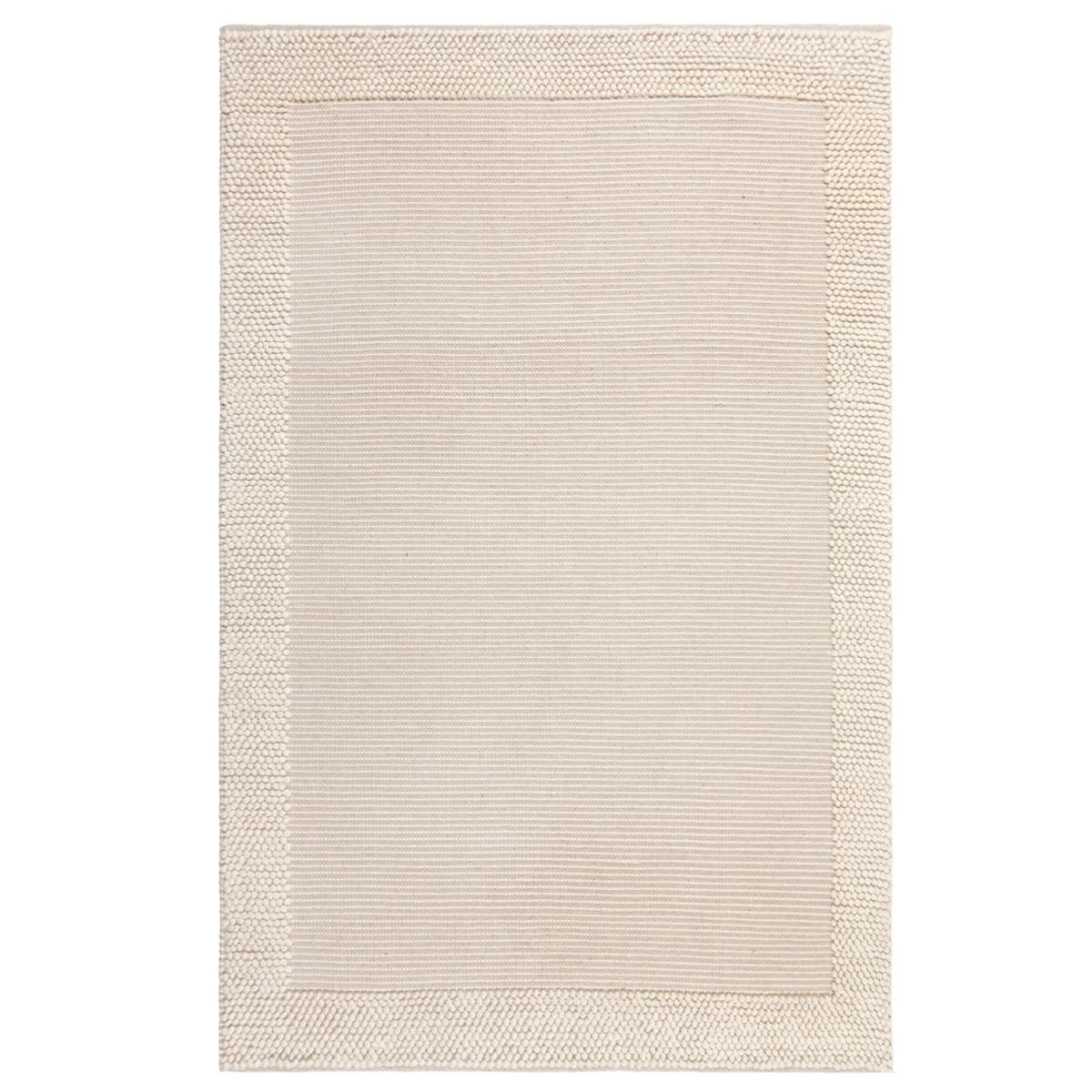 Hand-woven by rug artisans in India, the Pebble Border Wool Rug pairs a bobbled-effect with semi-plain border detailing, for a subtle and stylish finish to your flooring. In 70% wool the Pebble Border Wool rug is naturally sound and warmth insulating, perfect for those darker months. Try this design in a bedroom or living room for under-foot comfort. This is a hand-made flatweave rug. When opening, re-roll your rug pile out and leave in a warm room for 24 hours before putting in place, this will help to reduce wrinkles and curling from packing. Do not pull any loose threads, please cut them carefully with scissors to remove. Avoid prolonged exposure to direct sunlight as this may cause fading of the colour. Turn your rug regularly to ensure even wear and to reduce pressure marks from furniture. Wool fibres may shed when new and during use, this is a characteristic of this product and is not a defect and should reduce with normal use and regular vacuuming. Before using any cleaning products on your rug, test on an inconspicuous area first to ensure it does not affect the colour. Clean spills immediately by blotting with a clean dry white cloth - do not rub as this may stain the fibres. Vacuum your rug regularly to remove everyday dirt, we recommend the use of a suction type vacuum cleaner as a rotating vacuum brush can cause damage to the pile surface. We recommend the use of an anti-slip mat beneath your rug to prevent it from slipping and sliding out of place. Latex is used on the back of this rug. Please do not leave babies or young children unsupervised on this rug.