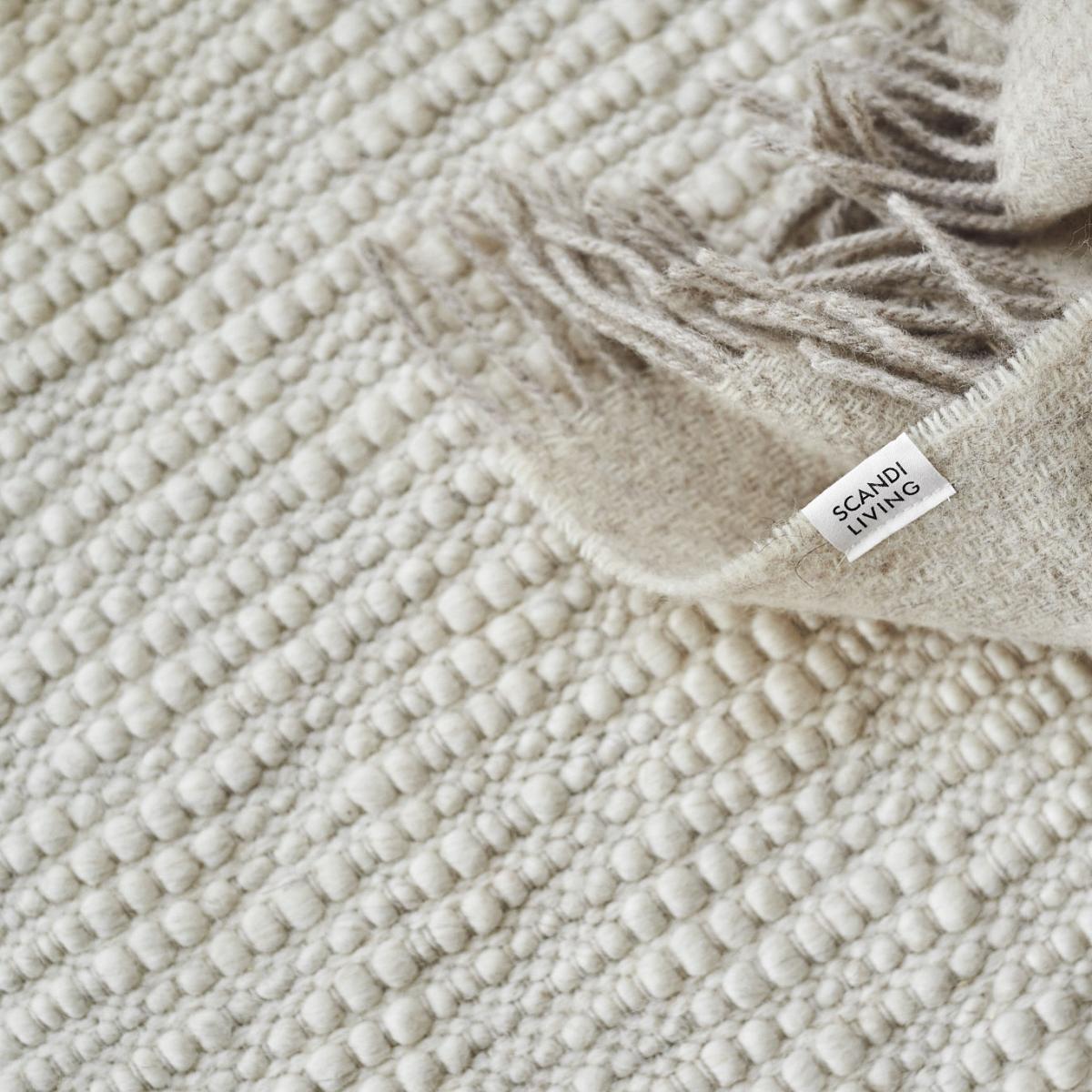 Pebble wool rug, white by Scandi Living is a solid natural white rug made from wool. Thanks to the special weaving technique the surface of the carpet is reminiscent of pebbles on the beach, hence the name. The wool yarn varies in thickness, which gives an irregular but dynamic appearance to the carpet. The Pebble wool rug fits just as well in the living room, as in the hall. The neutral color of the carpet means that it fits into most homes and interior styles while the structured surface gives the carpet character.