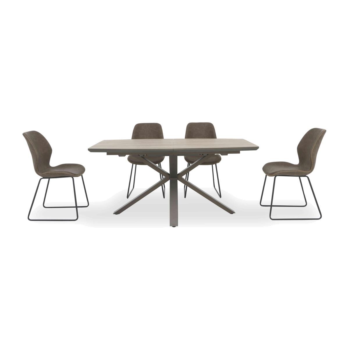 The Pedro range of dining sets, dining room furniture and living room tables gets everything right. You’ll find high-quality craftsmanship at a great-value price, as well as superb contemporary style that’s also easy to care for and very hardwearing. Statement details – like innovative table extension mechanisms, bold metal table bases and swivel dining chairs – have ergonomic and practical purposes, like saving space in a smaller dining room. And you’ll also enjoy plenty of choice when it comes to dining table styles and sizes alongside the convenience of ready-made dining sets. Online only at Furniture Village. It’s the details that make this dining set so stylish. The extending dining table has a very striking base design and the faux leather dining chairs have very cool ski legs. Great price too. Why you'll love it Relaxed contemporary dining style at an incredible price. Boat-shaped dining table extends to seat 8 – the extra leaf is hidden inside. In an ever-fashionable oak-effect and dark grey metal finish. Striking leg design makes a statement. Hardwearing table top is scratch-resistant, chip-resistant and heat-resistant. Ideal for everyday dining as it’s so easy to clean. This stylish dining set includes 4 ski leg dining chairs. Stylish curved and cushioned seats are exceptionally comfortable. Soft faux leather upholstery in a choice of colours. Online only – you won’t find this dining set in our stores. This extending dining set is part of the Pedro range. What you need to know Dining chairs have metal frames and legs and foam cushioning. Dining table seats 6 closed and extends to seat 8. Please note that the table top is not 100% heatproof. We recommend using coasters and placemats at all times. Explore the Pedro range for a huge choice of stylish furniture for living and dining.
