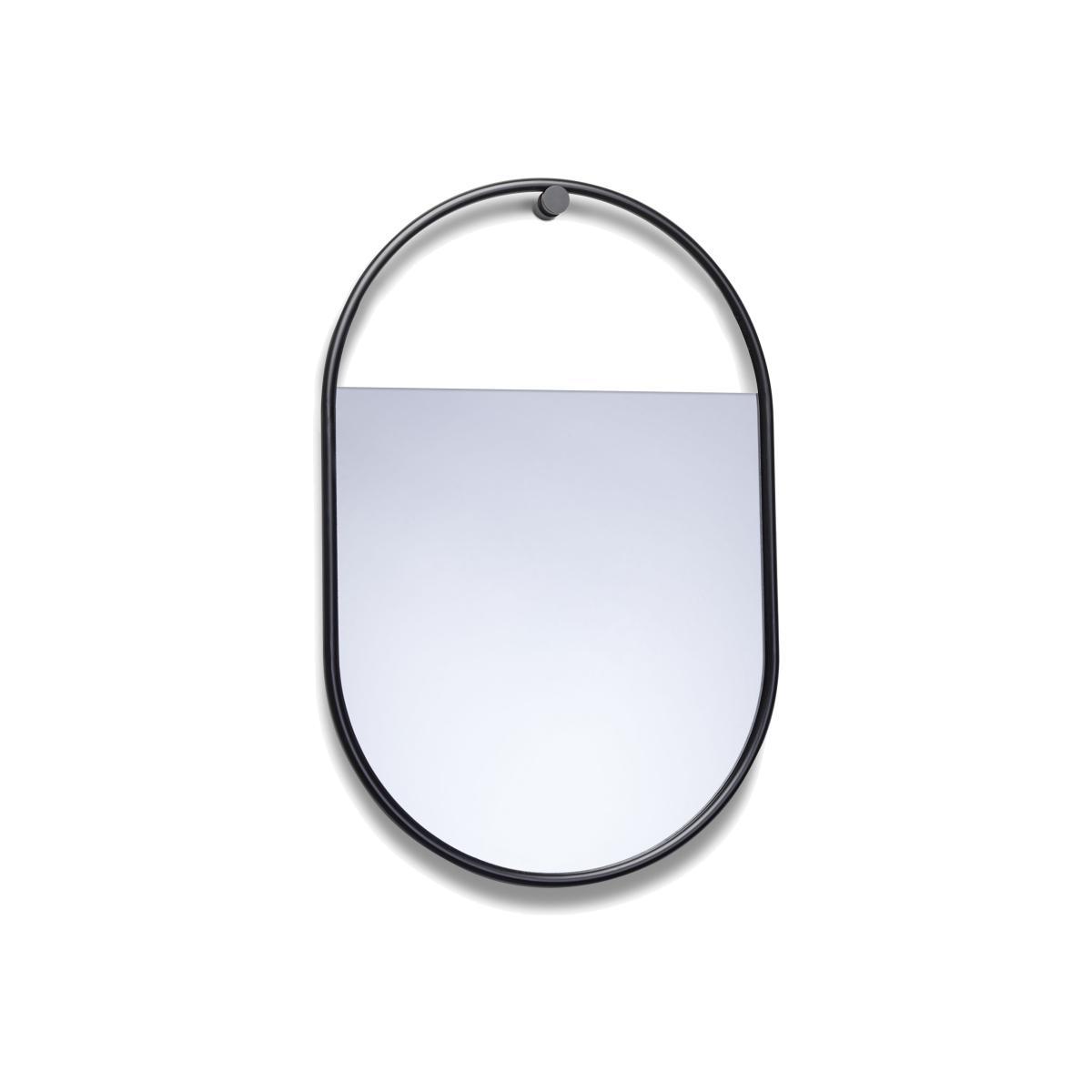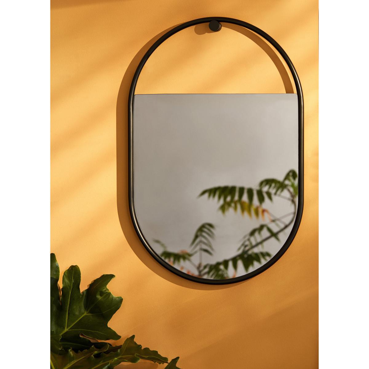 The Peek mirror stands out for its simple yet graphic lines. It’s encircled by a tubular structure in matt black metal, which forms a clean outline. The glass mirror with its “cut” shape creates an empty space and shows the wall behind. This minimalist construction of two interwoven shapes has a strong visual impact. The silver-tinted glass captures ambient light and softens reflections. This mirror comes with a metal wall hook, matching the frame to fix it to the wall. You can also choose to fix the mirror to the wall with invisible screws. The oval mirror can be positioned vertically or horizontally.