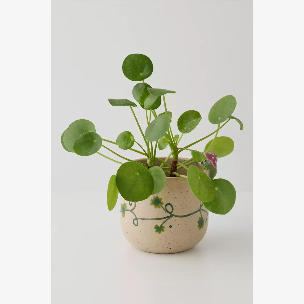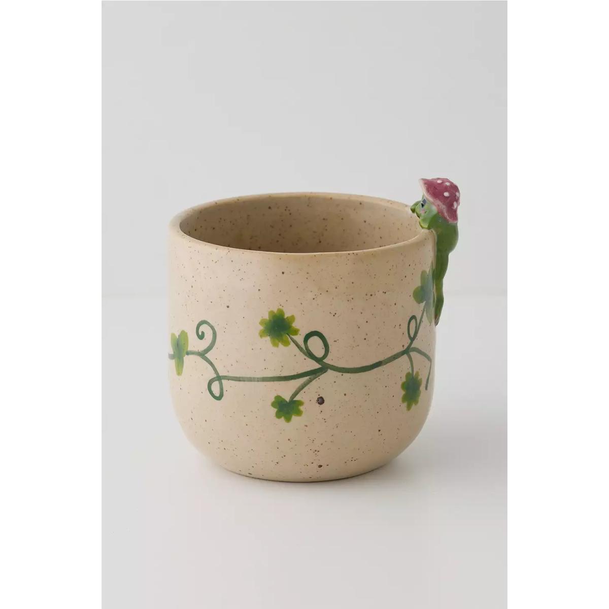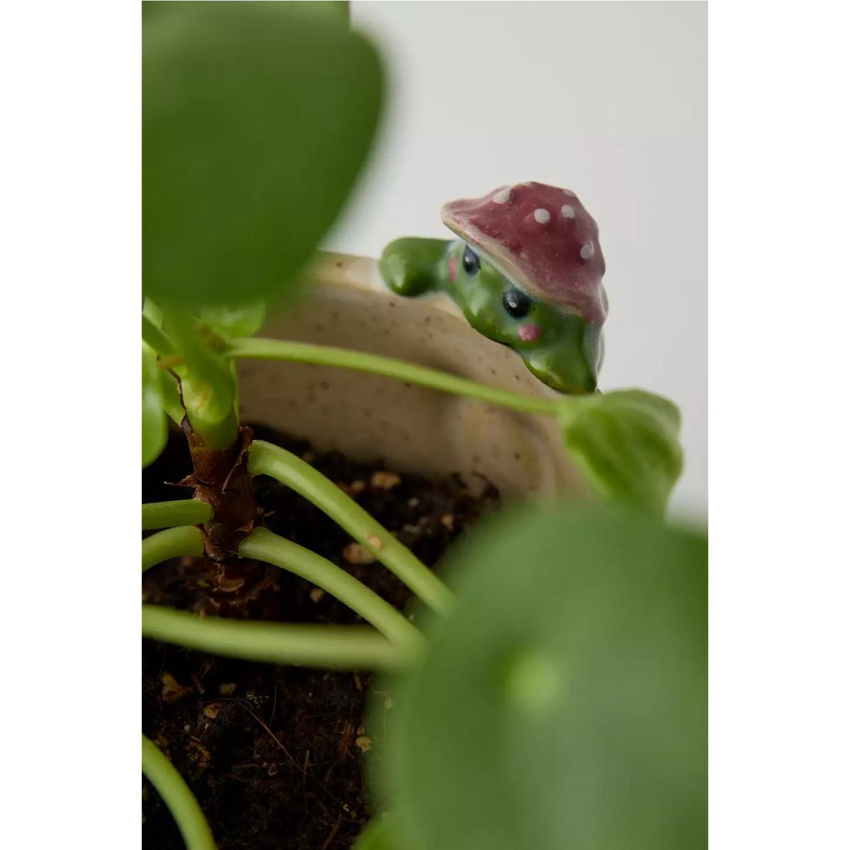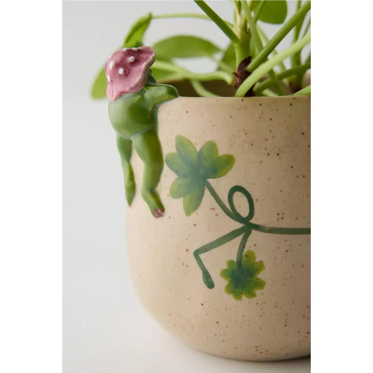 The most adorable planter featuring a sculpted peeking frog to the side with a little mushroom hat on. Ceramic plant pot with a floral design. **Content + Care** \- 100% Stoneware- Wipe clean