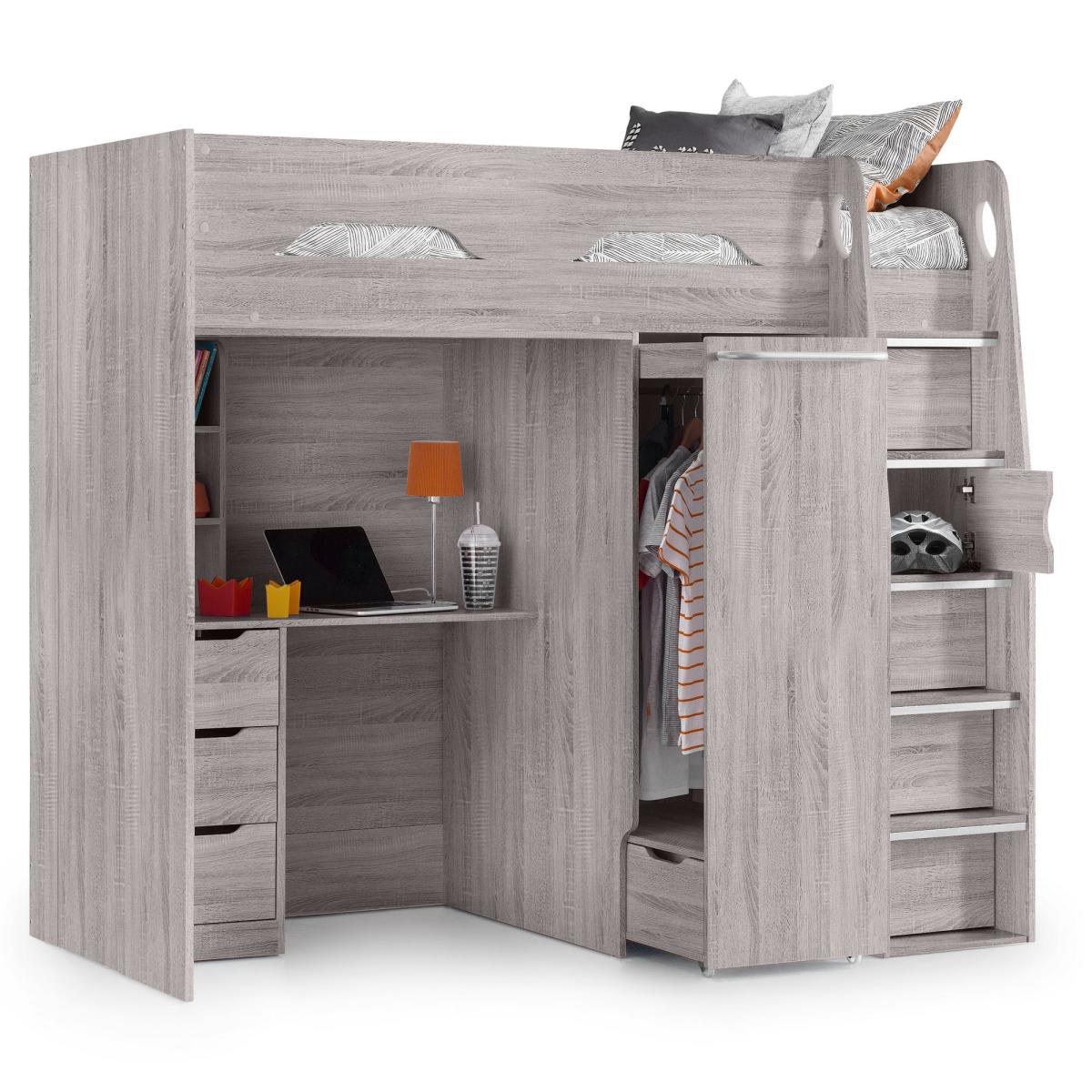 With an integrated wardrobe and desk, the Pegasus High Sleeper is the ultimate in functional bedroom furniture for kids and teenagers. The pull-out wardrobe contains a handy storage drawer which maximizes the space available within its compact build, whilst the desk includes further storage drawers and cable holes. The robust ladder contains hidden storage cupboards at every step. Please note: Price is for bed frame only and does not include mattress. Mattress depth should not exceed 15cm (6 inches). Suitable for ages 6 years and over. Please note, unfortunately, we cannot deliver this item to the Channel Islands.
