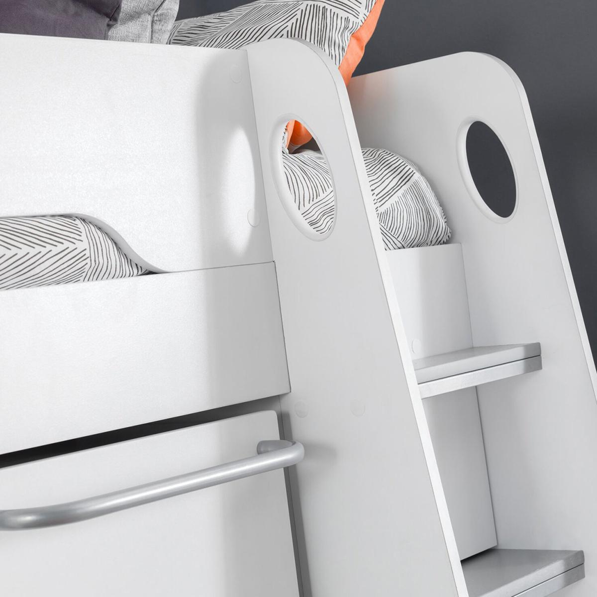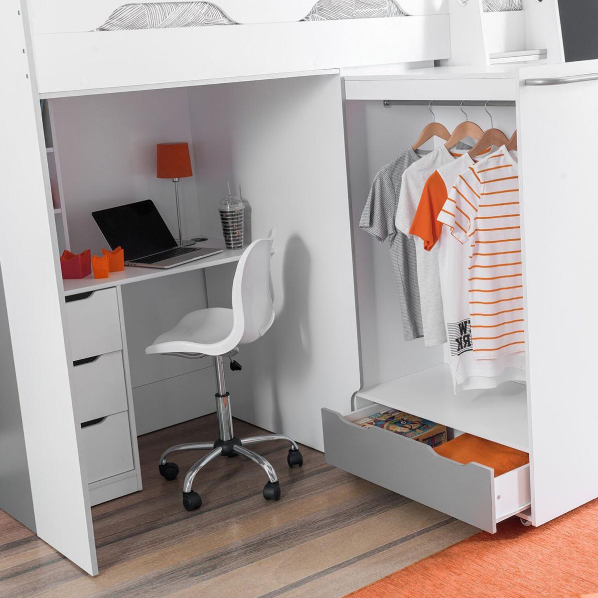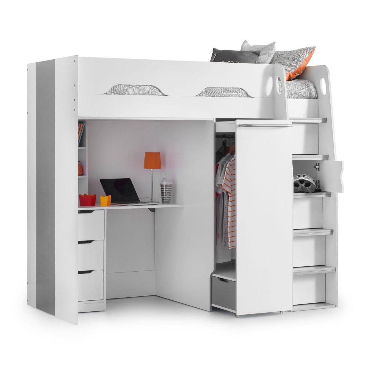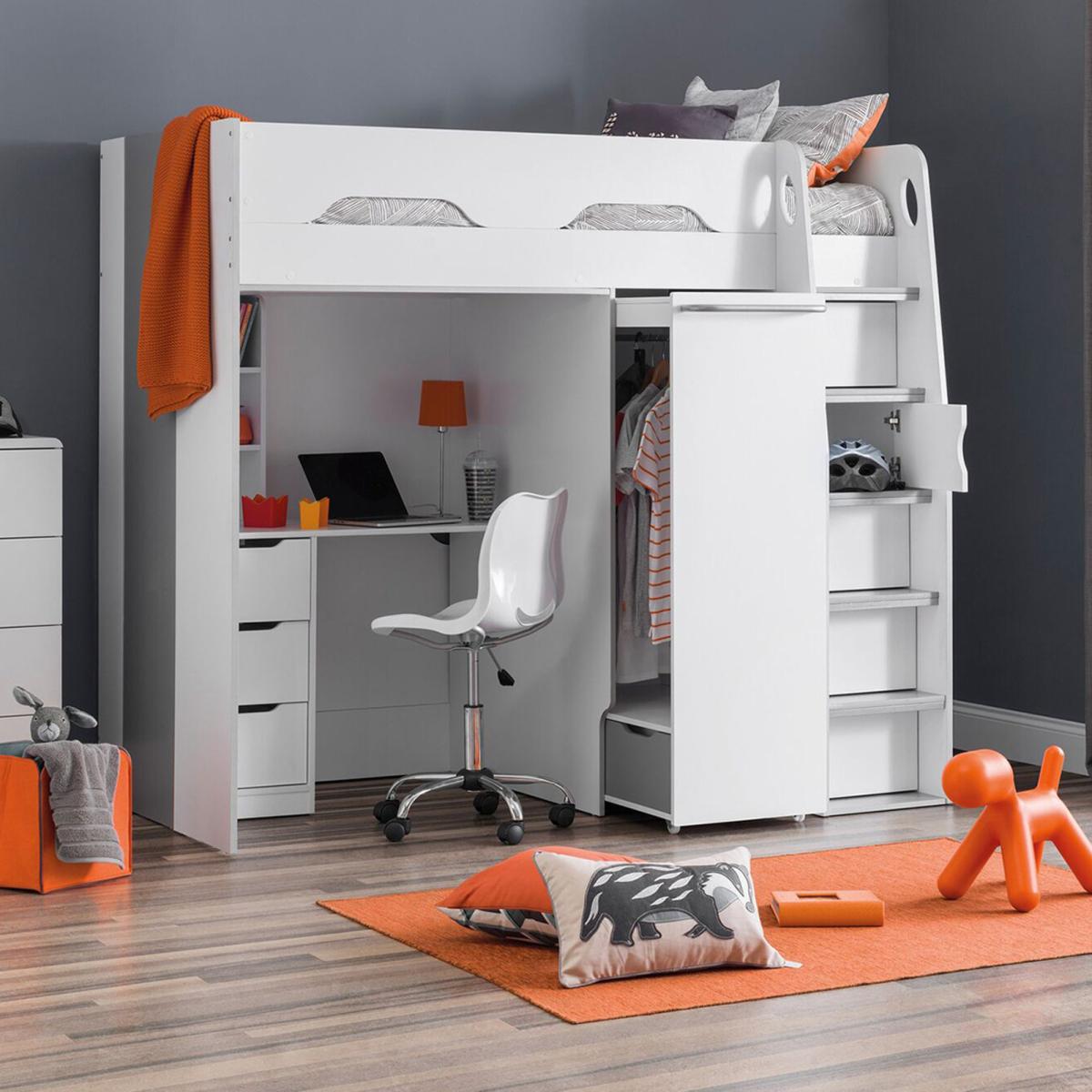 I’m a fan of the Pegasus high sleeper because it maximises floor space by combining a bed, desk and storage in one clean-lined unit. Its crisp white finish suits both contemporary and Scandi-inspired schemes, and the built-in wardrobe and drawers help keep toys and clothes neatly organised. To style it, zone the underneath area with a low-pile rug and a small cork or magnetic board above the desk for homework reminders. Introduce pops of colour through a study lamp, storage baskets and cushions that can be easily swapped as tastes change.