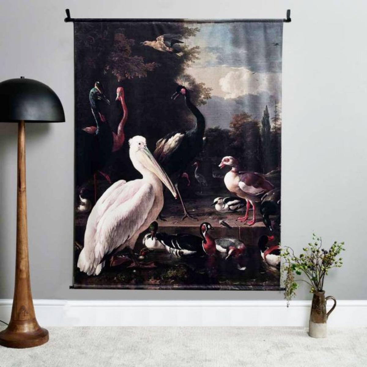 The Pelican Wall Hanging is grand piece of imagery and a true statement in any room it hands in. Featuring many more birds with a Pelican in the foreground, the wall hanging is made of a polyester velvet fabric and is supported by two batons at the top and bottom. The hanging attaches to the wall via two simple hook brackets included.