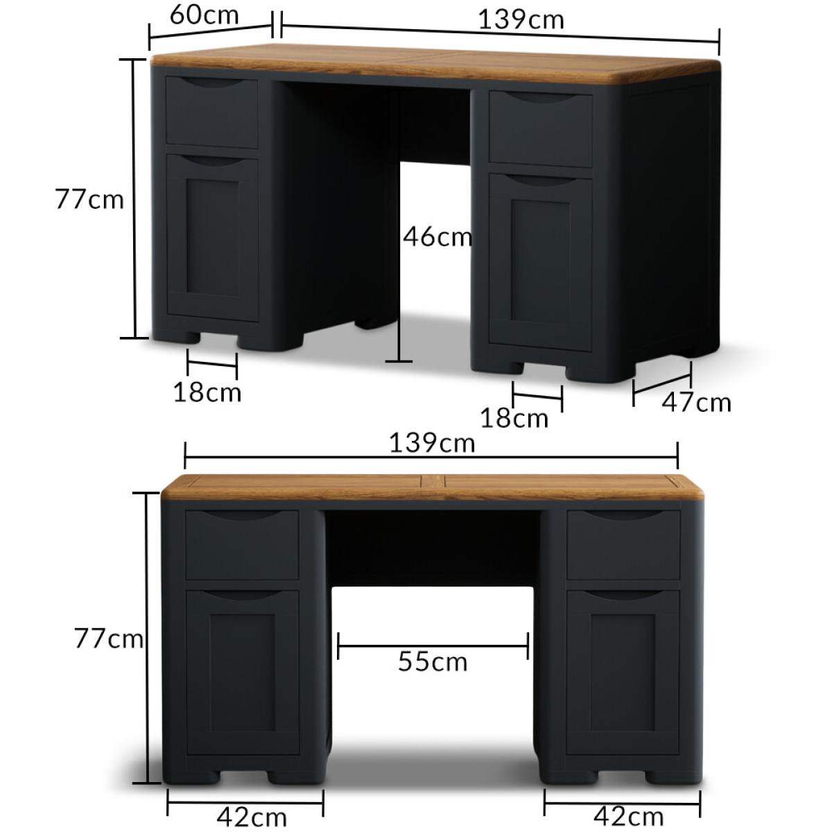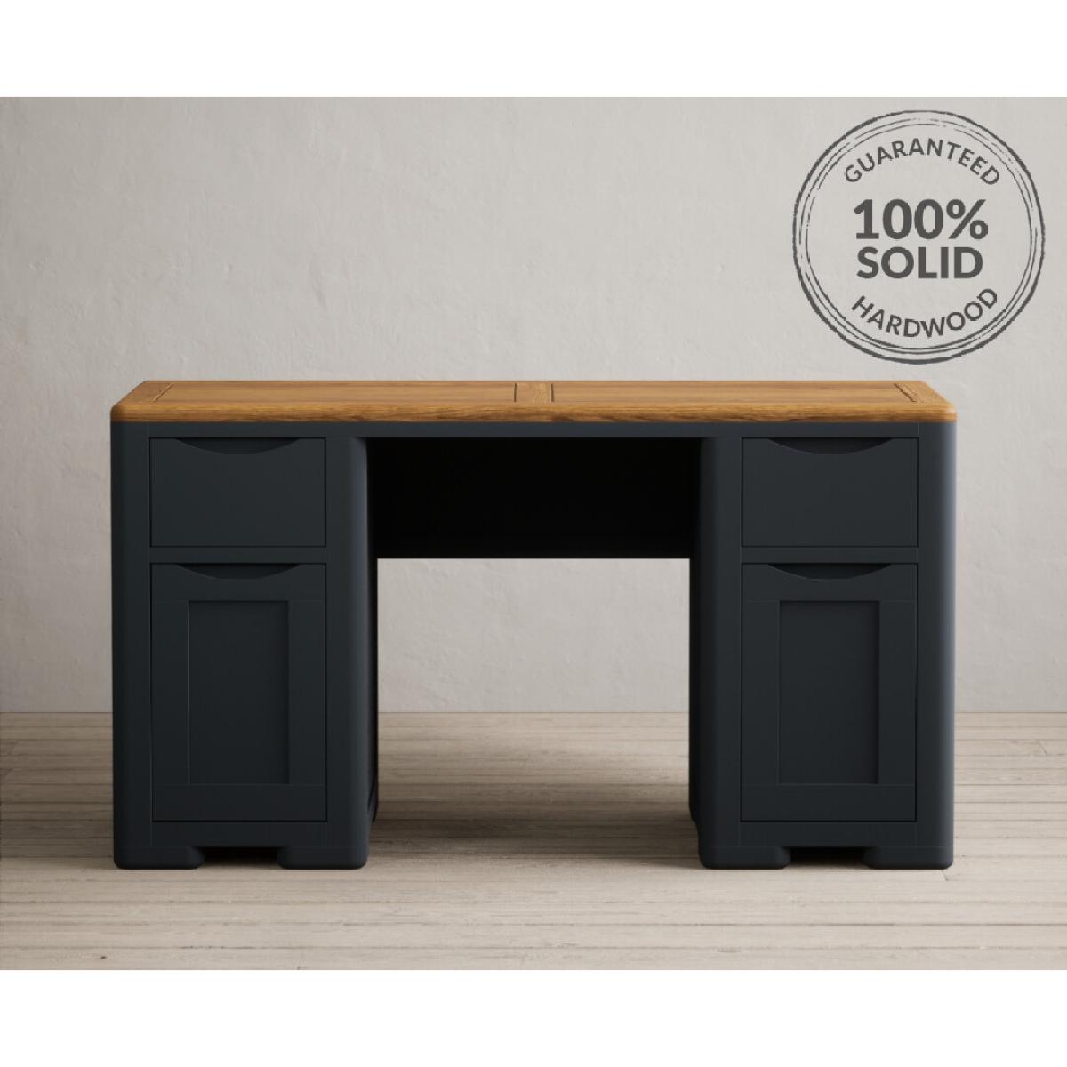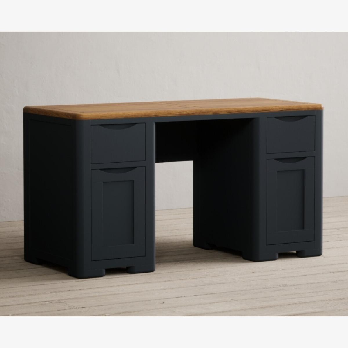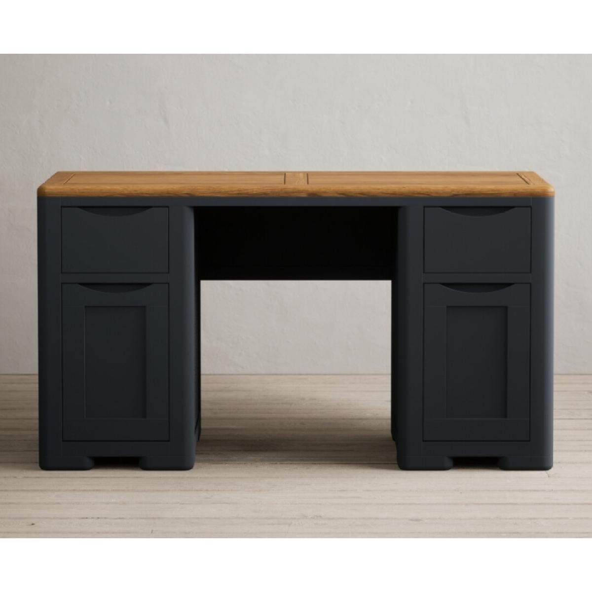 The Pembridge Oak and Dark Blue Painted Computer Desk features stylish curved edges and offers handy storage with two cupboards and two Dovetail drawers.