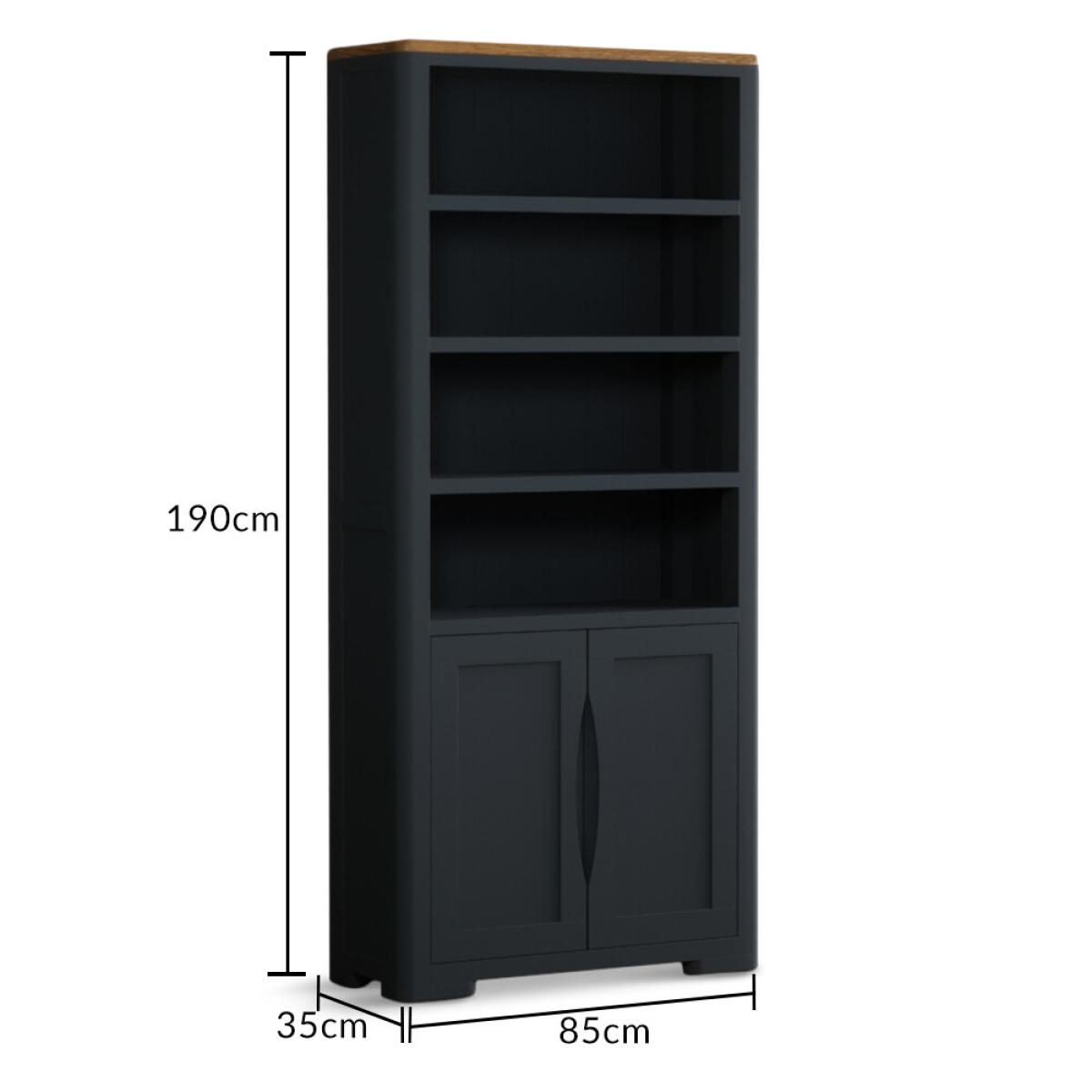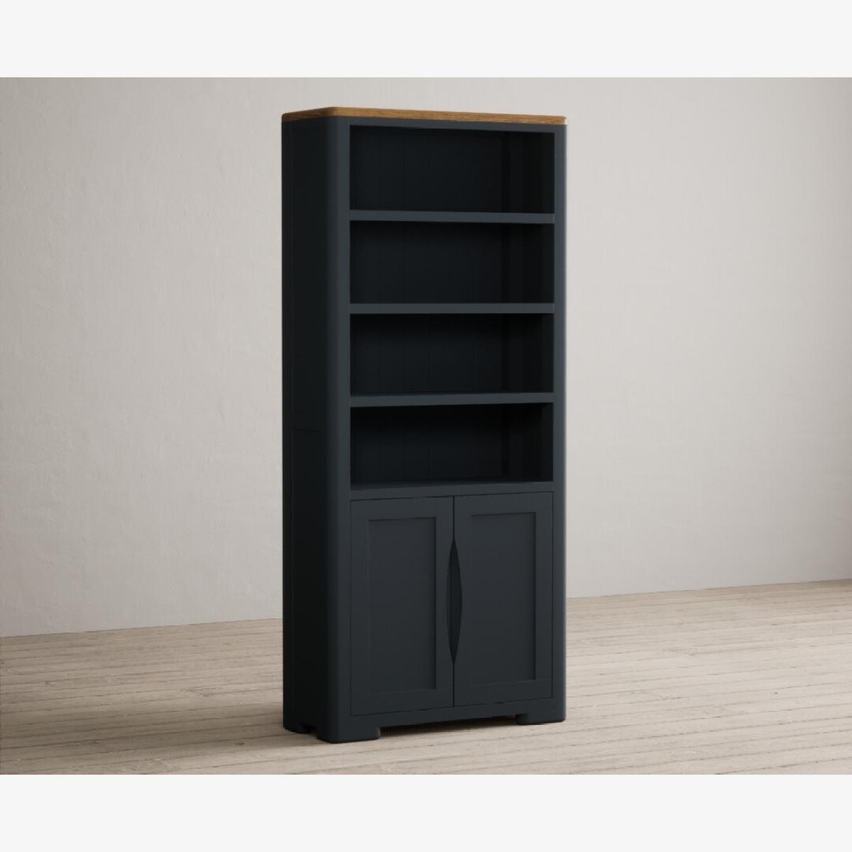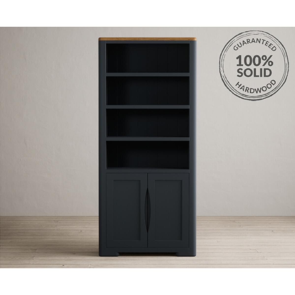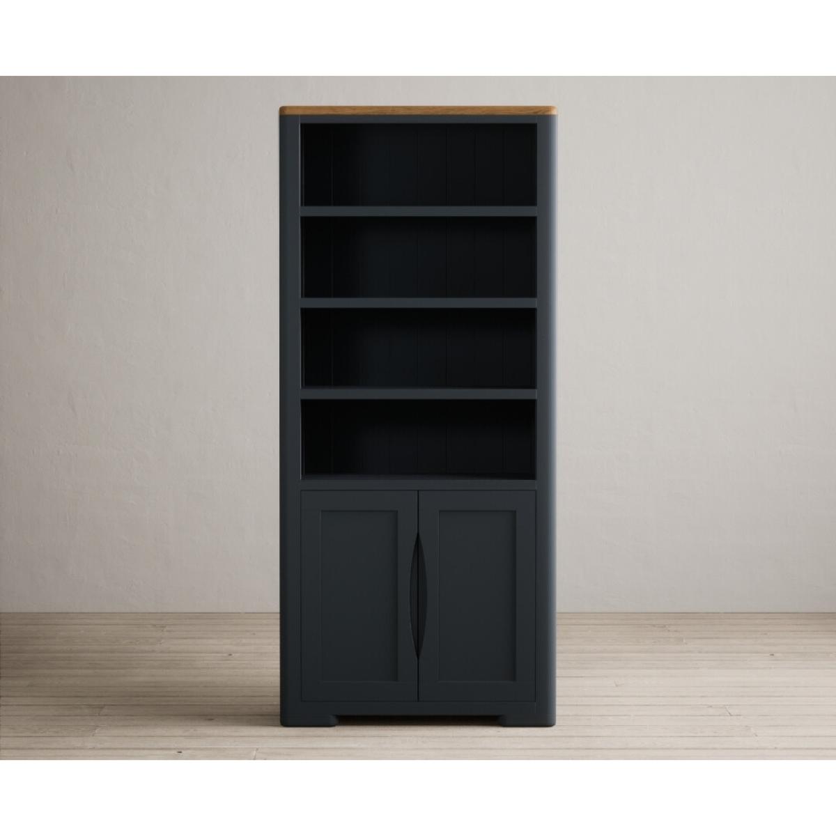 The Pembridge Oak and Dark Blue Painted Tall Bookcase features curved edges and sturdy shelves and is complete with a lower cupboard with recessed handles on the doors.