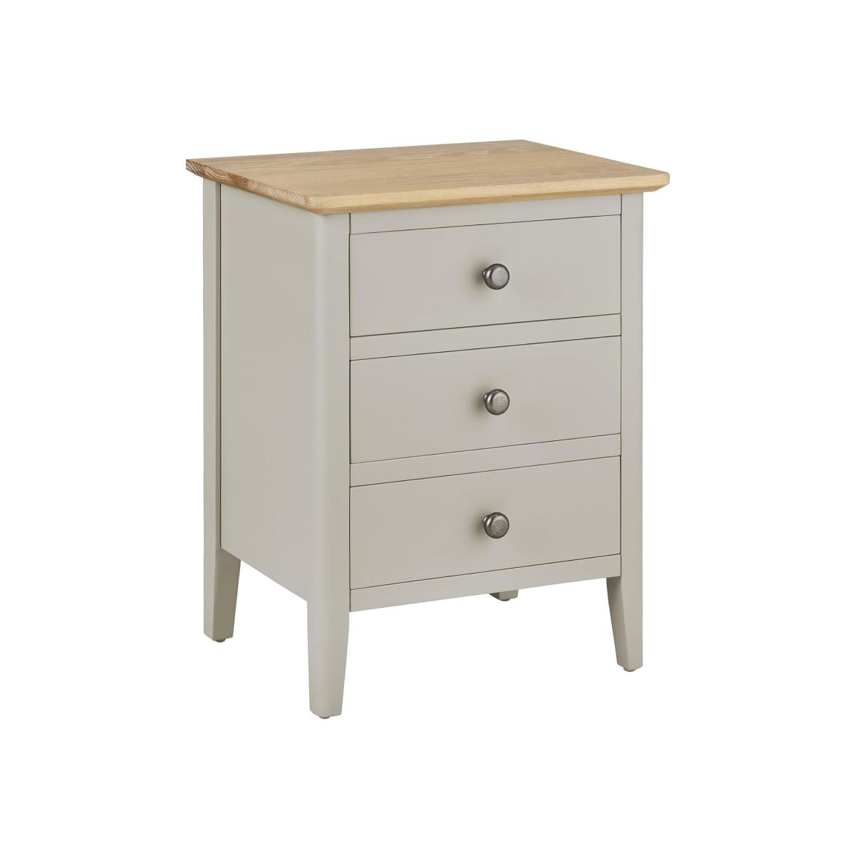 Introducing the Pembroke bedside table, a modern and stylish addition to your bedroom. Crafted with a pale oak top and three drawers adorned with round tarnished metal handles and metal runners, this fully assembled nightstand exudes quality and sophistication. Standing on tapered legs with rounded edges, it offers a sleek and contemporary design. This bedside table is the perfect size for any space, measuring W45cm, D36cm, and H59cm. Available in two elegant colours, Harbour Stone and Pebble, you can choose the one that best complements your decor. The drawers provide ample storage space with internal dimensions of W29cm, D26cm, and H8cm, ensuring you can keep your essentials neatly organised. Upgrade your bedroom with this practical and visually appealing Pembroke bedside table. Matching items, such as wardrobes, beds, and chests of drawers, from this modern bedroom furniture collection, are also available.