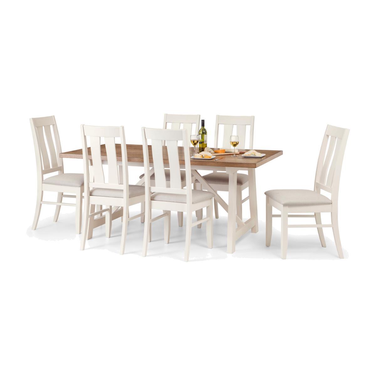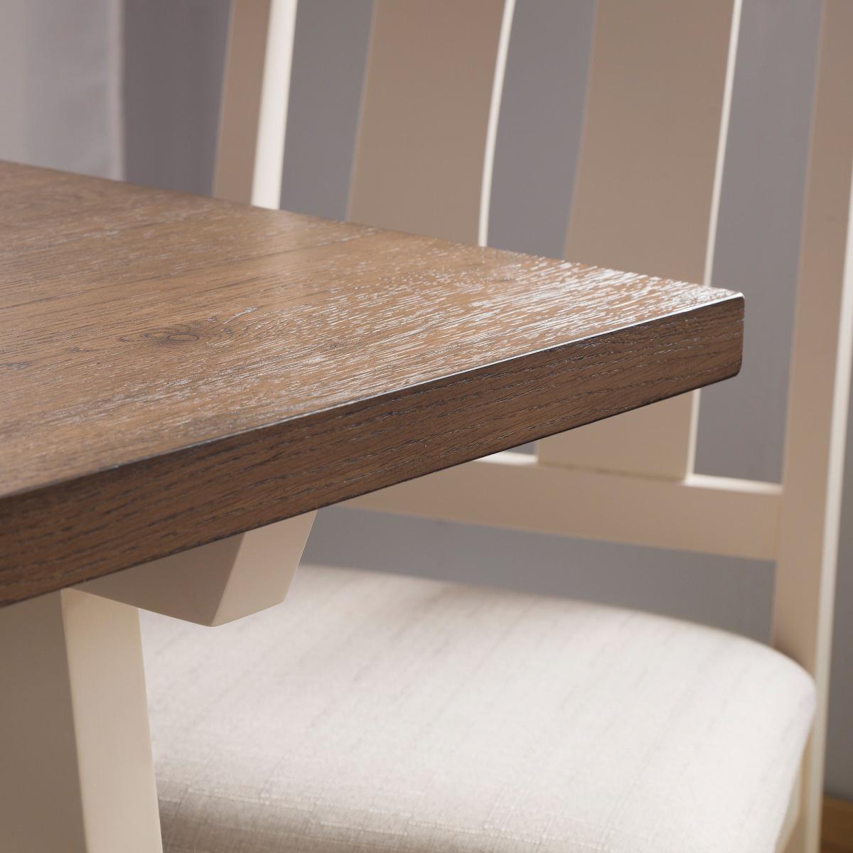 With an oak veneer and ivory finish, this set adds a contrast of warmth and delicacy to ay room. In a timeless design for any country or contemporary setting, this set includes comfortable padded seats for comfortable and relaxed dining.