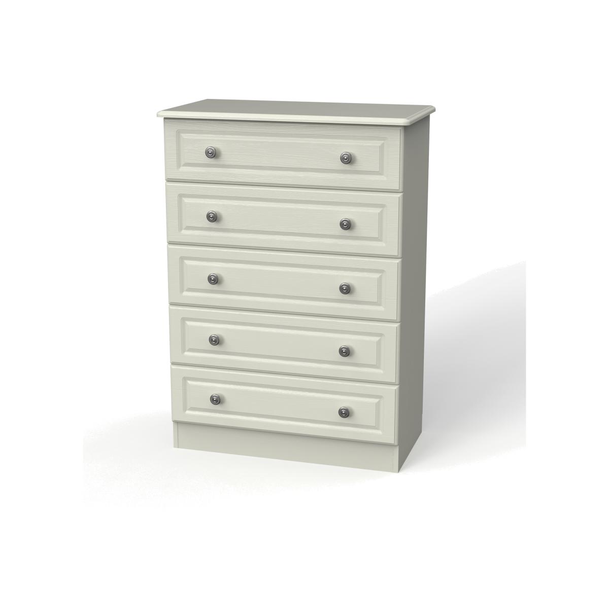 This wide 5 drawer chest of drawers is practical and stylish. Perfect for any home as a free standing storage unit. This lovely, traditional furniture set will be a beautiful addition to any home with its distinctive detailing and robust design. This range offers you plenty of storage options for all your personal items from clothes to smaller bits and pieces. Built to last, these pieces feature scratch resistant veneer which will resist the wear and tear of daily life and will stay looking great for longer. All our furniture is made in the United Kingdom, to the highest quality. It is delivered direct to your location of choice by one of our two man delivery teams, and come full assembled (although legs may be removed to prevent damage in transit).