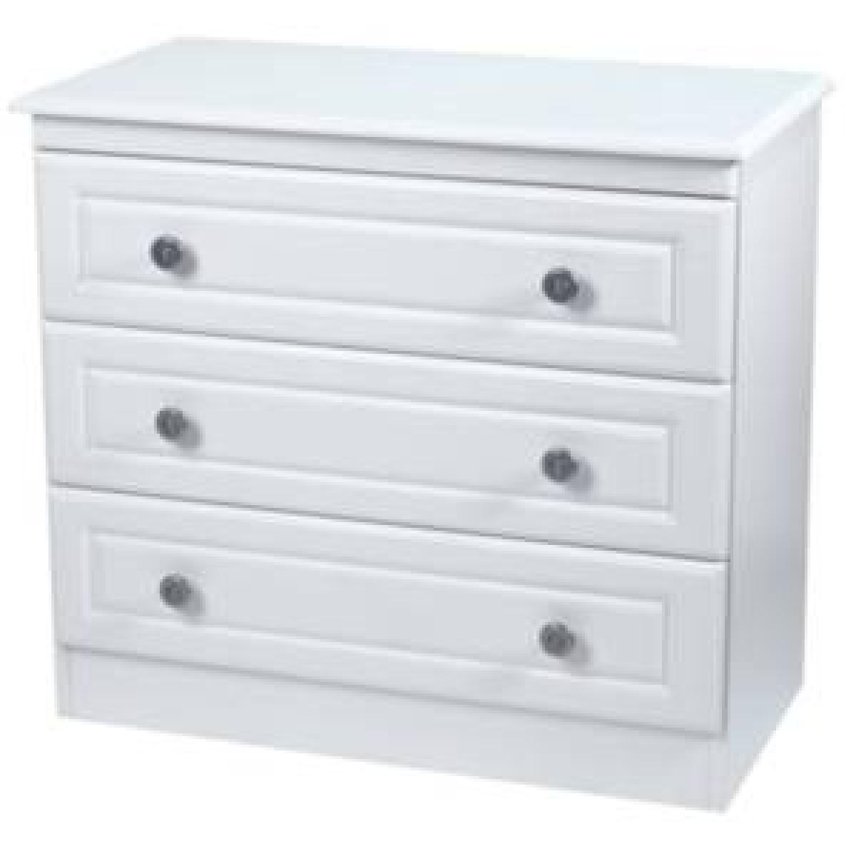 Combining style, elegance and practicality, the gorgeous Pembury Three Drawer Chest is beautifully crafted with a matt finish and embossed decoration to give you a spacious storage solution for everyday use. The durable and versatile unit is perfect for housing important paperwork and folders in your office, hold stationery in your craft room, or storing away clothing in the bedroom. Adorn the top with a lamp, decorative ornament or seasonal blooms to complete the stunning appearance. The simple drawers are sturdy and robust, gliding smoothly on metal runners. The detailed metal handles are rounded and decorative, adding to the sophisticated exterior and creating depth and character to the simple design. The minimalist style matches well with both modern and traditional interior decor, turning your house into a stylish home you can be proud of.
