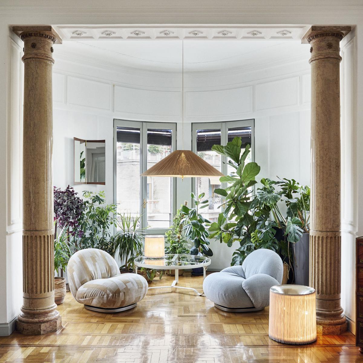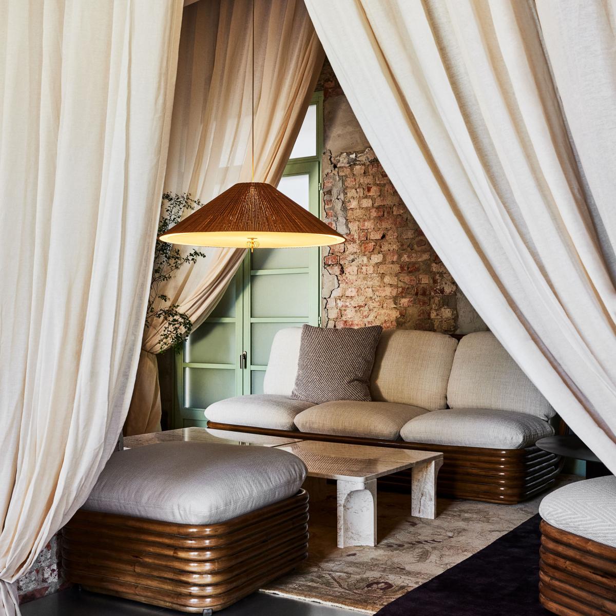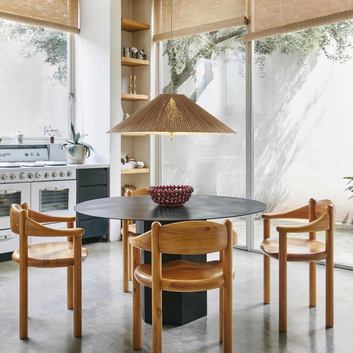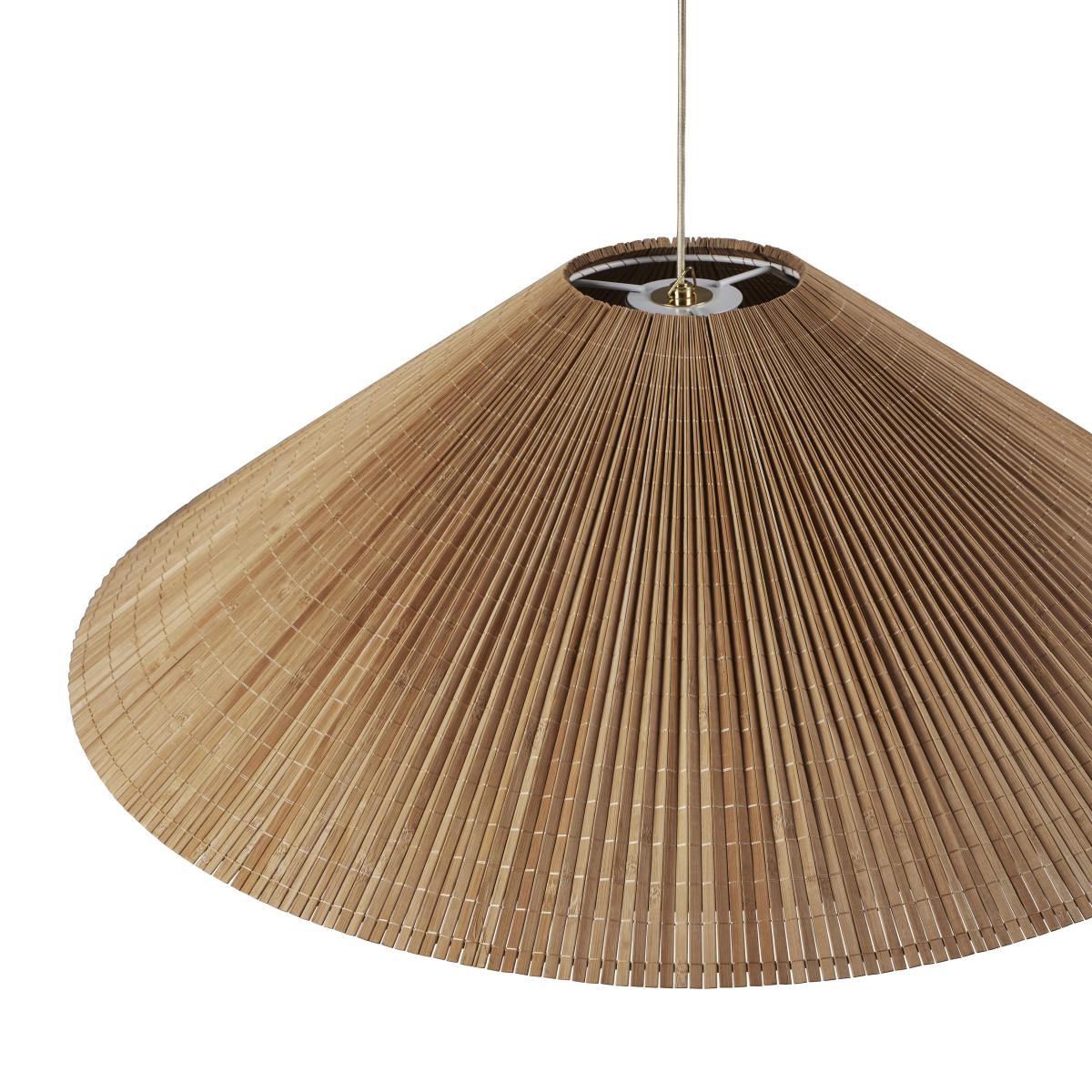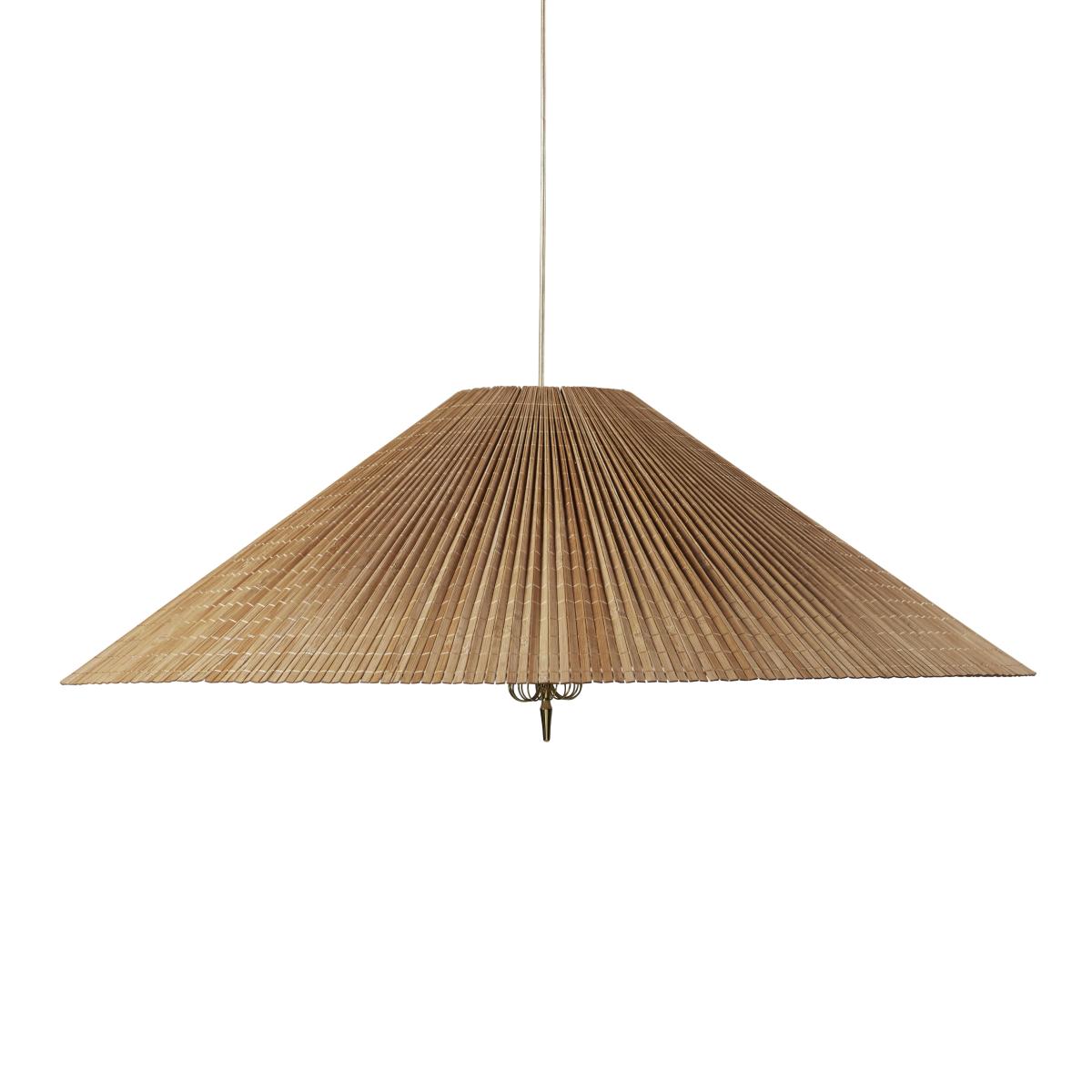 The A1972 pendant light was created by designer Paavo Tynell in the 1950s. A great pioneer of Finnish lighting, Paavo Tynell (1890-1973) is fondly known as "the man who lit up Finland". His lamps are highly sought after by collectors around the world and prices for his original pieces have recently soared at auction. The 1972 pendant light stands out with its stunning combination of natural and sophisticated materials, and the pleated form of its elegant, conical lampshade, made with natural bamboo. Produced up until 1972, the original pendant light by Tynell was composed of slats of Finnish aspen wood, which was replaced by bamboo, a material with the same qualities in terms of aesthetics, durability and flexibility, but which grows quickly and is thus renewable at a faster rate. Each piece is an artisan work of art, with subtle yet extremely complex details. Each bamboo slat is hand-stitched and carefully attached to the metal frame, with a linen lining between the two elements. The underside of the lampshade is closed by a fabric diffuser. The warming and natural aspect of bamboo combines wonderfully with the polished brass elements. The A1972 pendant light illustrates Paavo Tynell's boundless imagination and unmatched ability to create timeless designs.