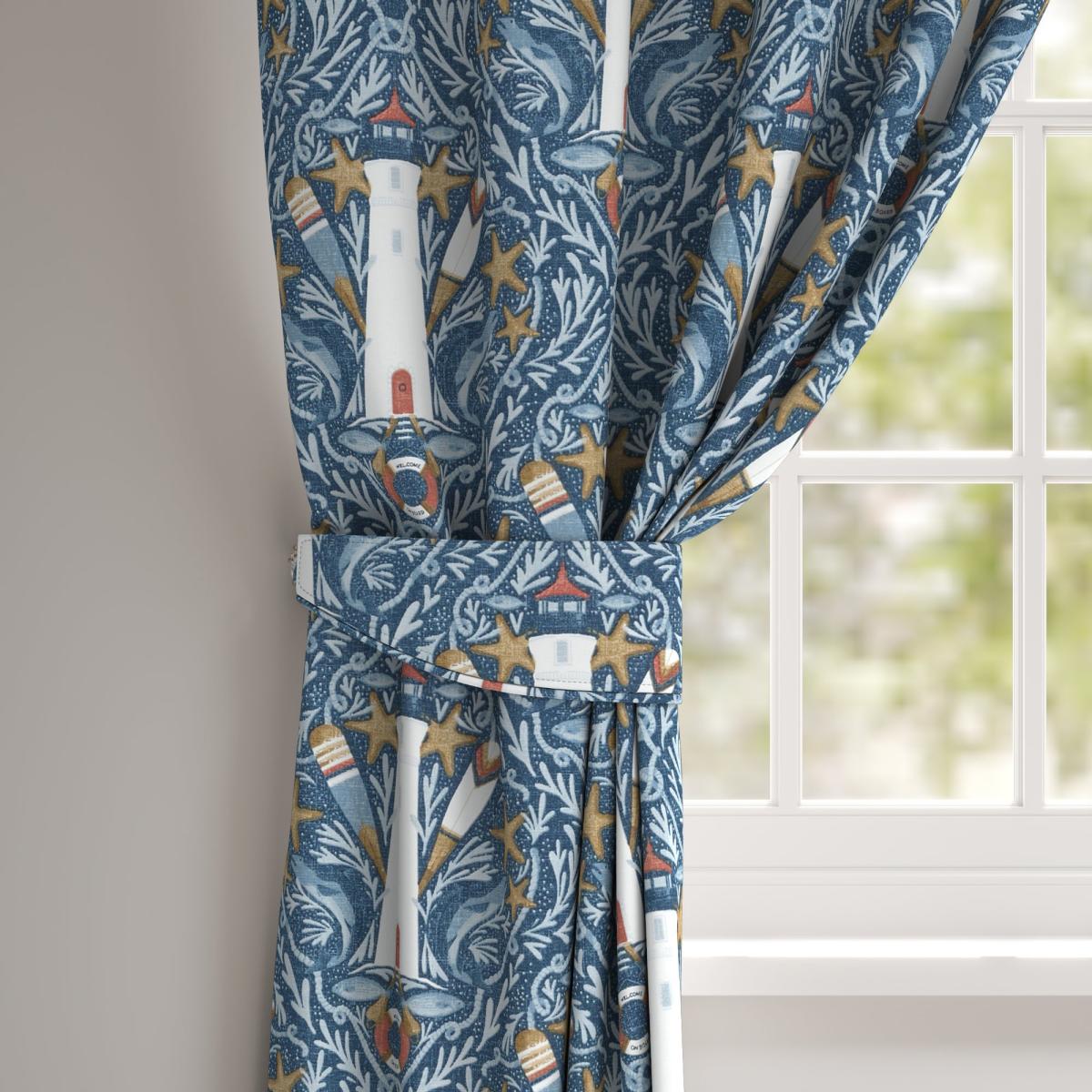 Transform your curtains with our Pendeen Made to Order Tieback. Individually sold, each tieback provides the option of a sleek plain or an elegant piped edge, allowing you to customise the look according to your preferences. The unique print adds a beautiful escape to the coast look to any space, featuring stunning lighthouses, oars and starfish' all over. Shop the matching Pendeen Made to Measure and Made to Order items available to purchase separately for a complete look! Our Web Exclusive Coastal range features a variety of unique designs, across curtains, tiebacks, cushion covers and more, all made on a 100% cotton fabric base. The 100% natural fibres like cotton are kinder to the environment, as well as to our skin, being naturally hypoallergenic, meaning they are ideal for sensitive and allergy-prone skin, as well as having unique anti-bacterial qualities. You can feel confident that our Coastal range will be gentle to the environment, and to those who may sit close.