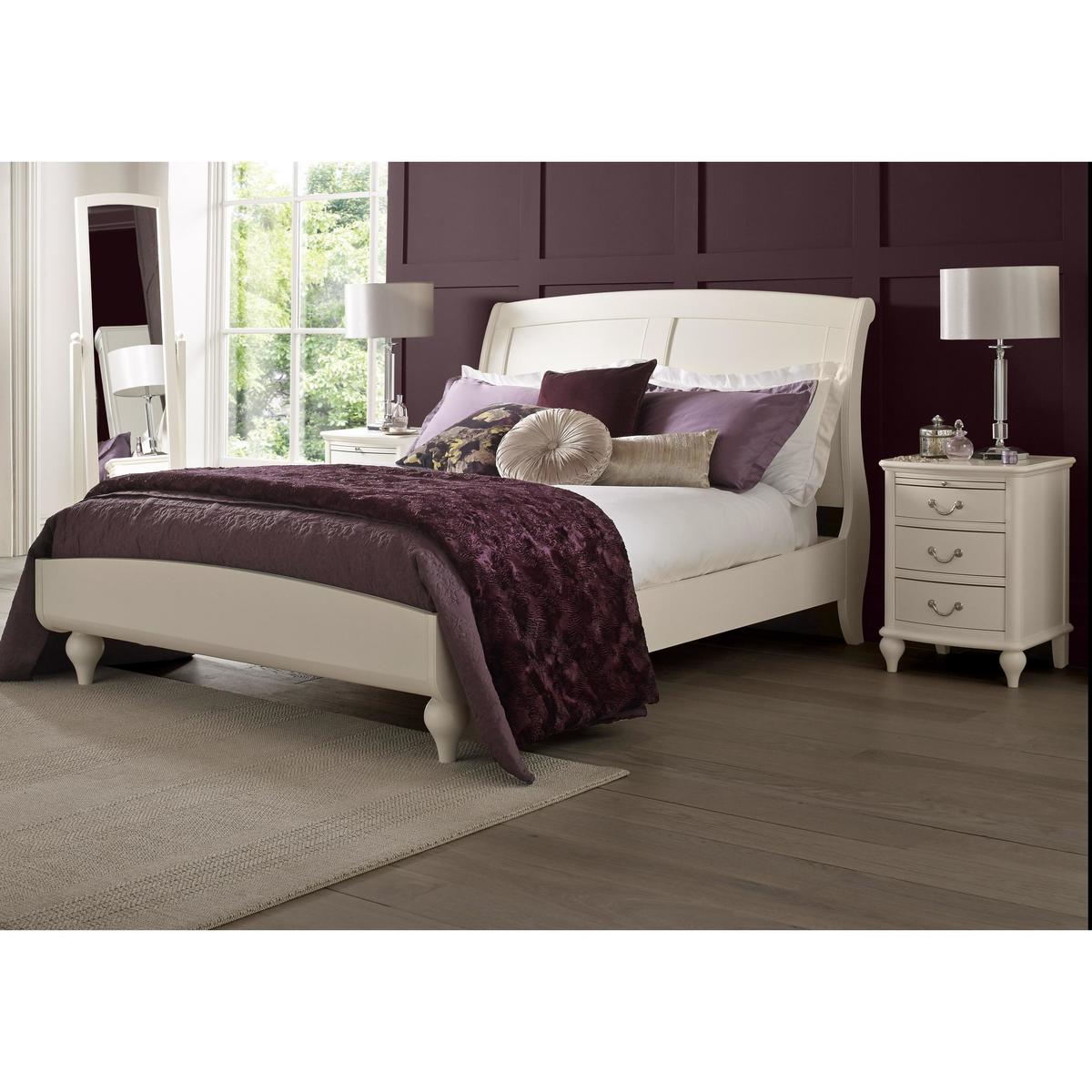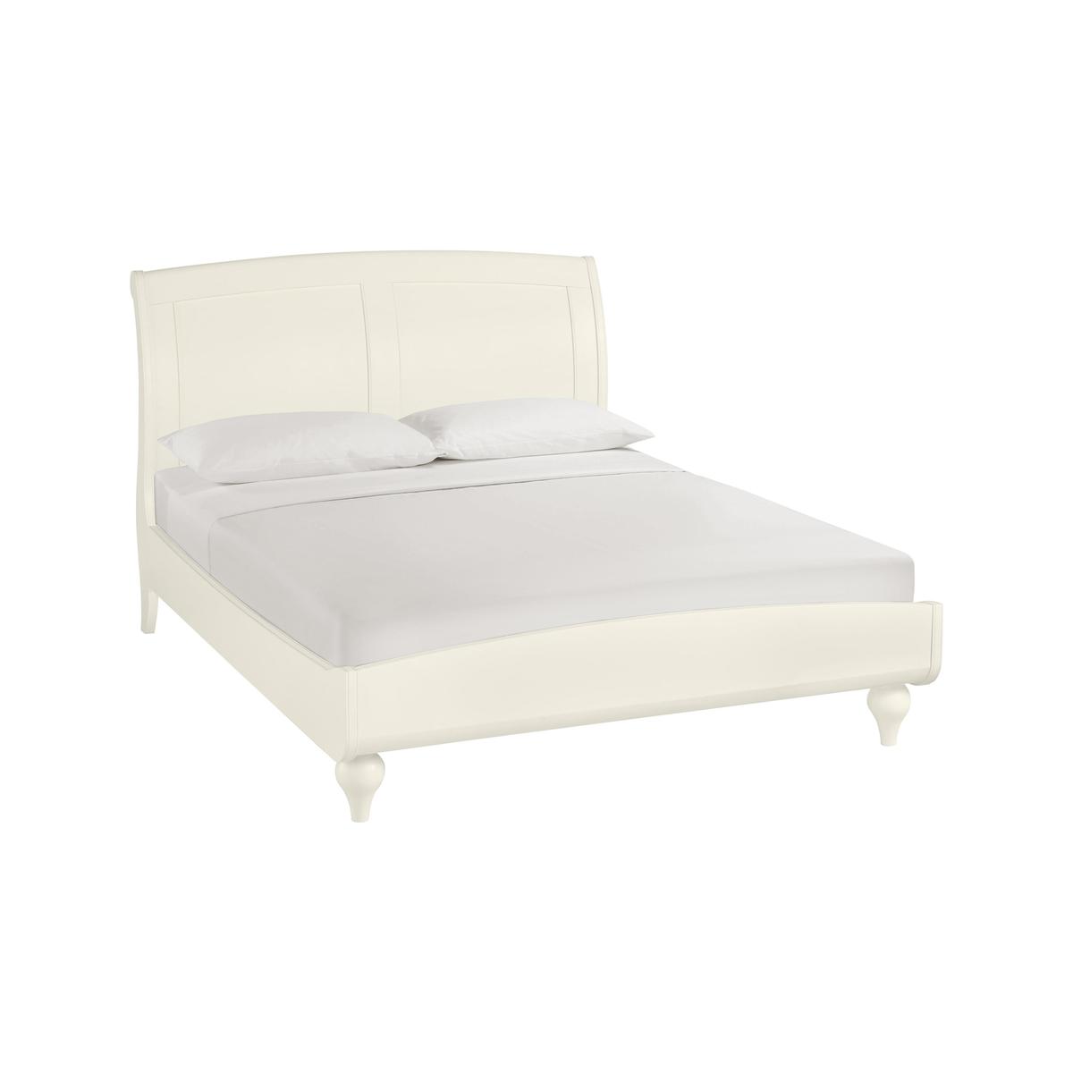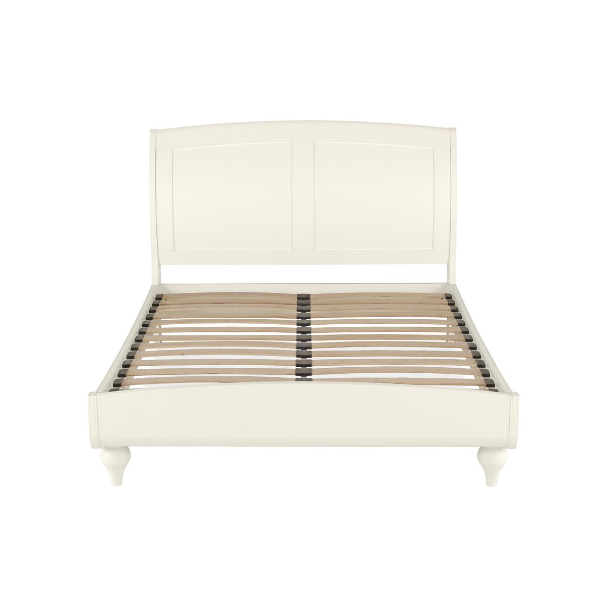 Headboard and footboard each come in one single piece. Double or King Size bed frame with low curved foot end. Headboard has panelling and a profiled crest rail at top. Elegantly turned feet. Finished in a soft ivory paint. Sturdily made with sprung beech wood slats. Suits standard double mattress, available separately. Timeless, sophisticated style for an elegant bedroom. Mattress available separately