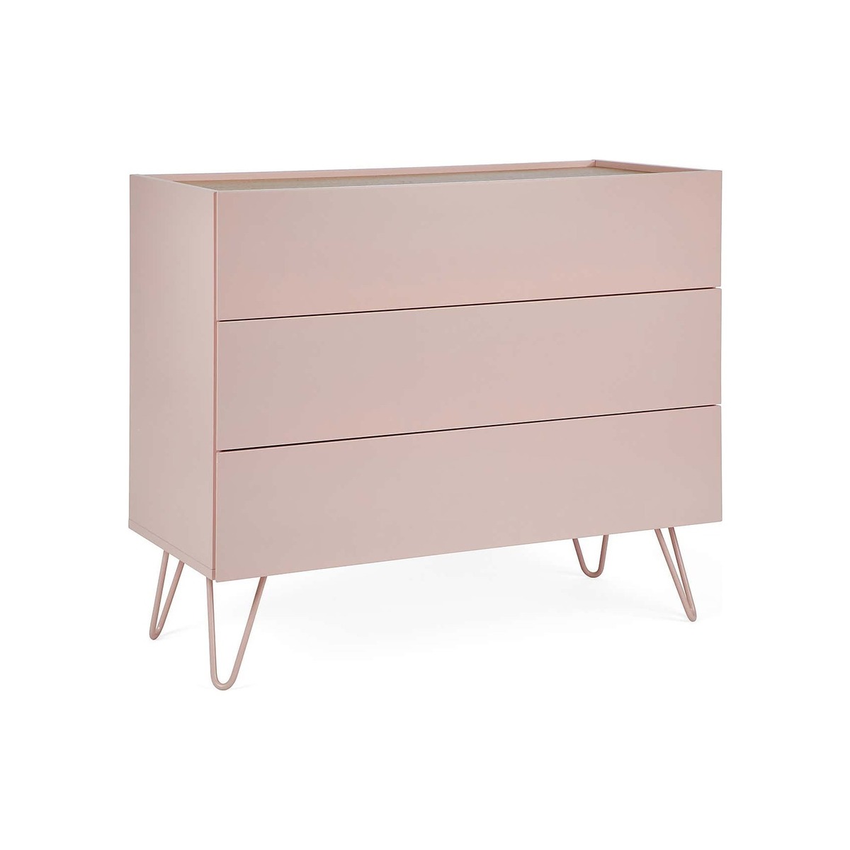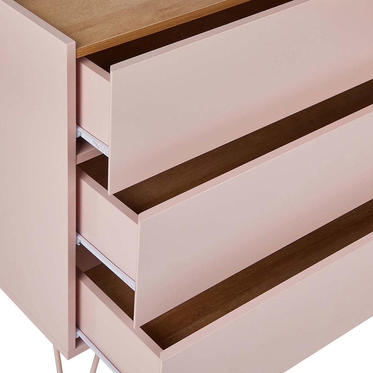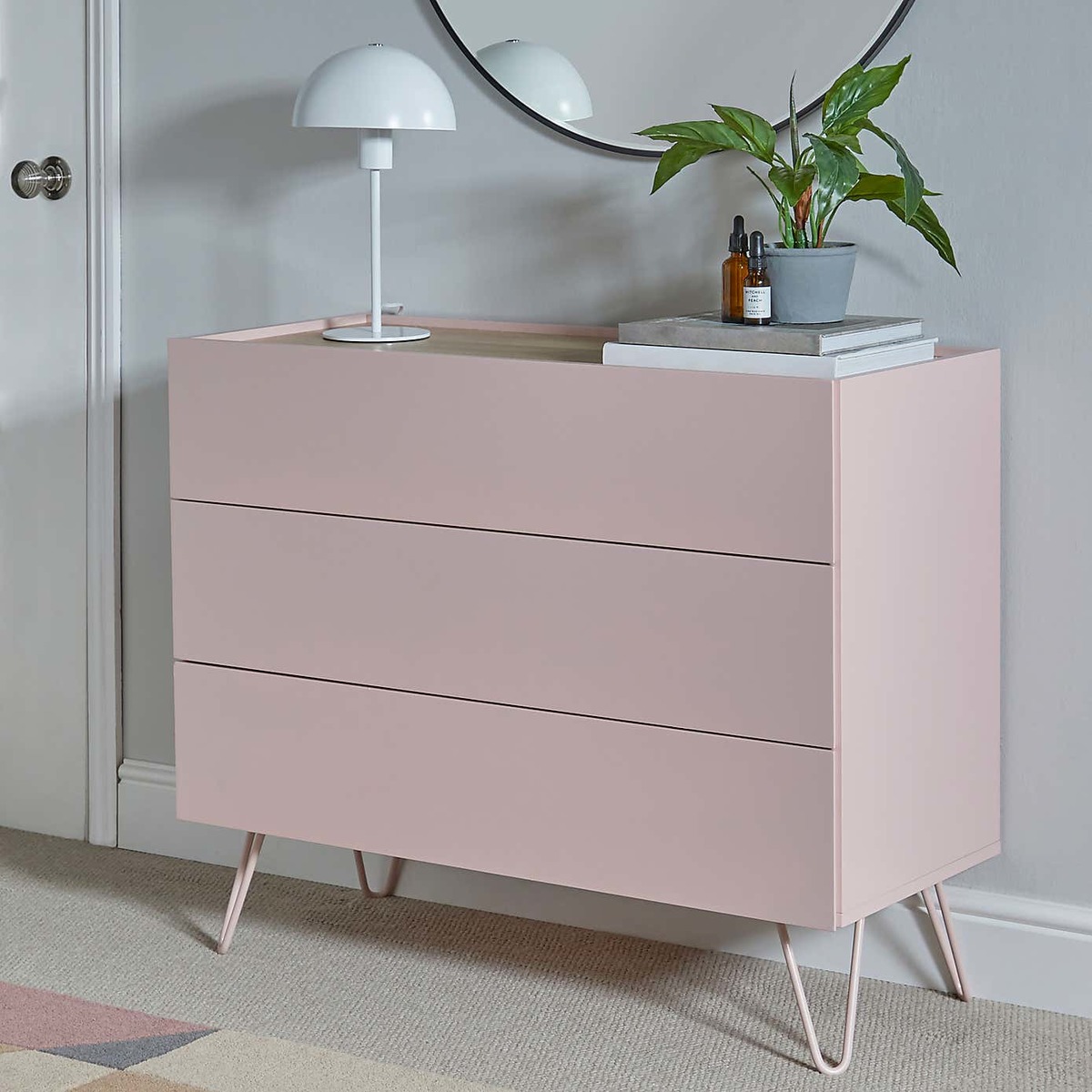 Dunelm Exclusive – Designed and Developed by Dunelm. With its mix of soft colours and natural wood finishes, the Penelope range boasts a modern design that would suit any modern décor. This gorgeous retro-inspired collection features painted hairpin legs and handleless drawers, creating an elegant modern look. Finished in a painted blush colourway with an oak effect top, the Penelope 3 Drawer Chest features ample storage space and would be a stunning addition to your bedroom.