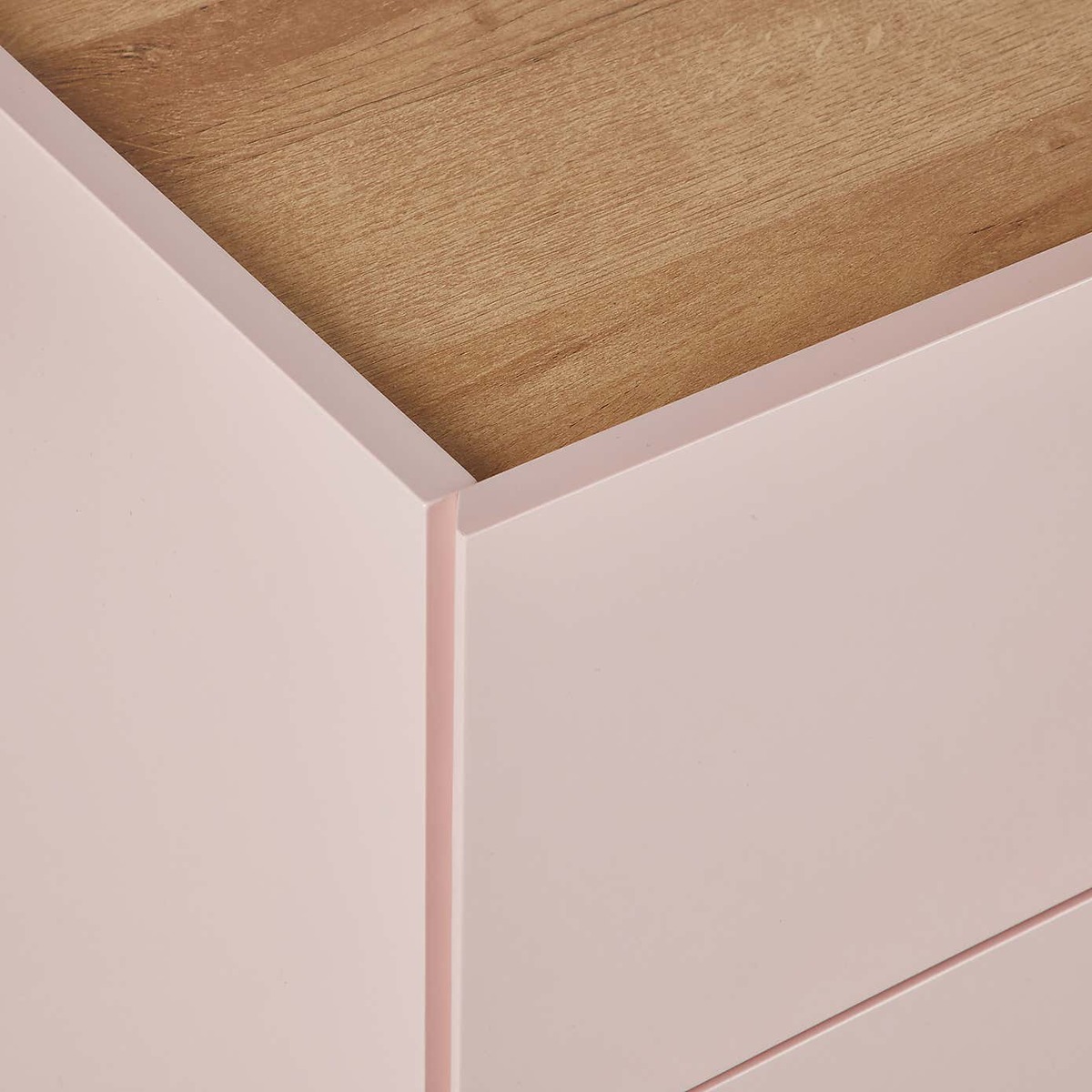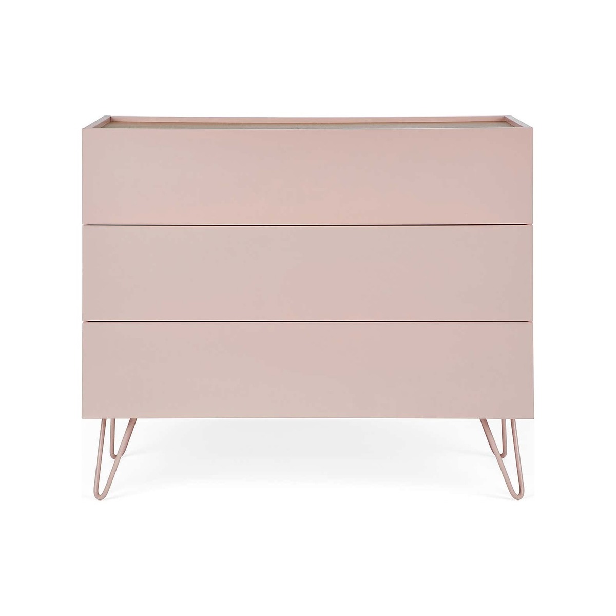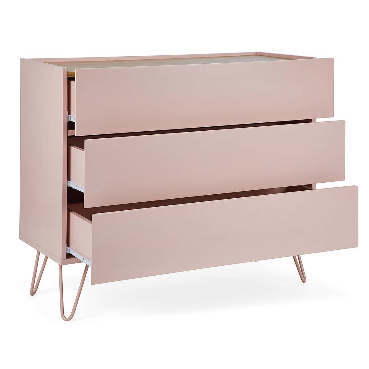 Dunelm Exclusive – Designed and Developed by Dunelm. With its mix of soft colours and natural wood finishes, the Penelope range boasts a modern design that would suit any modern décor. This gorgeous retro-inspired collection features painted hairpin legs and handleless drawers, creating an elegant modern look. Finished in a painted blush colourway with an oak effect top, the Penelope 3 Drawer Chest features ample storage space and would be a stunning addition to your bedroom.