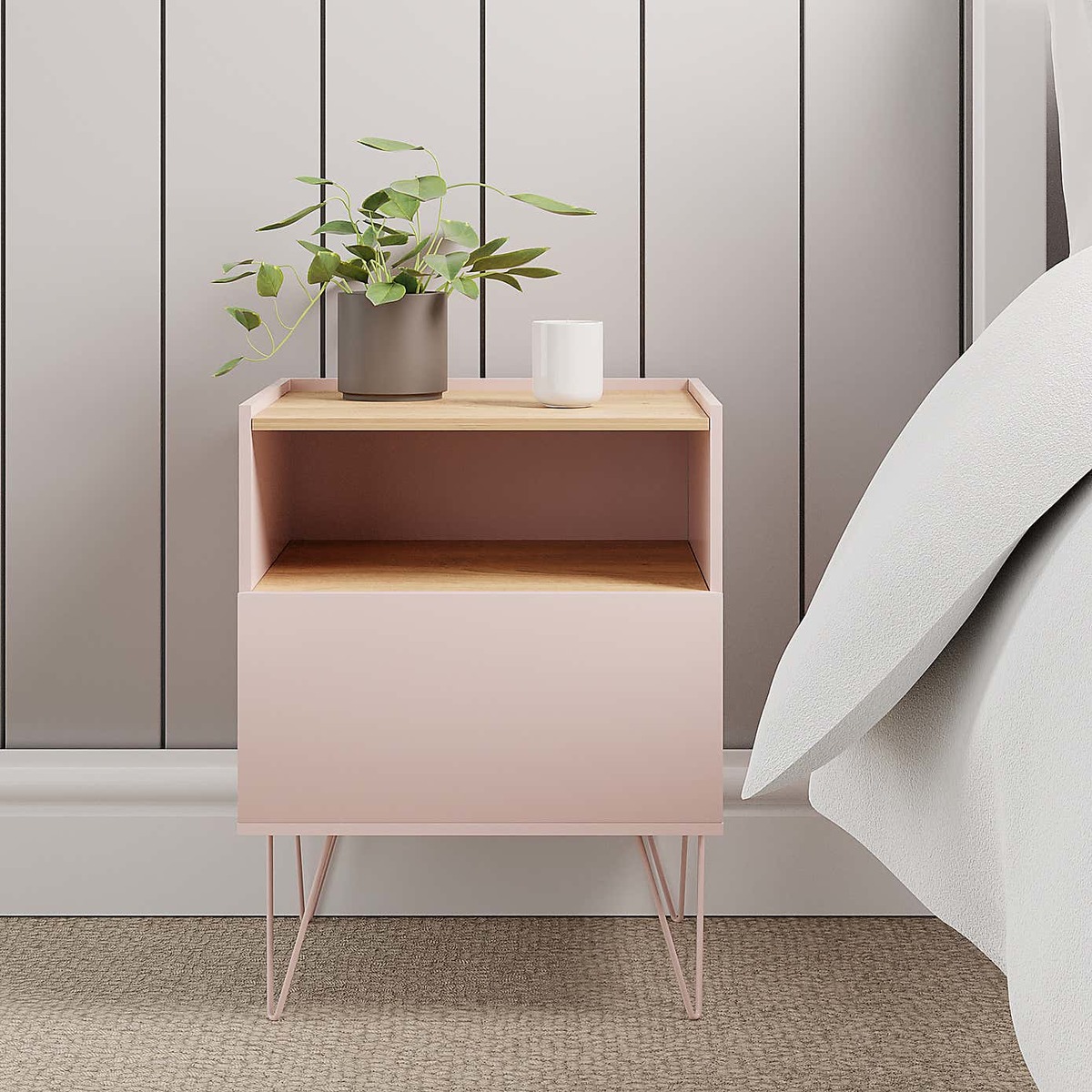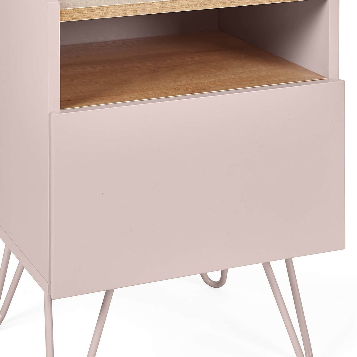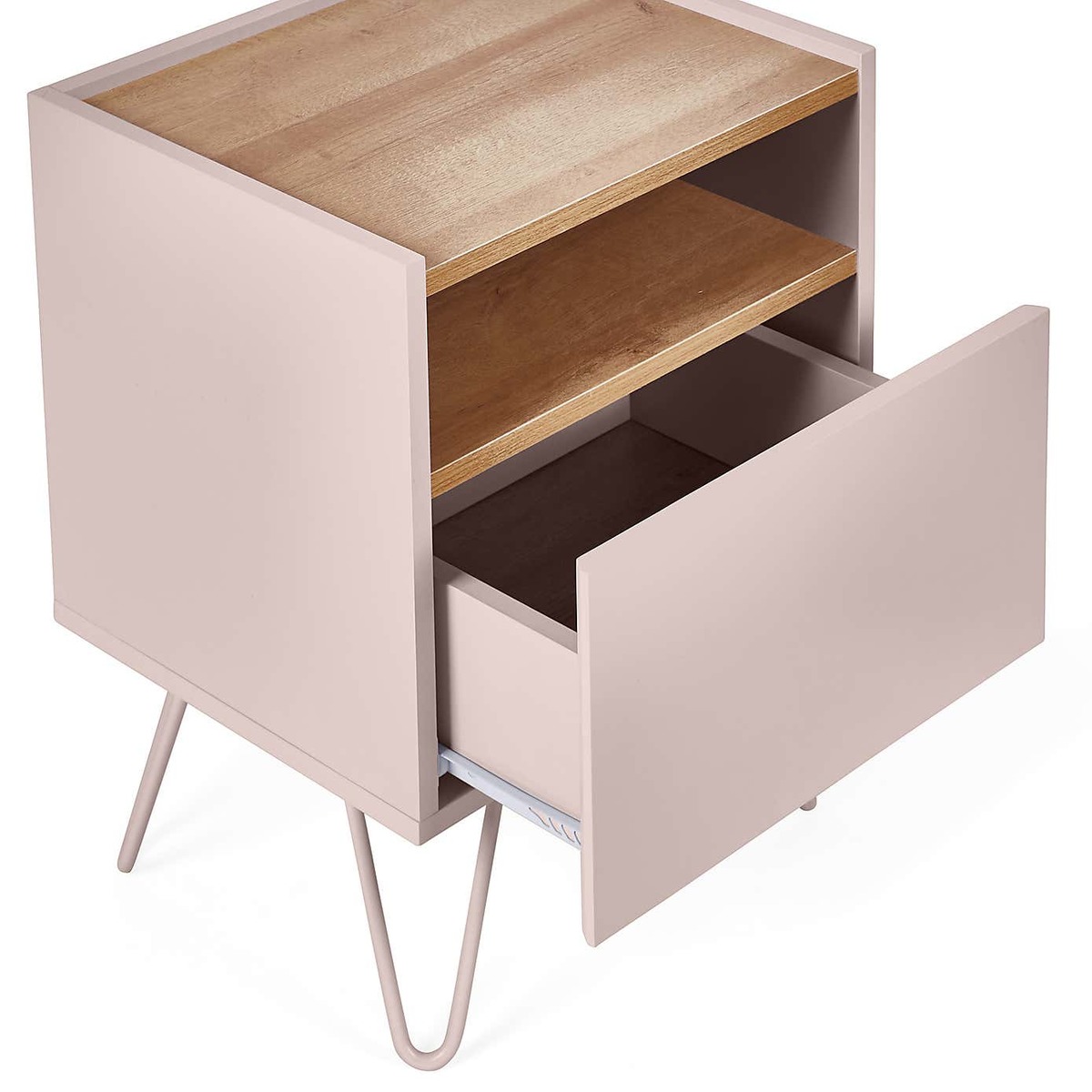 Dunelm Exclusive – Designed and Developed by Dunelm. With its mix of soft colours and natural wood finishes, the Penelope range boasts a modern design that would suit any modern décor. This gorgeous retro-inspired collection features painted hairpin legs and handleless drawers, creating an elegant modern look. Finished in a painted blush colourway with an oak effect top, the Penelope bedside table features a large drawer and a convenient open shelf space, perfect for maximising storage in your bedroom.