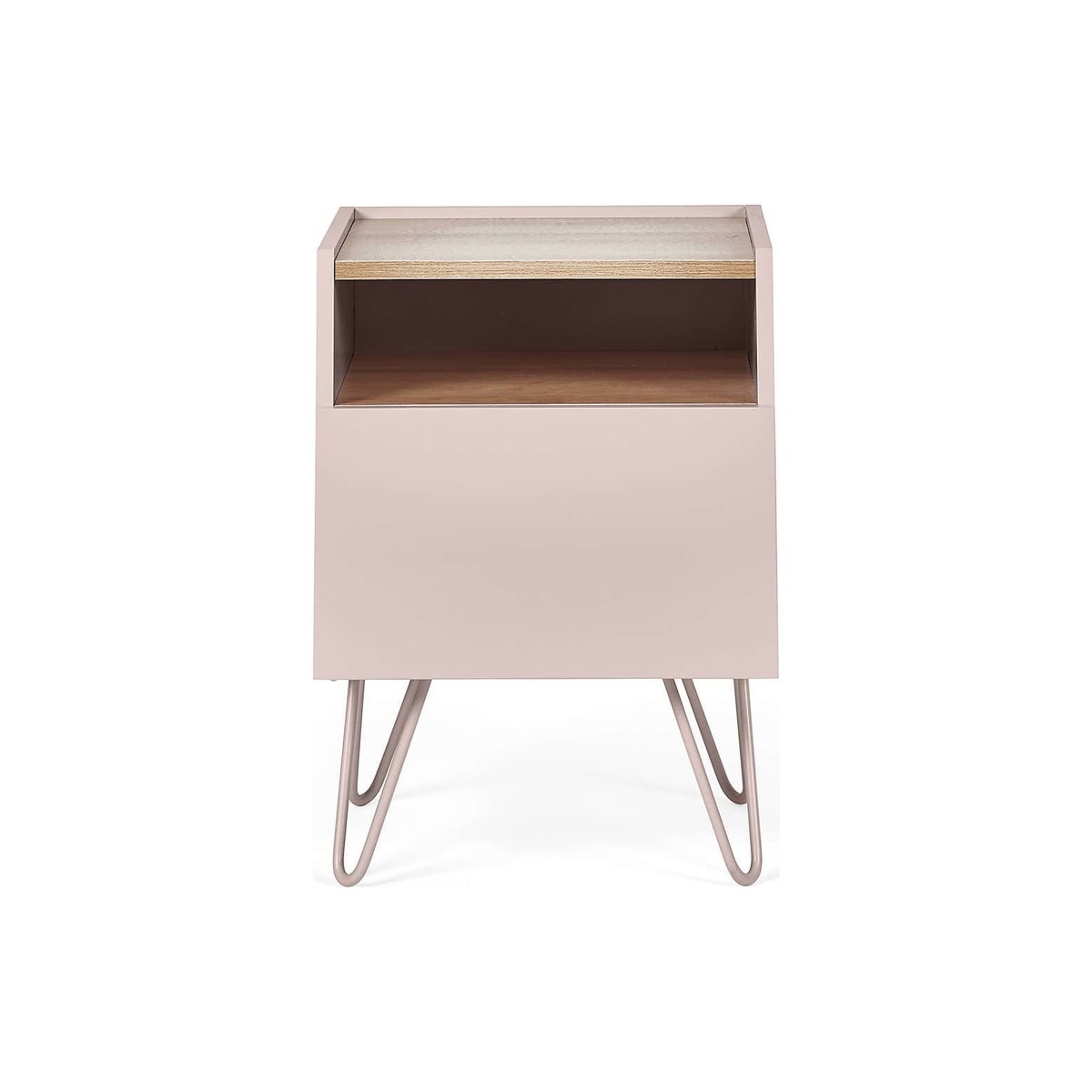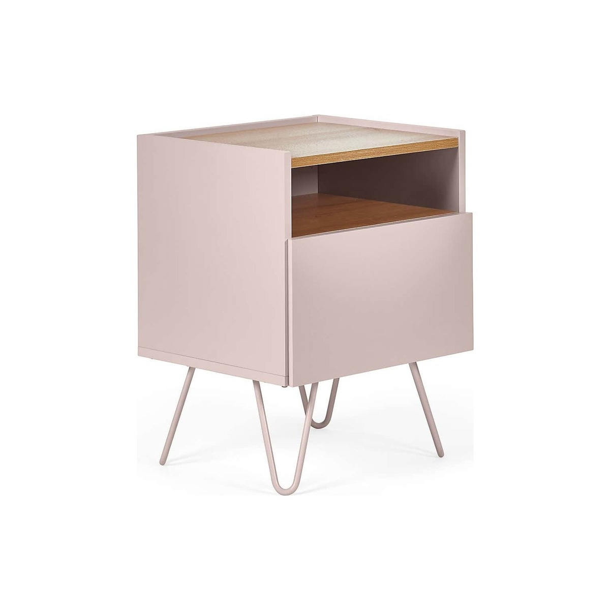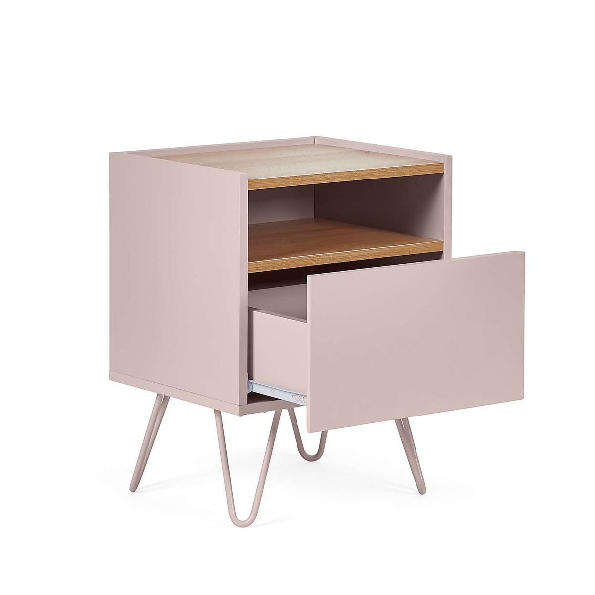 Dunelm Exclusive – Designed and Developed by Dunelm. With its mix of soft colours and natural wood finishes, the Penelope range boasts a modern design that would suit any modern décor. This gorgeous retro-inspired collection features painted hairpin legs and handleless drawers, creating an elegant modern look. Finished in a painted blush colourway with an oak effect top, the Penelope bedside table features a large drawer and a convenient open shelf space, perfect for maximising storage in your bedroom.