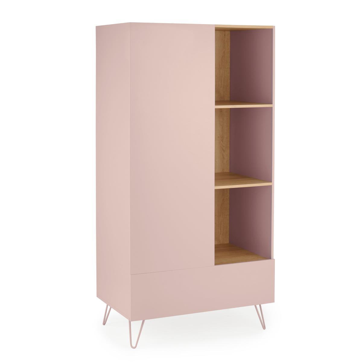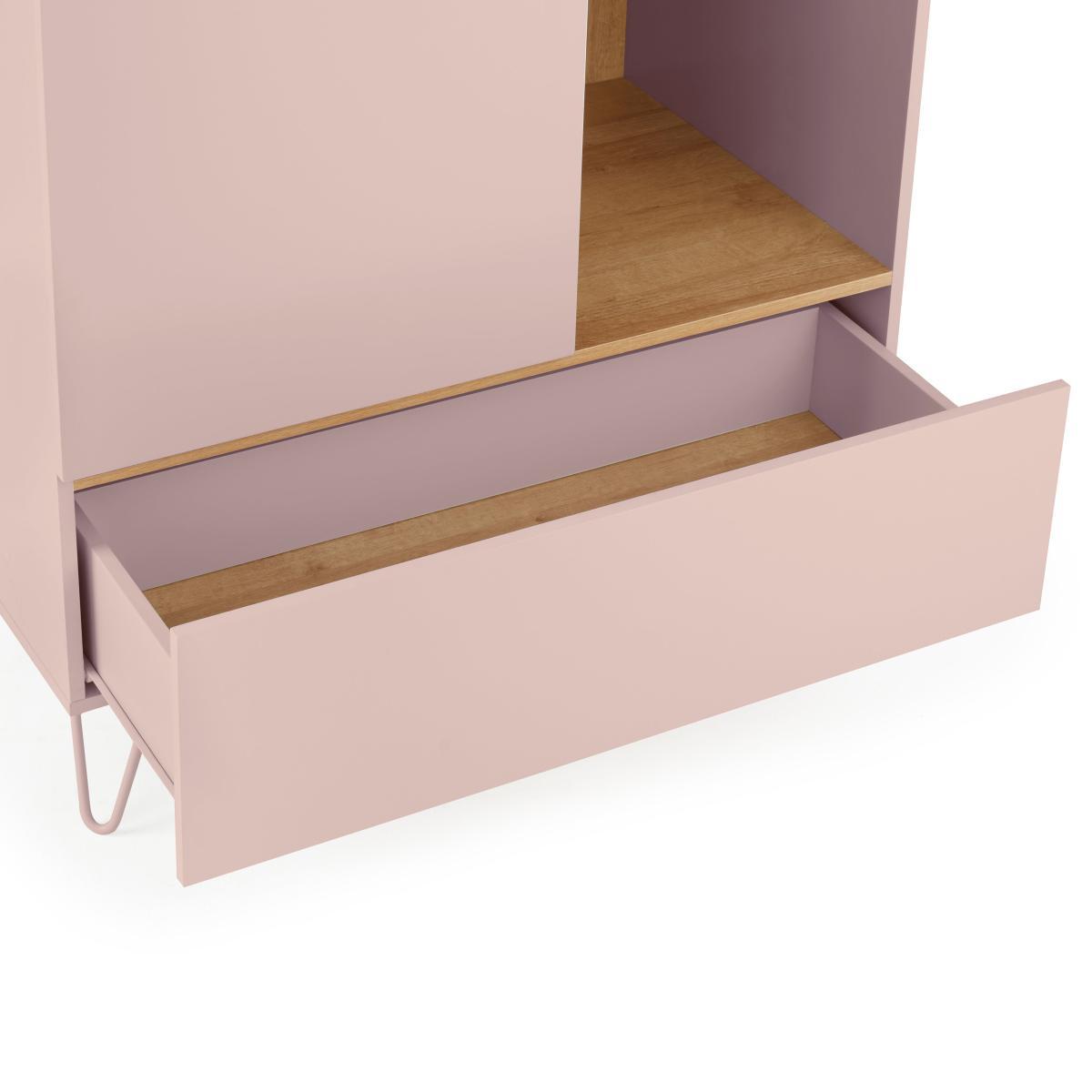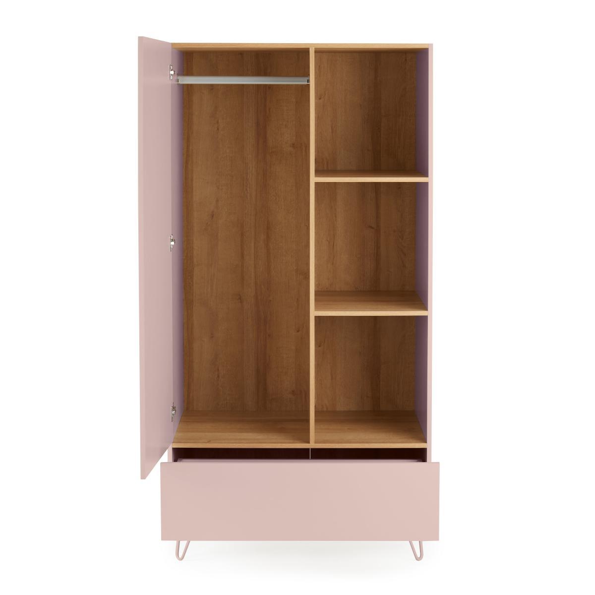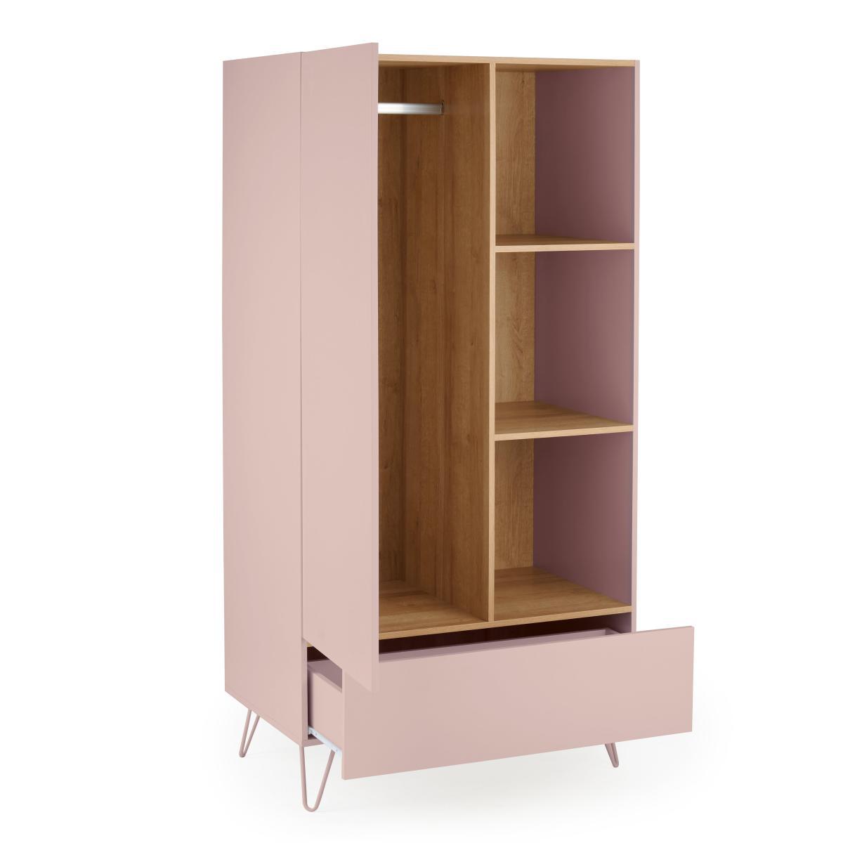 Dunelm Exclusive – Designed and Developed by Dunelm. Mixing both soft colours and natural wood finishes, the Penelope range boasts a modern design that would suit any modern décor. This gorgeous retro-inspired collection features painted hairpin legs and handle-less drawers, creating an elegant modern look. Finished in a painted blush colourway with an oak effect top and internals, the Penelope double wardrobe features one large drawer, 3 open shelves and a hanging space. This item is perfect for maximising storage in your bedroom.