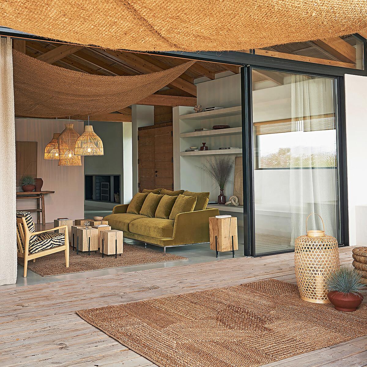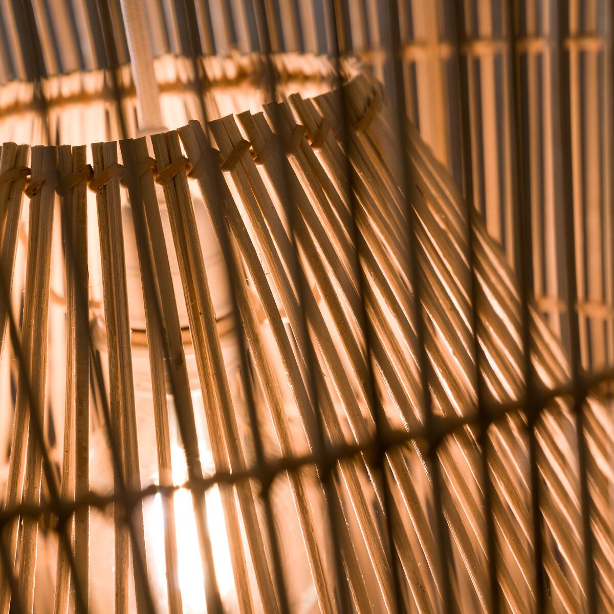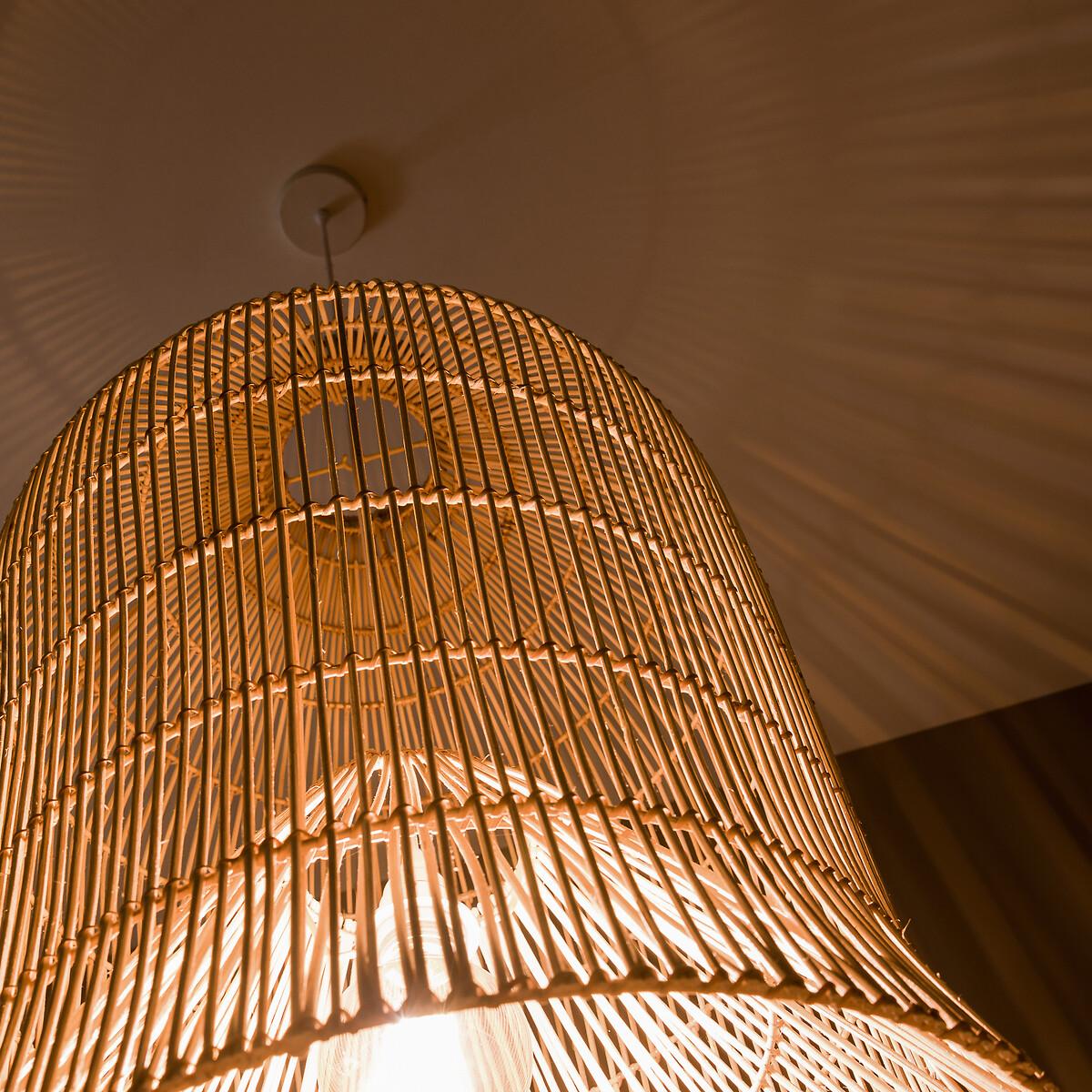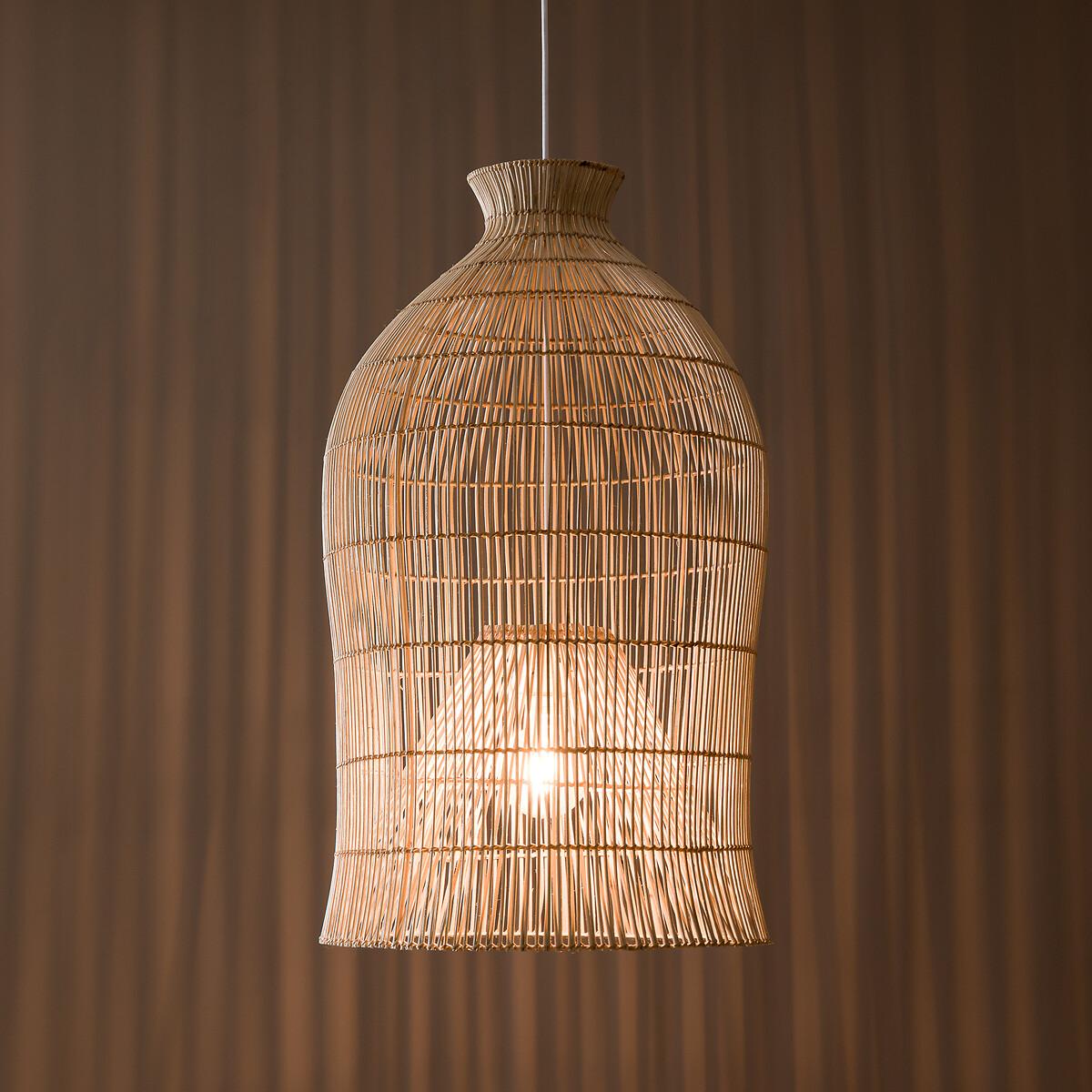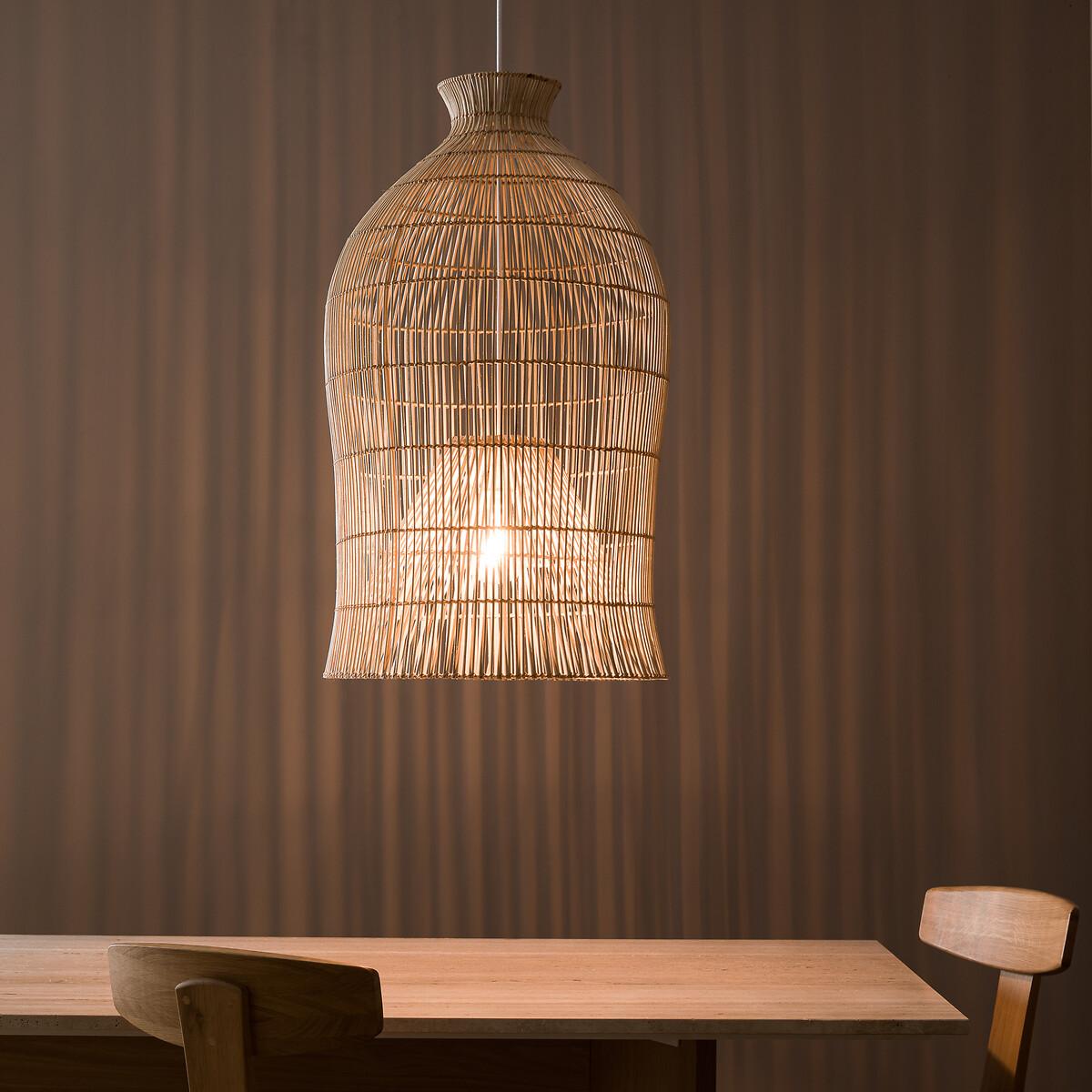 A hand-woven ceiling light, Pengadi takes the shape of the large fishing baskets traditionally used in Indonesia.. This lighting fixture has a generous size. It is composed of a cone and a frame with a soft, rounded silhouette.