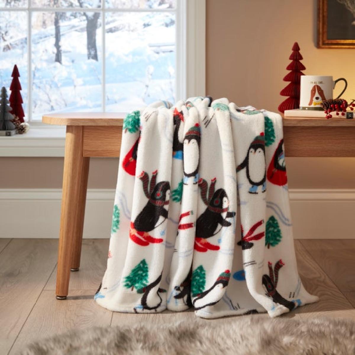 * Soft fleece fabric * Fun penguin print * Great for sofas or beds Bring a cosy touch to the season with this fleece throw, finished with a playful penguin print. Soft to the touch and lightweight, it’s just the thing for curling up on chilly evenings. Whether it’s draped over a sofa or layered on a bed, it adds a bit of festive fun without taking over. Easy to fold away when not in use and just as easy to bring back out again. A snug addition for the colder months.