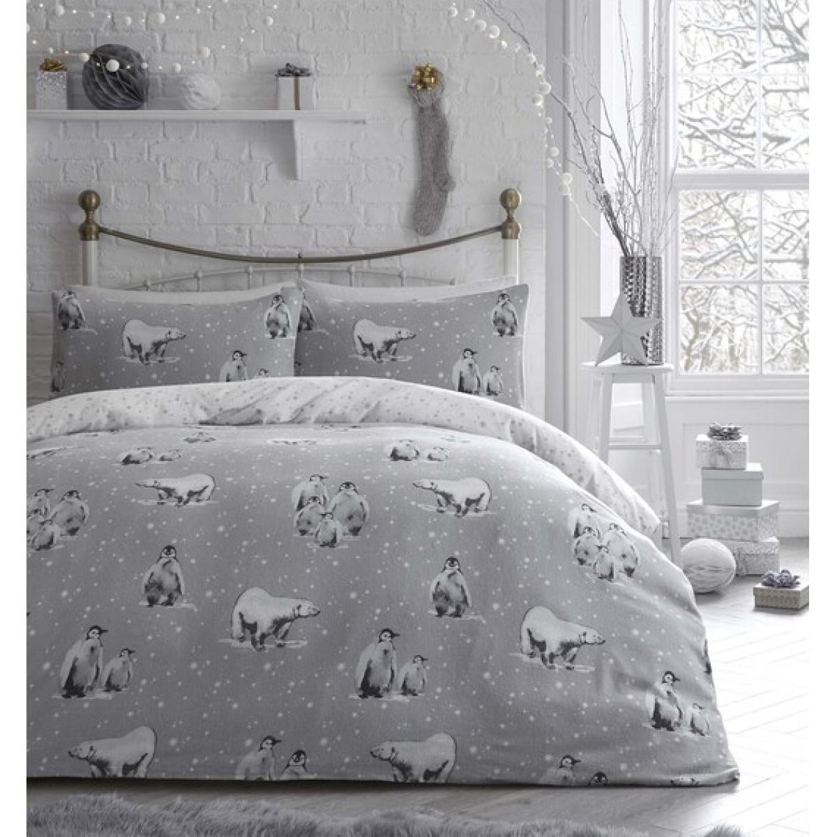 This bedding set offers a charming, cosy vibe with its playful penguin and bear pattern, making it a great choice for creating a fun and inviting atmosphere in a child's room or a cosy guest bedroom. It works particularly well in contemporary interiors with a neutral palette, as the grey tones add subtle texture and soften the overall look. To style it effectively, consider pairing with crisp white or light grey bed linen and minimalist accessories to let the design stand out. For added warmth, layer with textured throws in soft fabrics, and complement the theme with subtle nature-inspired decor, such as snowy or woodland accents, to enhance the wintry, wintry feel.