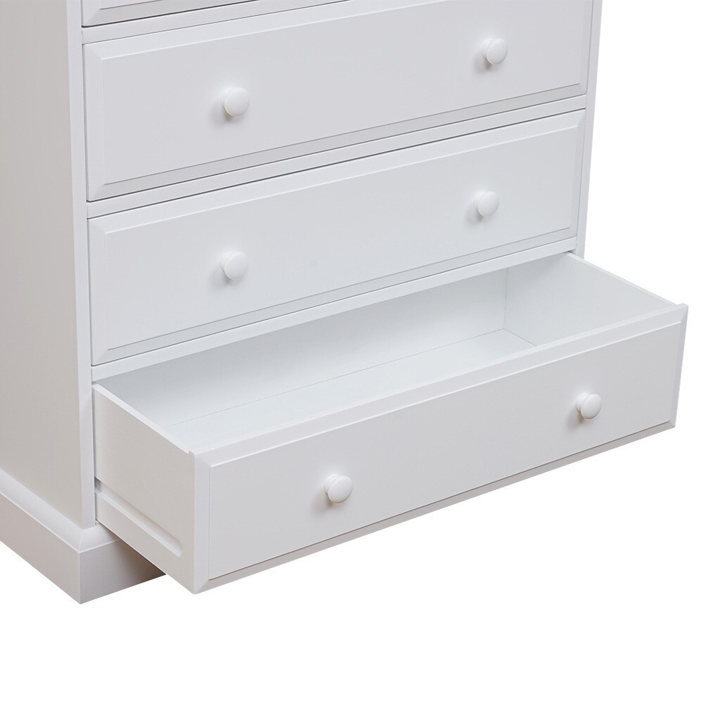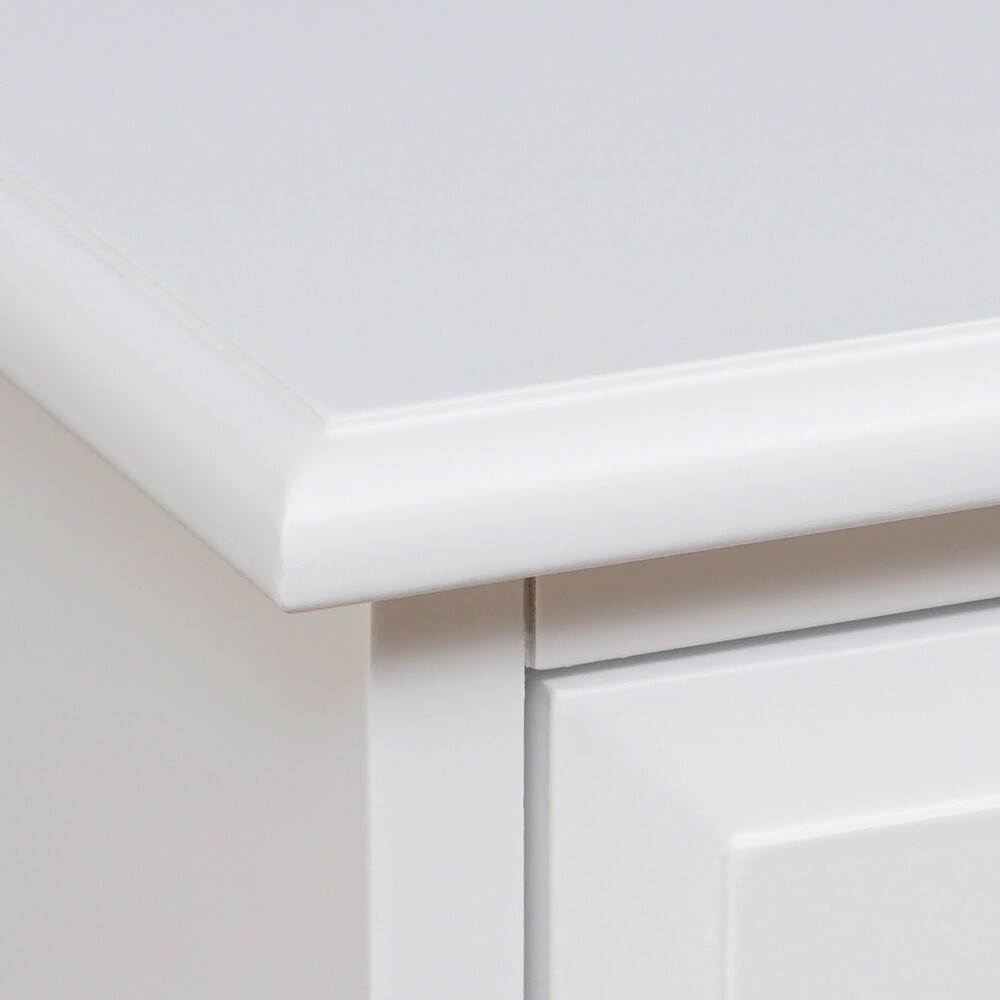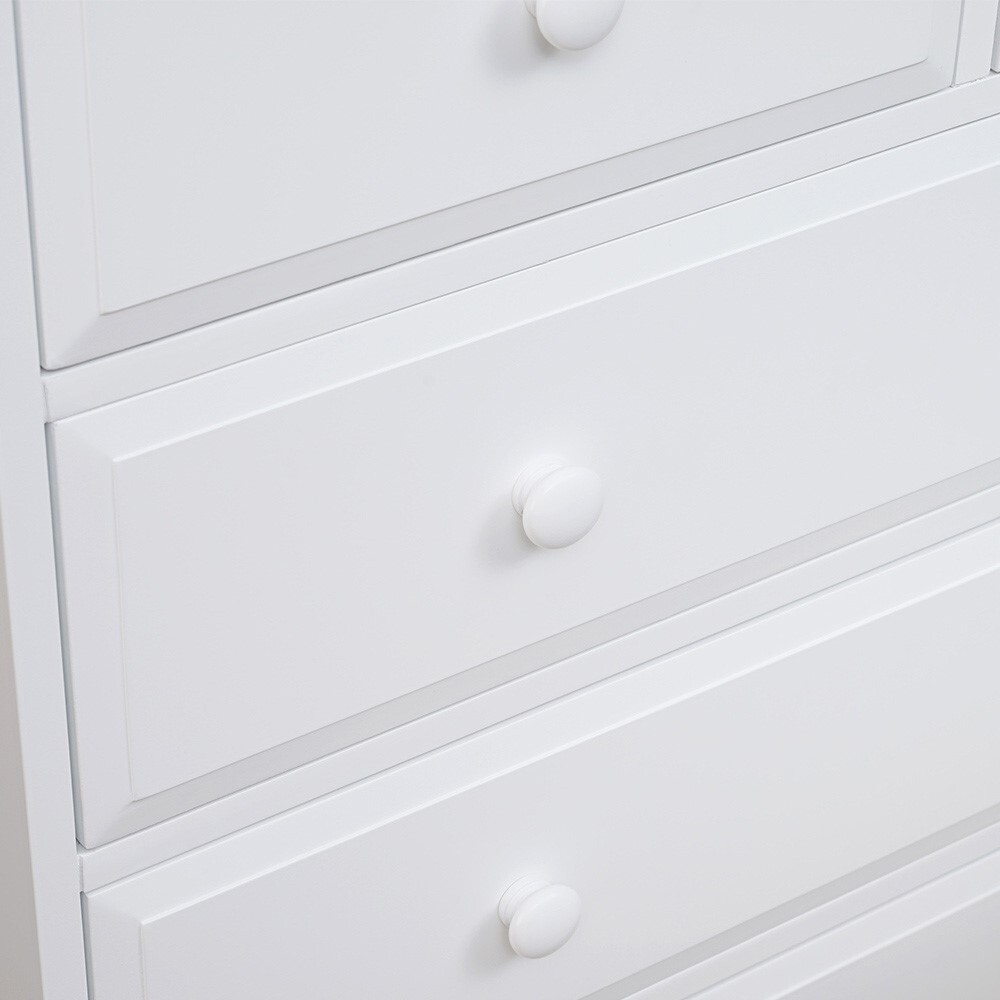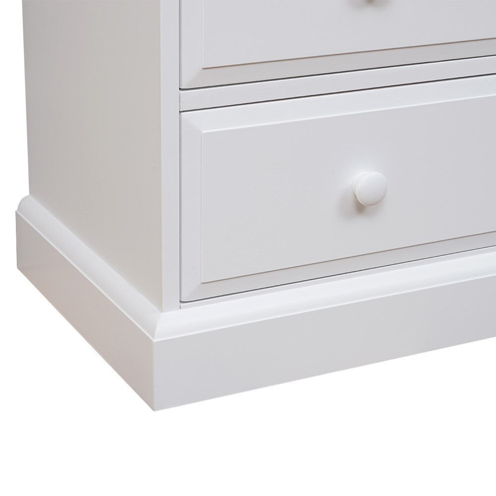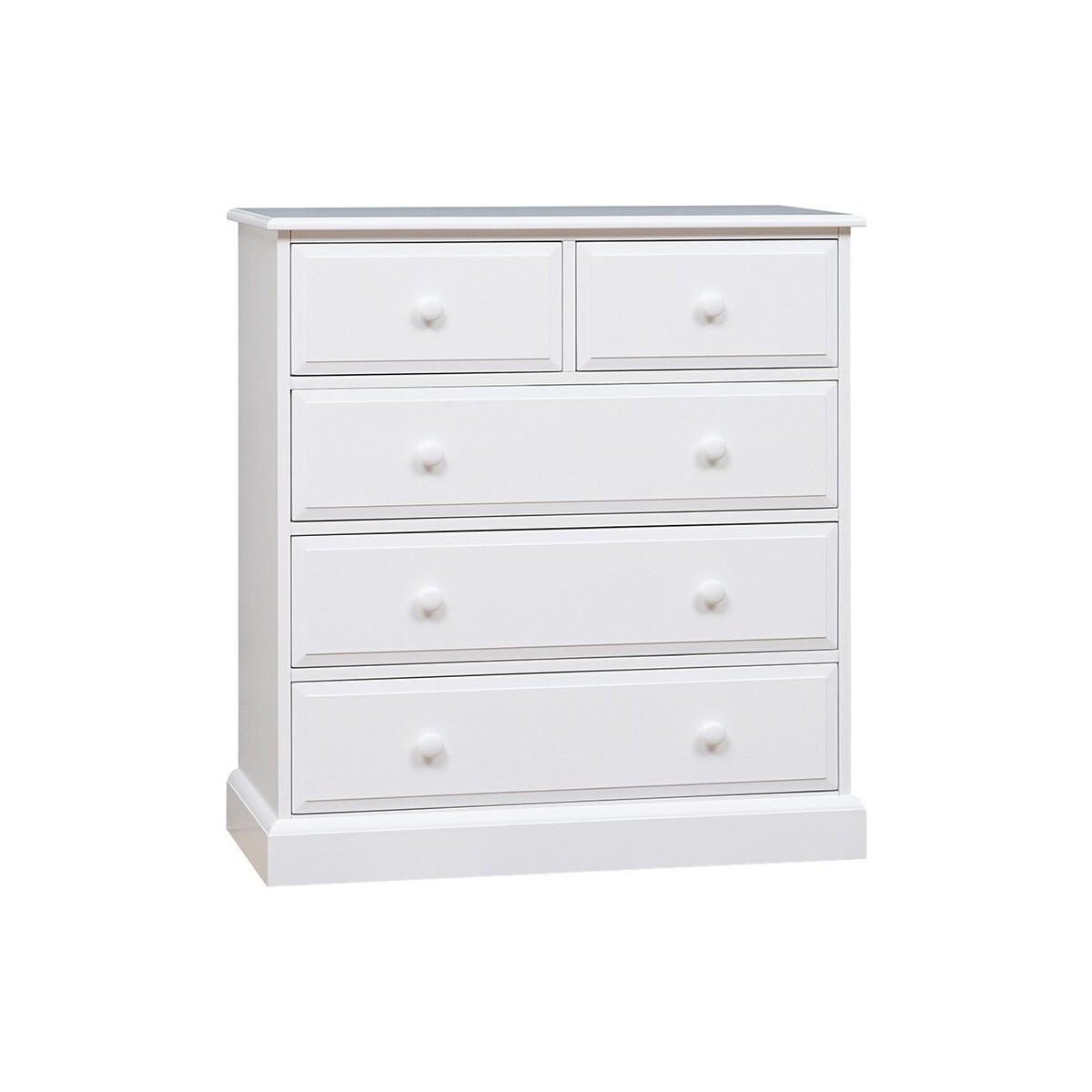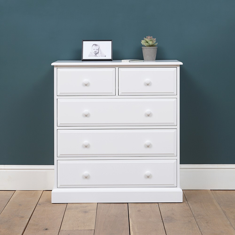 A thoughtful design graces our Pensham White pine chest of drawers. With two smaller drawers on top and three deeper drawers below, the bright white painted finish, coupled with a solid wood frame, is both beautifully timeless and robust, so it'll complement décor schemes both modern or more traditional, for many years to come.