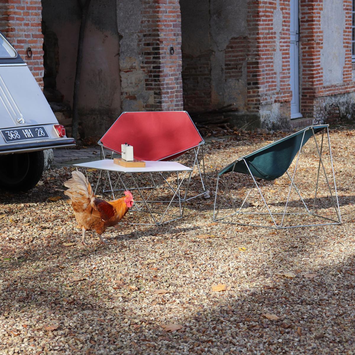La gamme Penta ou comment faire rentrer un salon dans une 2 CV ! À l’origine de ce projet datant de 1970, un pari des designers Jean-Paul Barray et Kim Moltzer : faire entrer dans le coffre d’une 2 CV Citroën quatre fauteuils et une table pour un pique-nique en plein air. Démontable et pliable, la gamme Penta se veut donc nomade, mais s’adapte aussi aux petits espaces intérieurs. Compact, esthétique et confortable, Penta est ainsi capable de passer du salon au jardin.