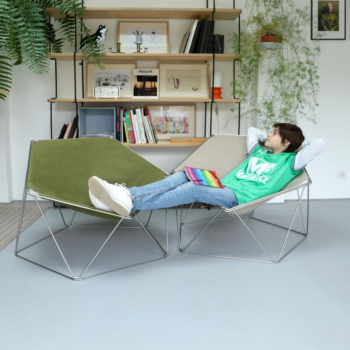 La gamme Penta ou comment faire rentrer un salon dans une 2 CV ! À l’origine de ce projet datant de 1970, un pari des designers Jean-Paul Barray et Kim Moltzer : faire entrer dans le coffre d’une 2 CV Citroën quatre fauteuils et une table pour un pique-nique en plein air. Démontable et pliable, la gamme Penta se veut donc nomade, mais s’adapte aussi aux petits espaces intérieurs. Compact, esthétique et confortable, Penta est ainsi capable de passer du salon au jardin.