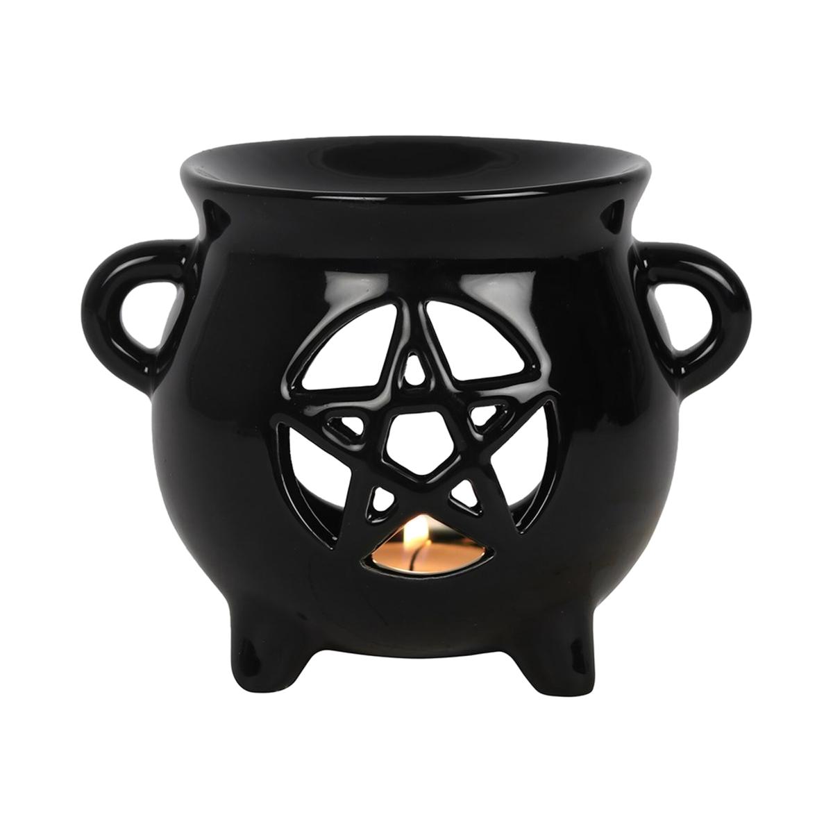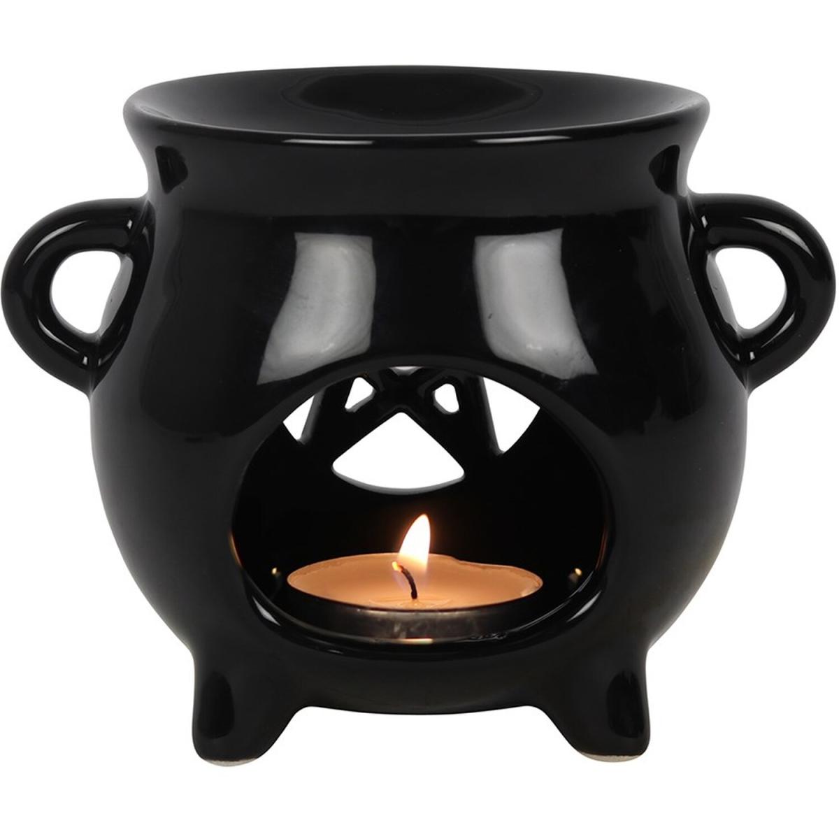 This cauldron burner can be used for both oil and wax. Cut our pentagram shape, made from ceramic. Shiny black finish. Use standard tealight candles.
