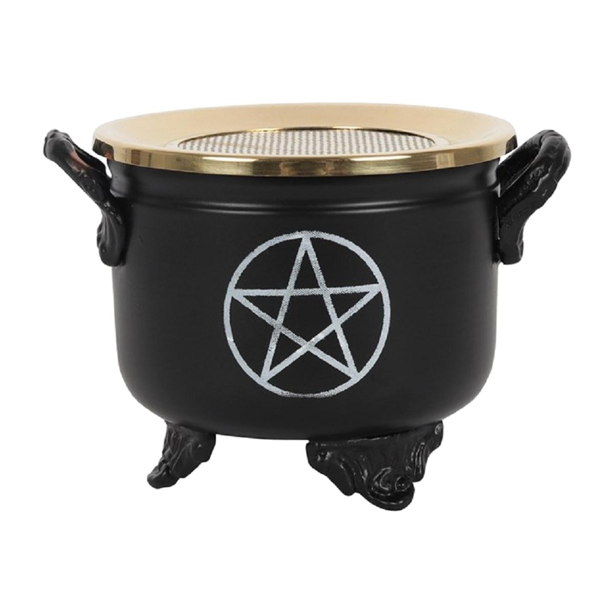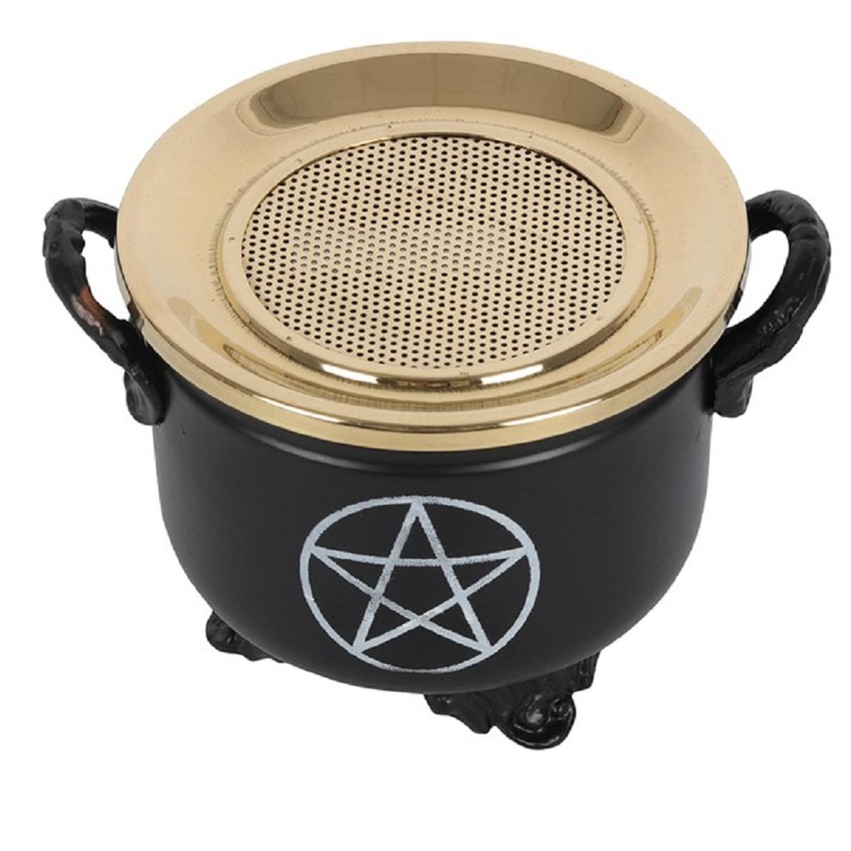 A lightweight metal cauldron to be used for burning resin incense granules by placing a hot charcoal disc inside. Features a white pentagram design and a grated brass tray for placing resin and herbs. Copper with a matte black finish. For fragrance use only. Never burn incense directly on flammable surfaces.