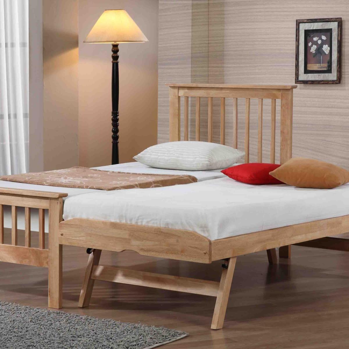The Pentre guest bed is a hardwood bed frame in a traditional Shaker Style featuring a vertically slatted headboard. The pull out trundle stores neatly away underneath the bed frame when not in use. Maximum mattress for the guest bed-16cm Trundle dimensionsL-195cmW-91cm. Main bed dimensionsL-207cmW-97cm. Headboard H-106cm Footboard H-58cm