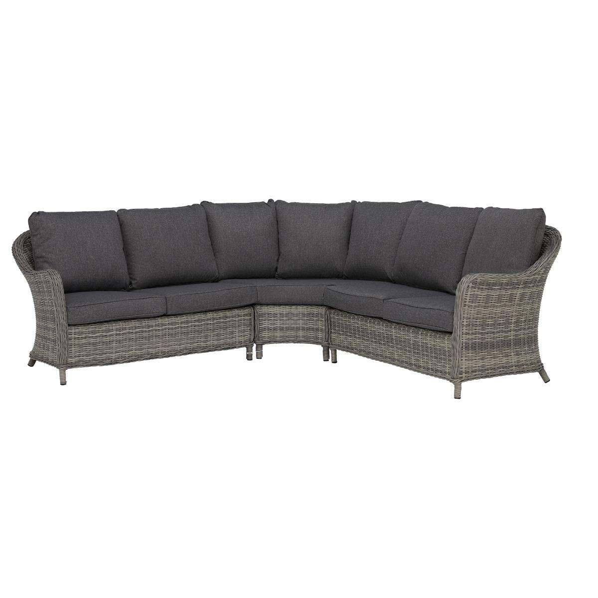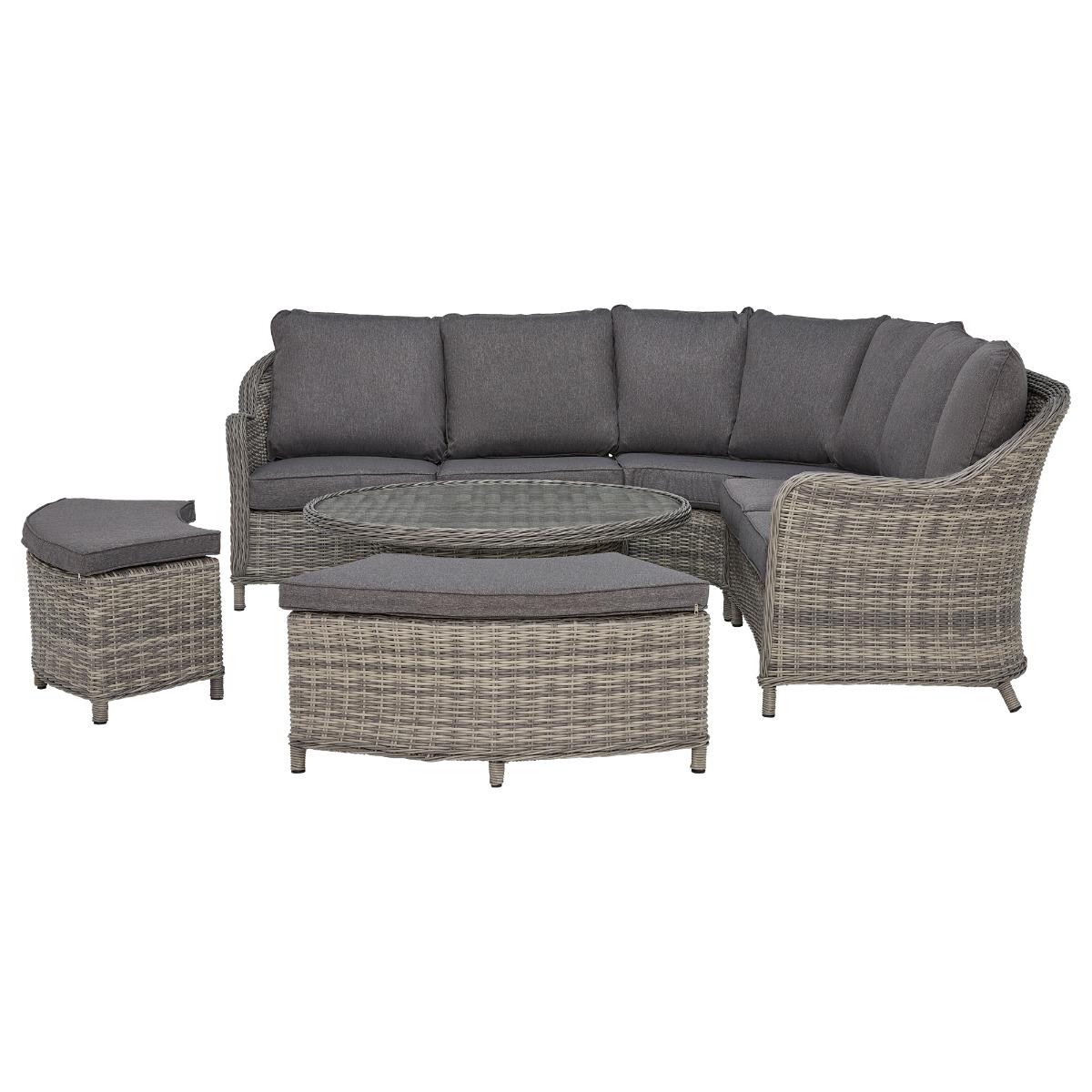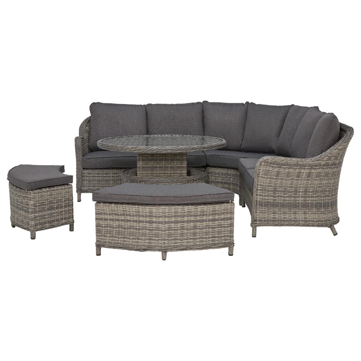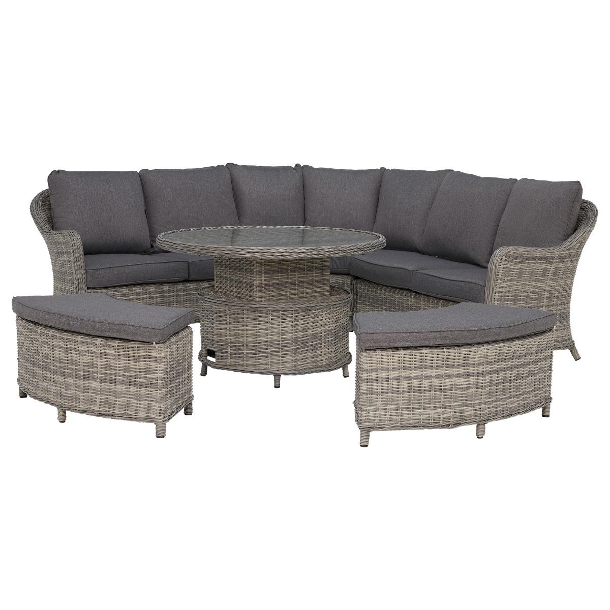 If you would like to spruce up your outdoor living space yet provide great comfort for guests, the timeless classic Penzance Rounded Corner Sofa with Rising Table, Grey is the perfect addition for you. Transform from the beautiful lounging set to a dining set instantly by heightening the rising table. The Penzance Rounded Corner Sofa with Rising Table, Grey features grey tones in both the rattan and the cushion fabric that can also be adapted for the perfect seating combination for your guests. A fantastic set to enjoy entertaining and relaxing from daytime to the evening on a warm summer's day!