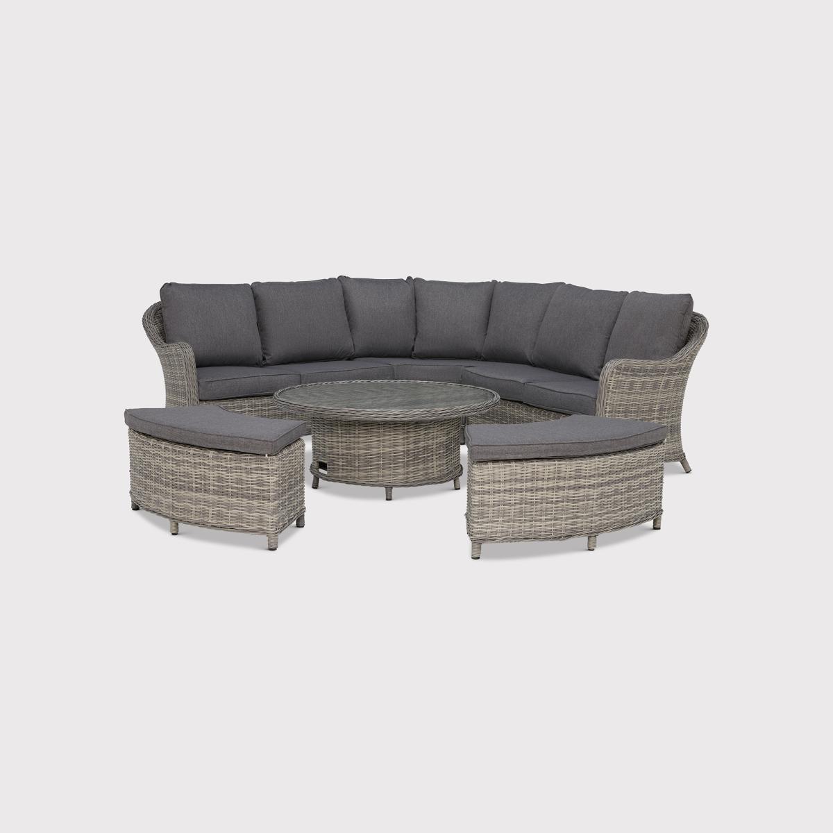I love this set for its versatile design and practical features. The rounded corner sofa with rising table offers a relaxed, sociable feel, making it perfect for outdoor entertaining while maintaining a stylish, contemporary look. Its neutral grey palette means it works well in both modern and more traditional garden settings. When styling, consider pairing it with cushions in complementary colours or patterns to add some personality and comfort. The rising table is especially handy for casual meals or drinks, so positioning it near a shaded area or against a backdrop of greenery can enhance its appeal. It’s a practical yet elegant choice that suits space-conscious outdoor spaces or larger gardens looking for a chic focal point.