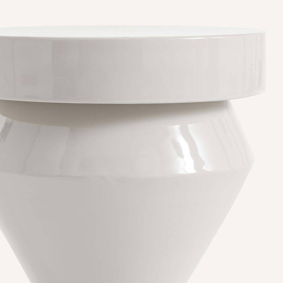 I love this side table for its sculptural, modern shape and glossy finish, which makes it a versatile addition to various interiors. It works particularly well in contemporary, minimalist, or even eclectic schemes where a statement piece is needed. Its clean lines and neutral colour mean it can be styled with a variety of colour palettes and accessories. Practical styling tips include using it as a bedside table for a sleek, uncluttered look or pairing it with a low plant or a decorative tray to create a curated surface. Its sturdy top also makes it ideal for holding a lamp, books, or decorative objects without feeling overstated.