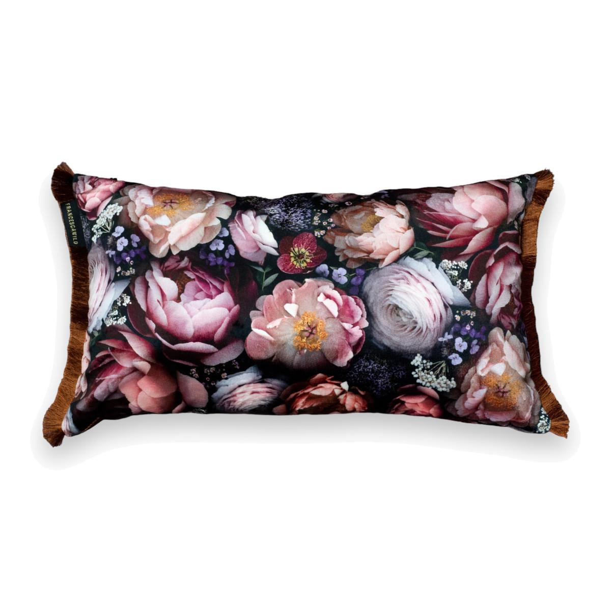This beautiful Peony maximalist cushion cover is inspired by secret English country gardens. This cover is printed on an opulent shimmer velvet, with complementary rust silky trim, rust reverse and black concealed zip. Spot Clean Only Black Concealed Zip- Rust Silky Trim