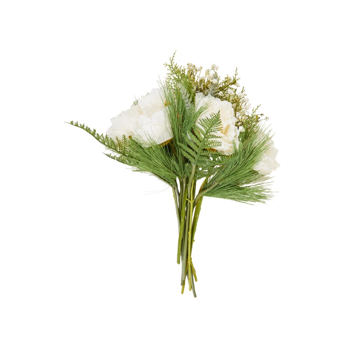 This sprig of peony, gypsophilia, and fir makes for a versatile and elegant addition to various interiors. I love how its neutral white palette ensures it complements both modern and traditional spaces without overwhelming the decor. It’s great for bringing a touch of softness to a coffee table, sideboard, or even a bathroom shelf. Practical styling tips include using it in a simple vase for understated sophistication or grouping multiple bunches for a fuller, more impactful display. Its evergreen vibe also makes it suitable year-round, especially in minimalist, Scandinavian, or even rustic interiors where natural textures are key. Plus, being artificial, it requires no watering or upkeep, offering long-lasting beauty without the fuss.