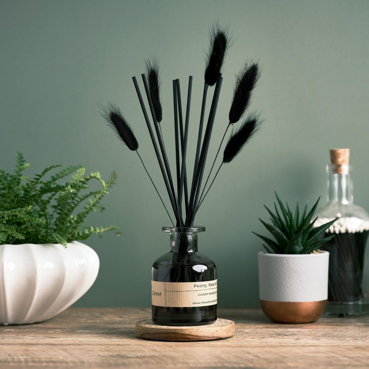 The Peony, Rose and Oud Reed Diffuser will fill your space with a warm and deep floral fragrance of damask rose, oud wood and a hint of peony. The gentle scent amplifies cosy and calm vibes, helping you to focus, breathe, and be present in the moment. The fragrance is slowly released via the sustainably sourced reeds and bunny tails, which sit inside the black glass bottle holding 120ml of premium fragrance oils. The Peony, Rose and Oud Reed Diffuser is a gorgeous piece of home decor that adds beauty both in sight and in scent.