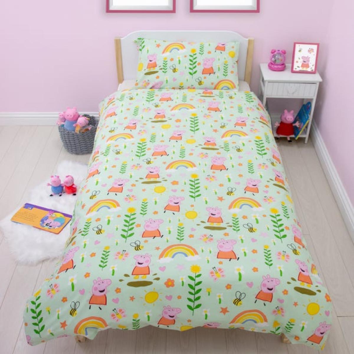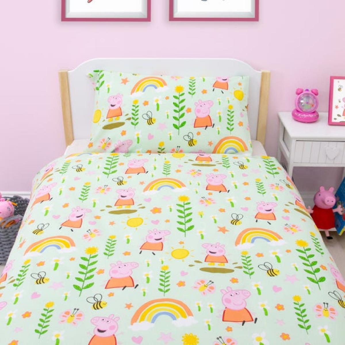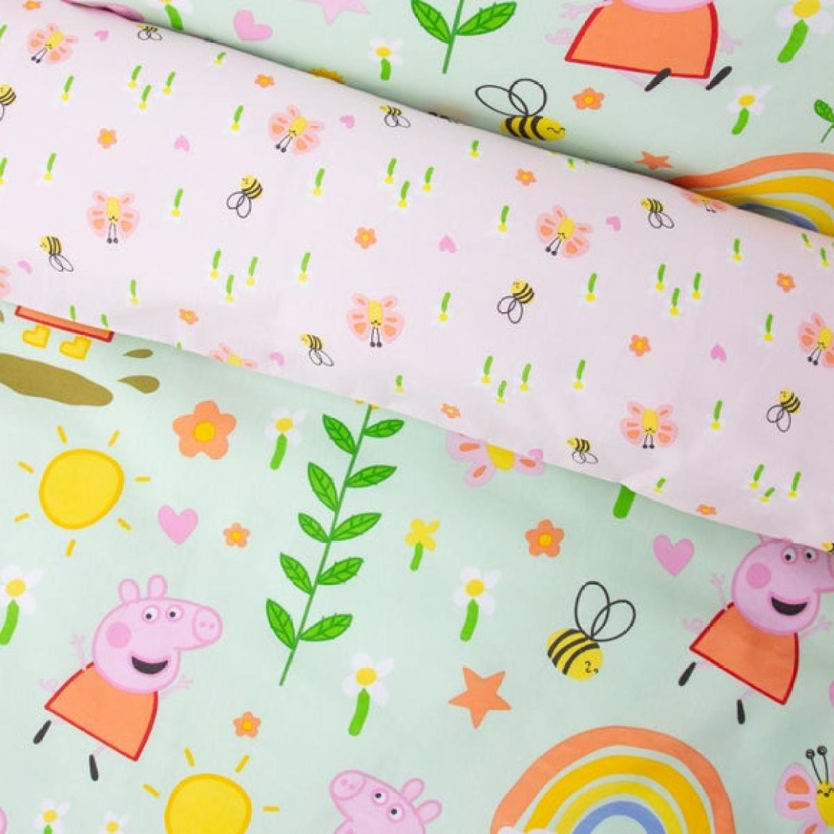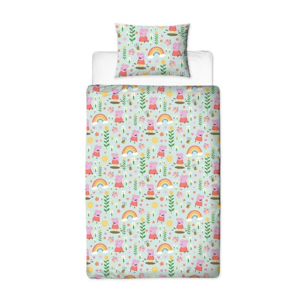 * Charming Peppa Pig design * Popper fastening * Super soft material Enjoy the joy of muddy puddles while stay warm and cosy in this charming Peppa Pig Quilt Cover and Pillowcase Set. Perfect for toddlers and young children, it features Peppa splashing in puddles alongside bees, rainbows and flowers on a cheerful green background. Flip it over for a softer look with butterflies and blooms on a pretty pink. Made from a soft polycotton blend, it's gentle on young skin and easy to care for. Popper fastenings make changing quick and fuss-free, and it's machine washable and tumble dryer safe at low temperatures. A lovely gift for little Peppa fans, available in junior single and double sizes.