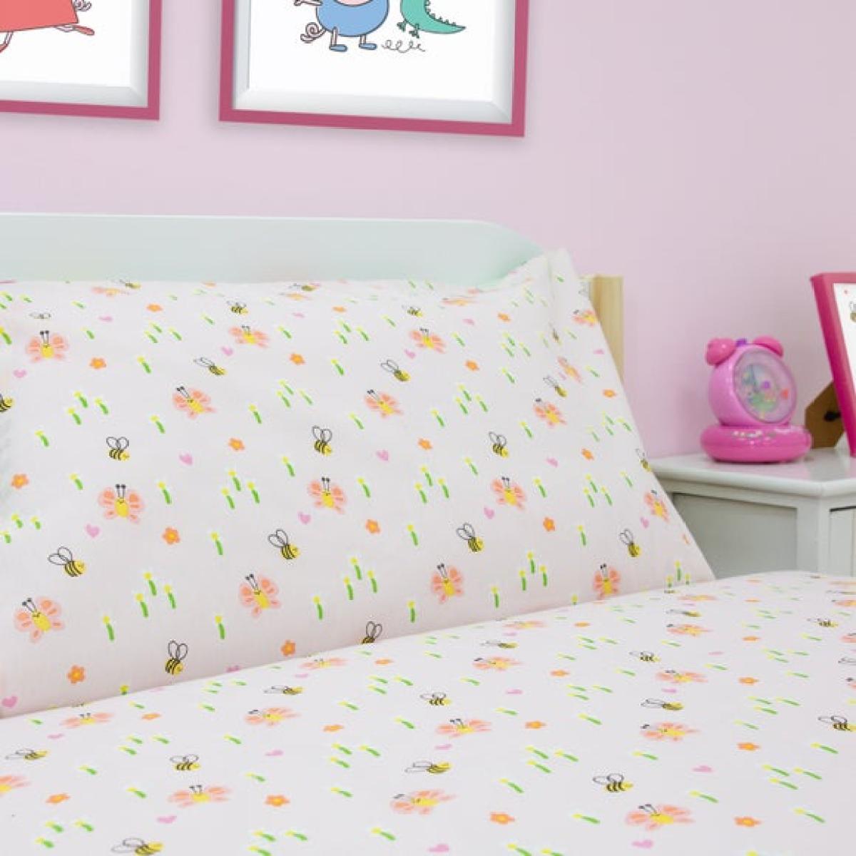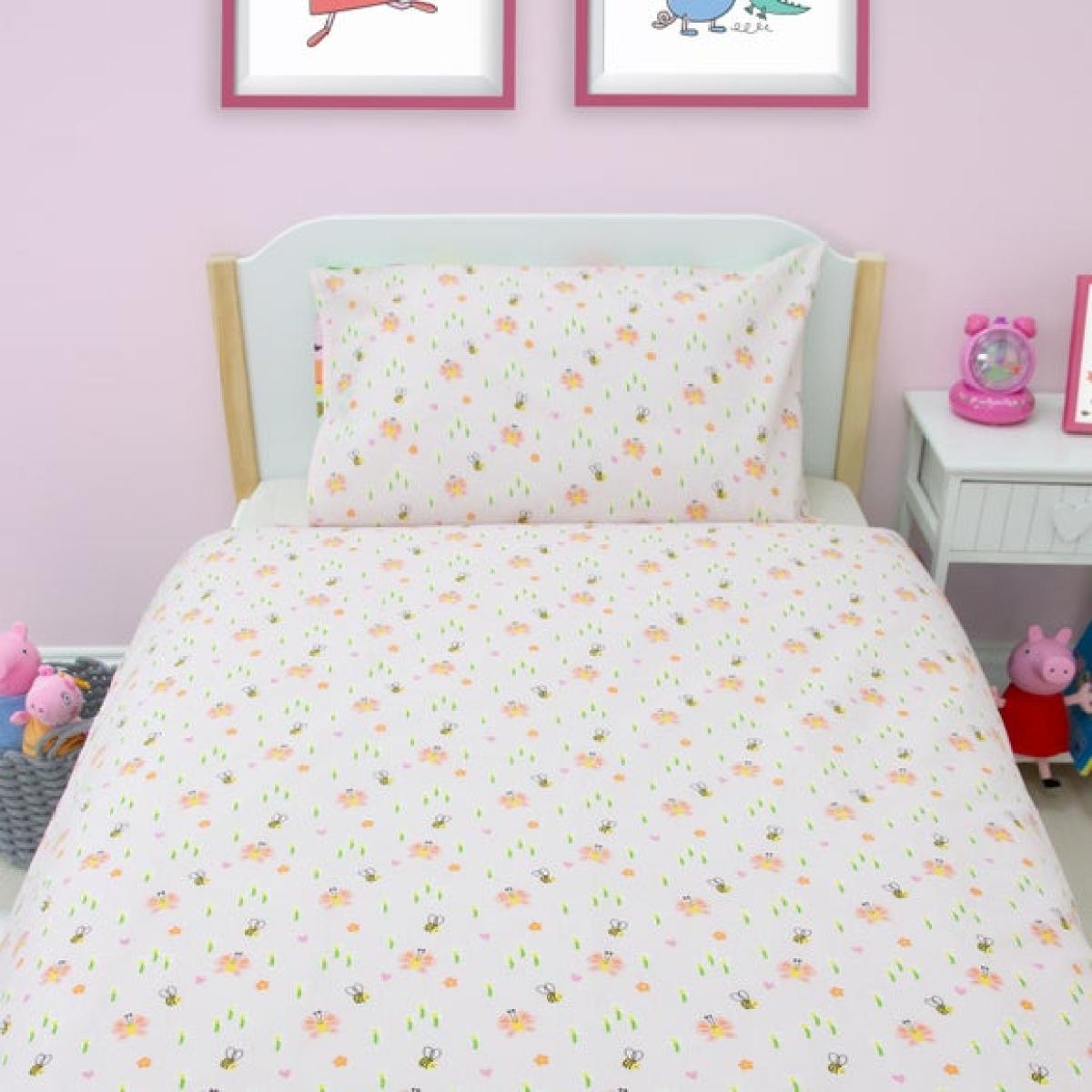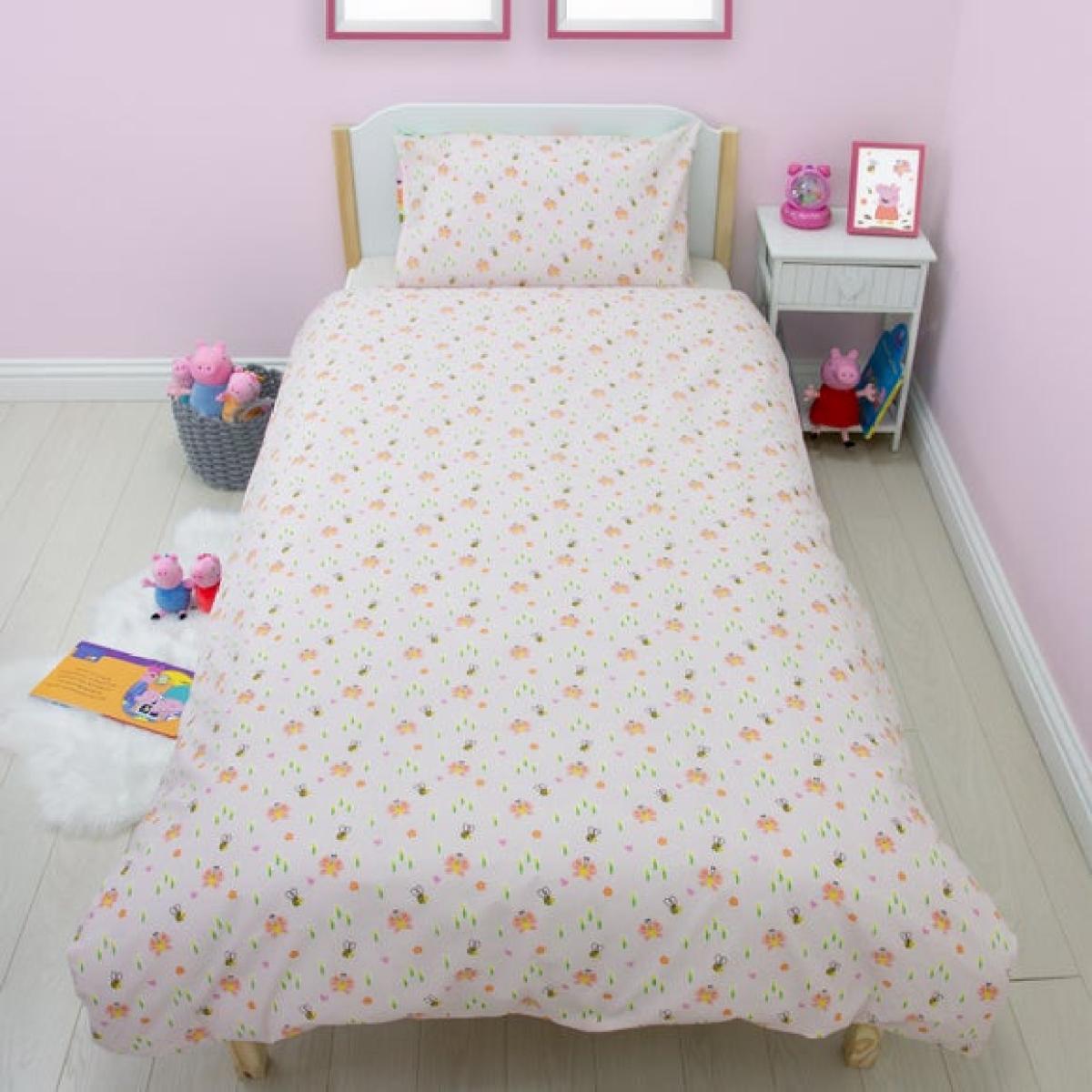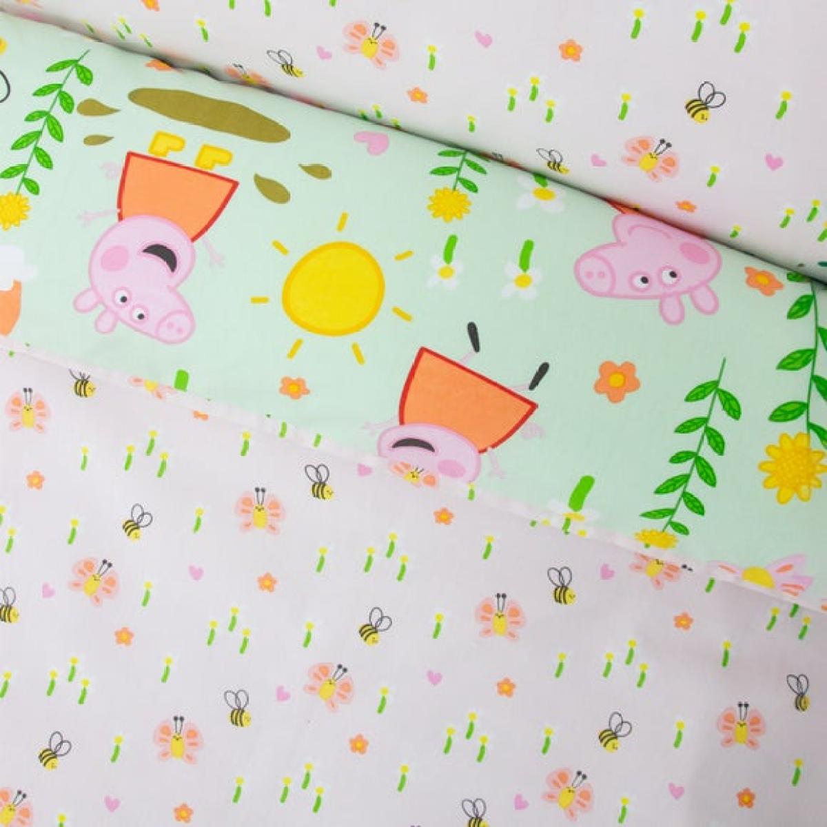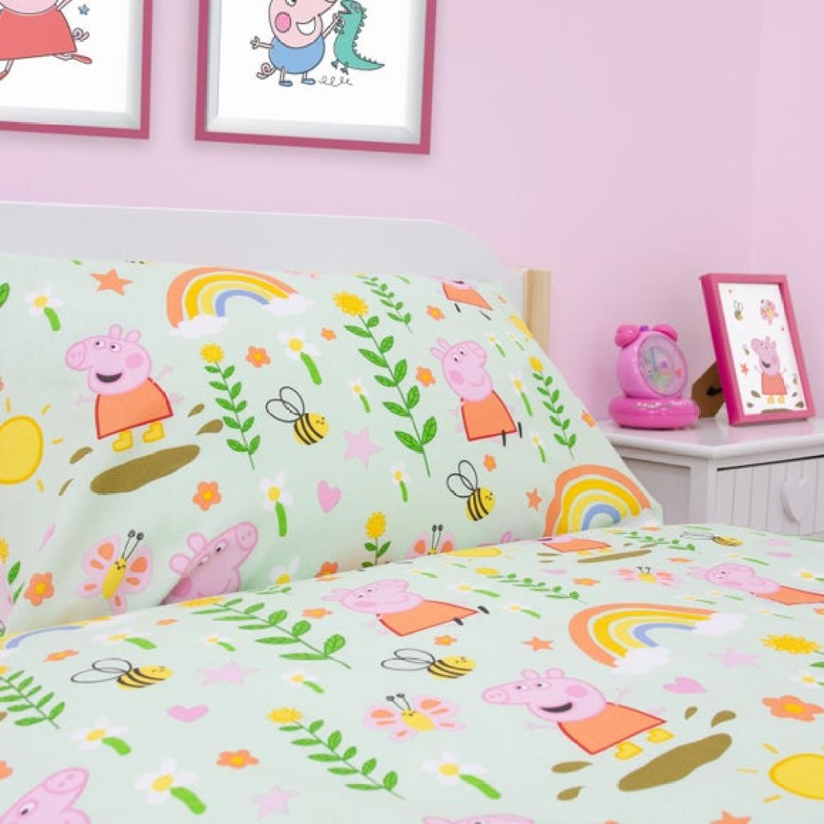 * Charming Peppa Pig design * Popper fastening * Super soft material Enjoy the joy of muddy puddles while stay warm and cosy in this charming Peppa Pig Quilt Cover and Pillowcase Set. Perfect for toddlers and young children, it features Peppa splashing in puddles alongside bees, rainbows and flowers on a cheerful green background. Flip it over for a softer look with butterflies and blooms on a pretty pink. Made from a soft polycotton blend, it's gentle on young skin and easy to care for. Popper fastenings make changing quick and fuss-free, and it's machine washable and tumble dryer safe at low temperatures. A lovely gift for little Peppa fans, available in junior single and double sizes.