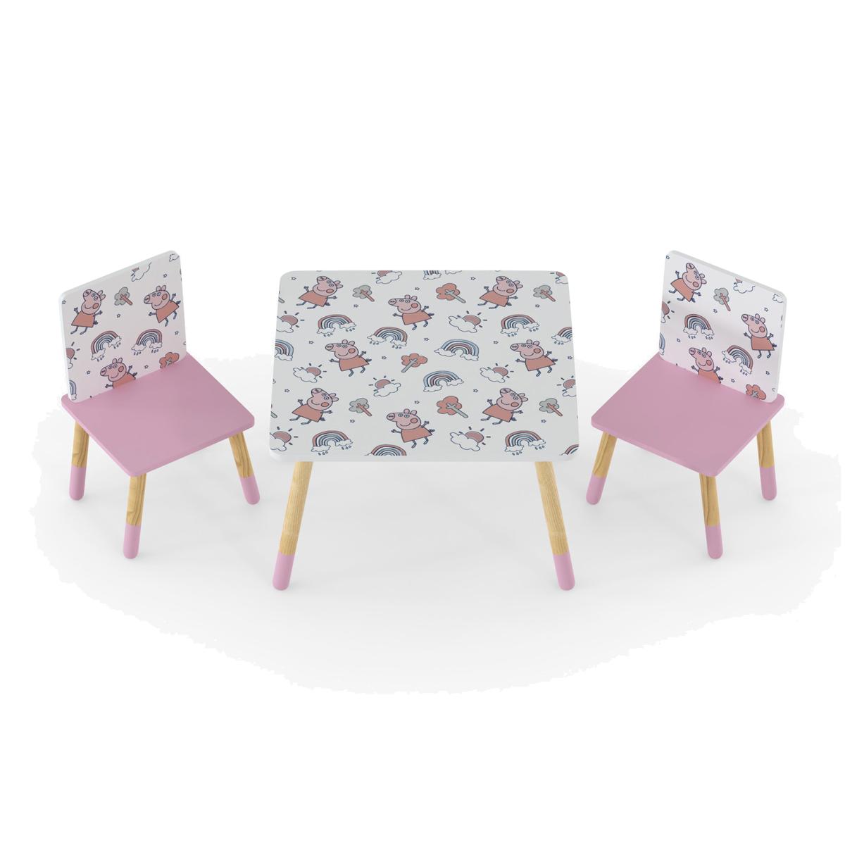 The Peppa Pig Table and 2 Chairs is for kids' that love to play, read or draw. Featuring high quality digitally printed graphics of your favourite character, Peppa with a scattered design on table top and chair backs, ideal for a kids bedroom, playroom, or wherever your child wants to play. Very easy to assemble, the legs simply screw into the brackets pre-fixed beneath the table top and seat bases. Made using FSC material.18 months age range.